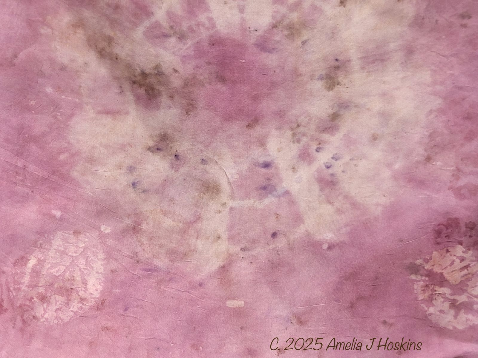 This piece was tided with cord in places to produce the circular fan resist effect. It was also bundle dyed with some purple flowers (Linaria) which only came out in spots.