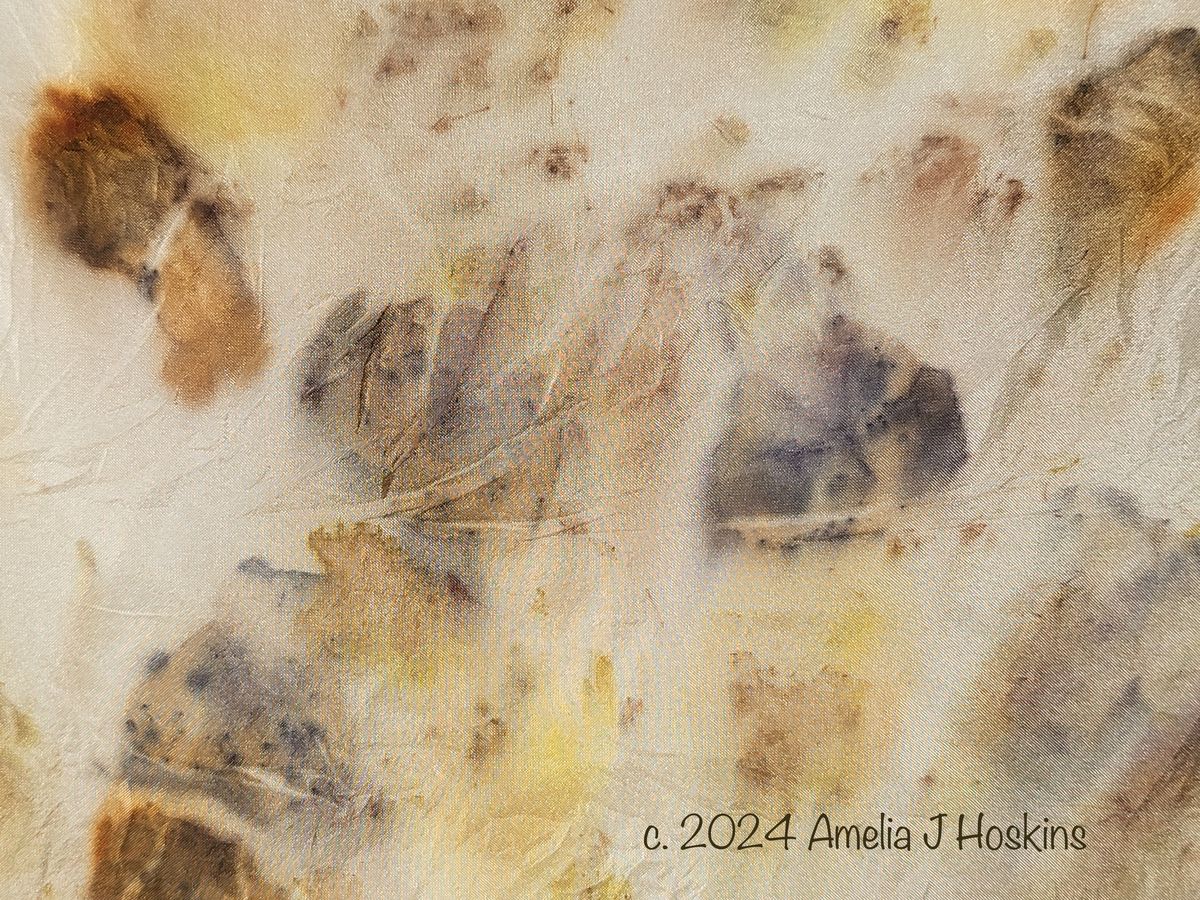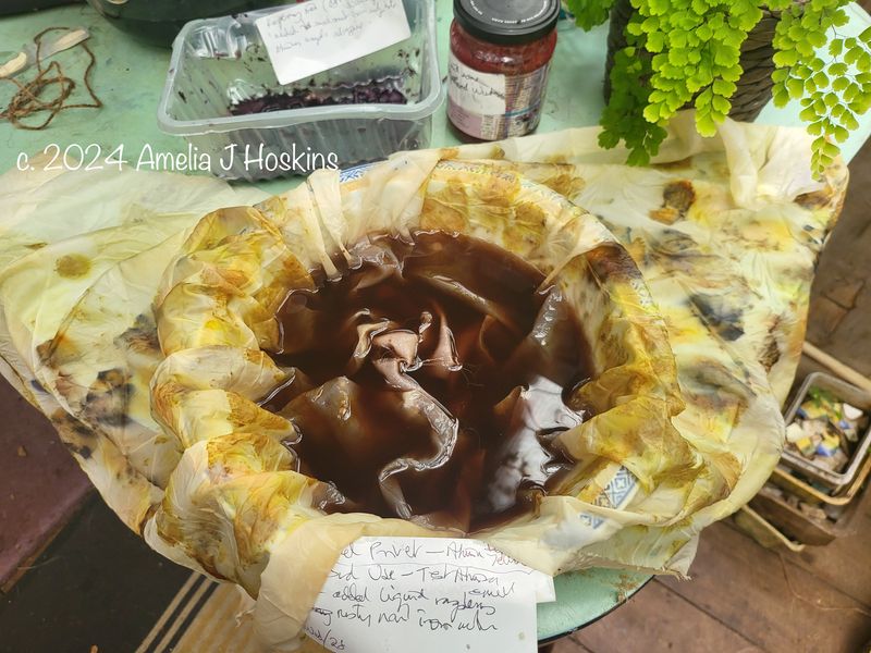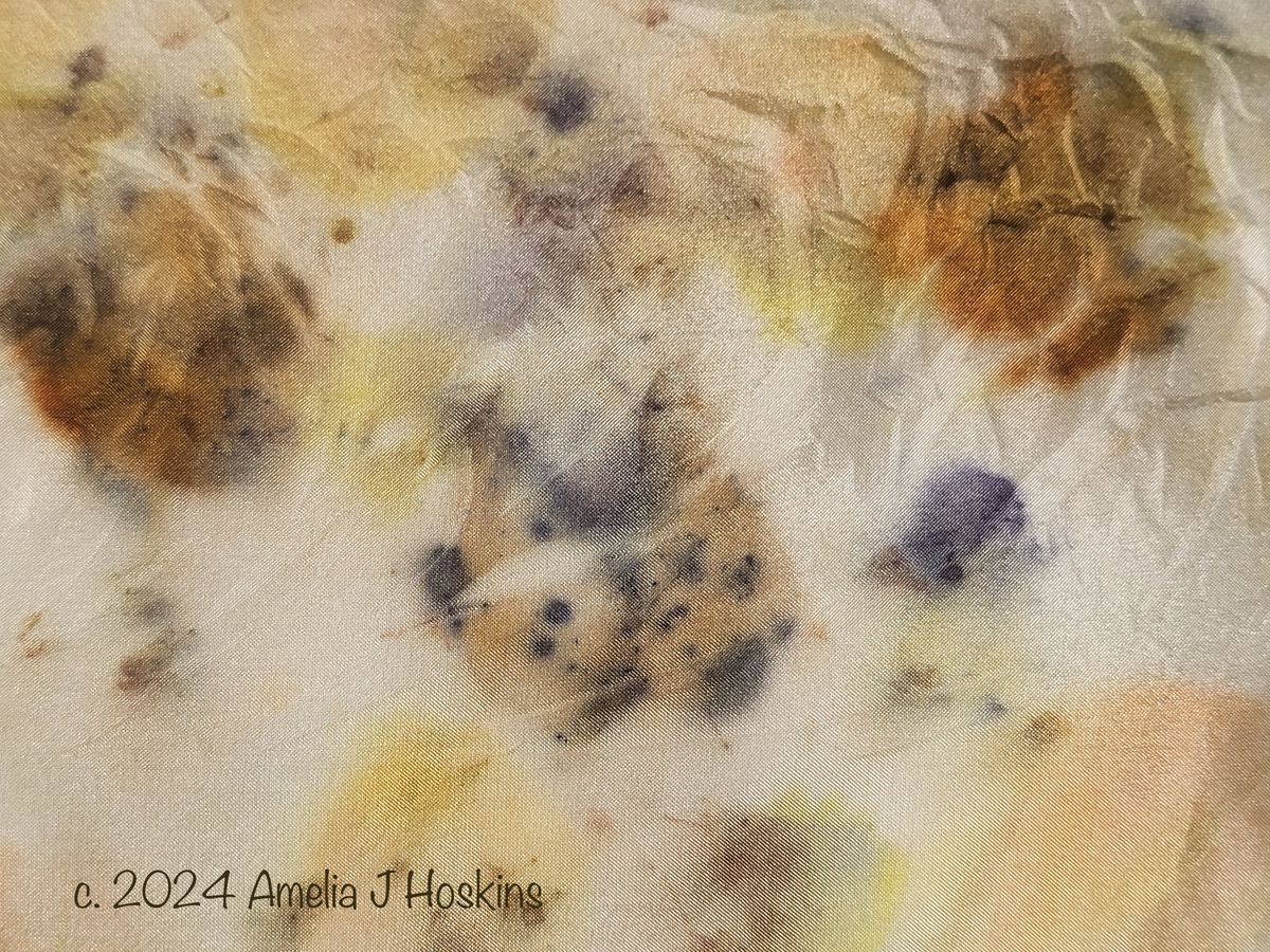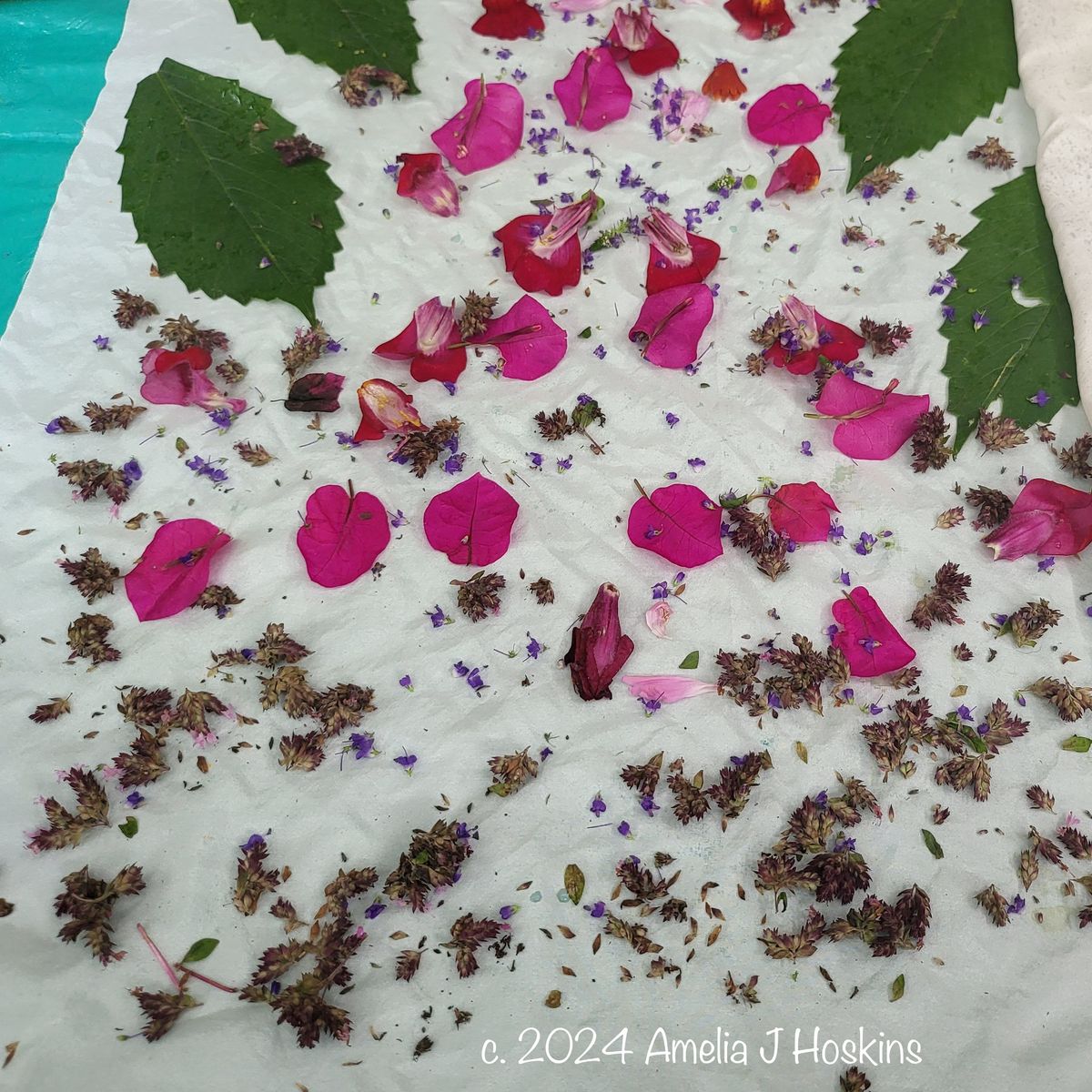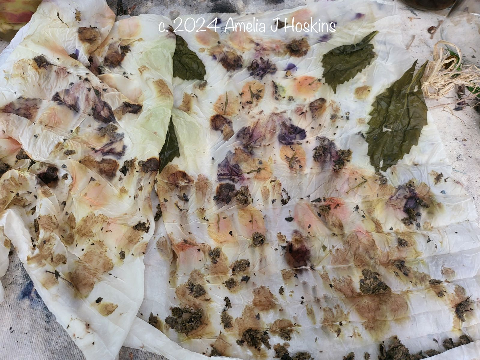 Cerise bougainvillea created 'day-glo' orange. Dahlia leaves create pale green. Marjoram dried flowers only brown. Antirrhinums violet until modified to navy. Result was too yellow, so soaked peice in bowl with previously used weakened rusty nail water (iron) and raspberry juice to dull off; just enough.