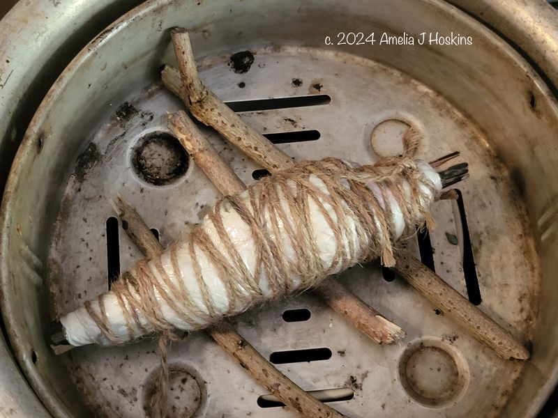 Interesting result with orange from bougainvillea. Navy from crimson antirrhinums. Folded carefully into strip then wrapped around stick and steamed on trivet. Closed pan. Clingfilm barrier helps highlight single petals, without over bleeding. Possibly 1hr steamed (no note made); probably too long, causing dulling and blurring, especially brown of majoram.