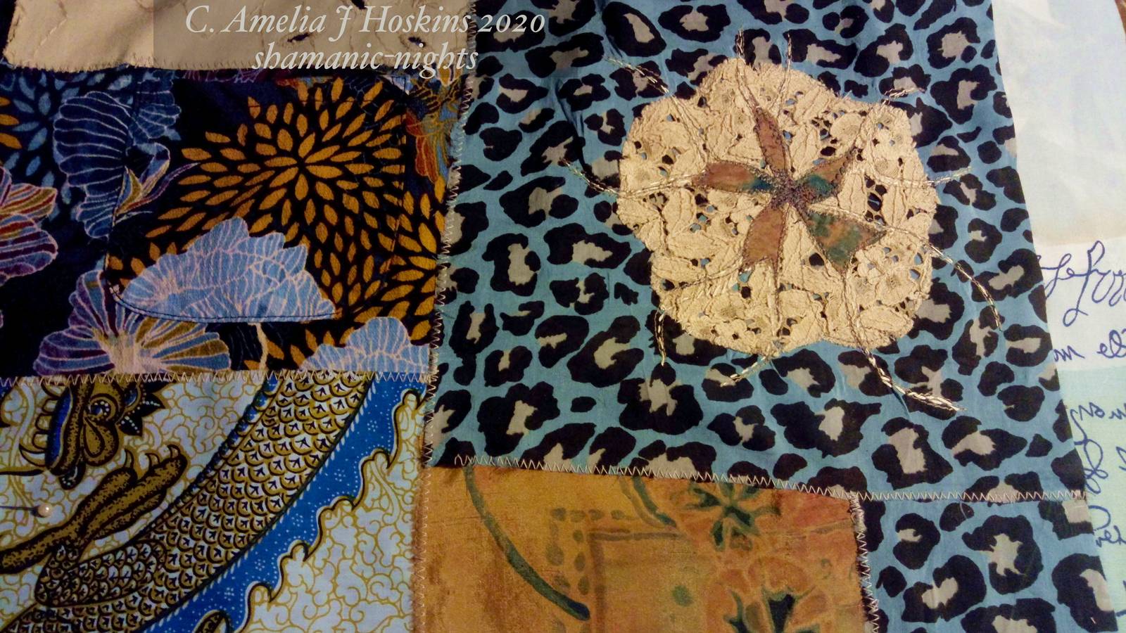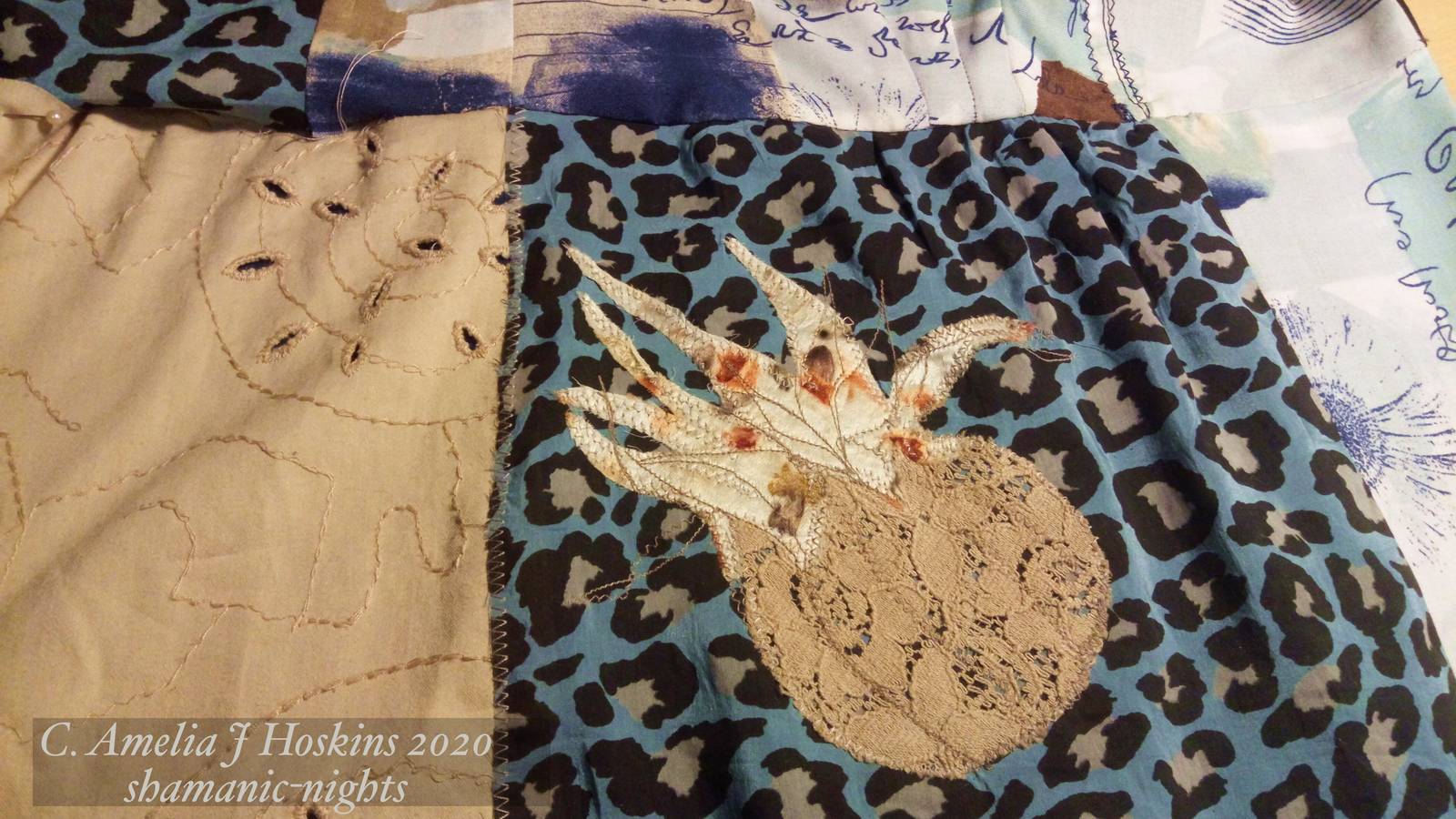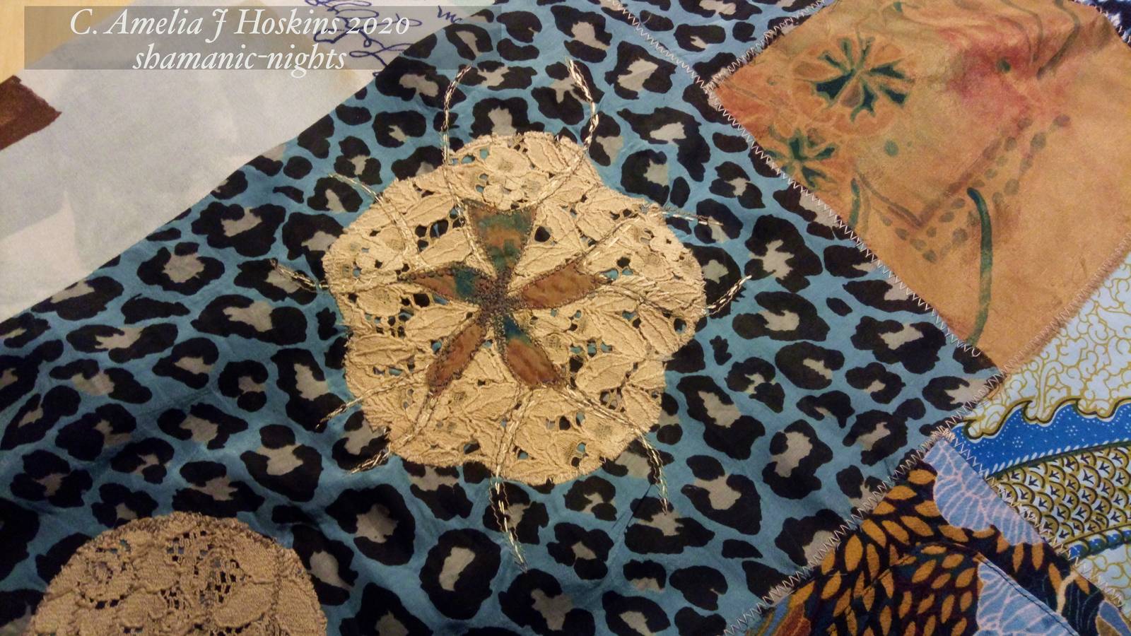 APPLIQUE DECORATION:  Nigella Seed pod designs from my drawings of dried seed pods in my vegetable garden:  see seed photos on photography site resonant-visions Beige lace has a similarity to the thin casings of the pods as they break down.