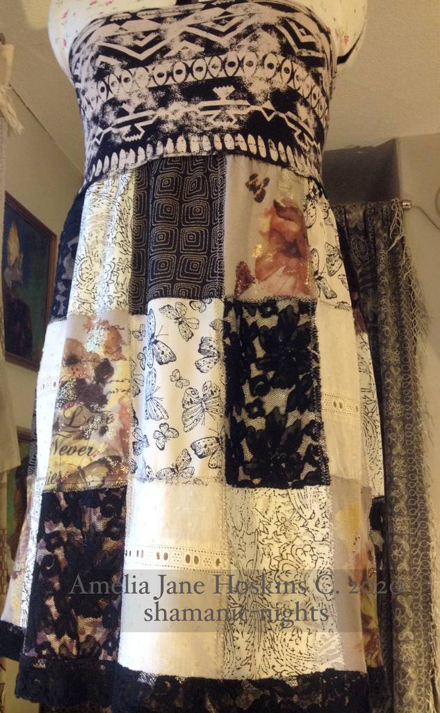 Unique dress Abalone Diamonds  Size 36-42 inch bust.  Loose fit enables bust fit.  Shoulder to front hem 30.5 inches.    Hem circumference 80 inches