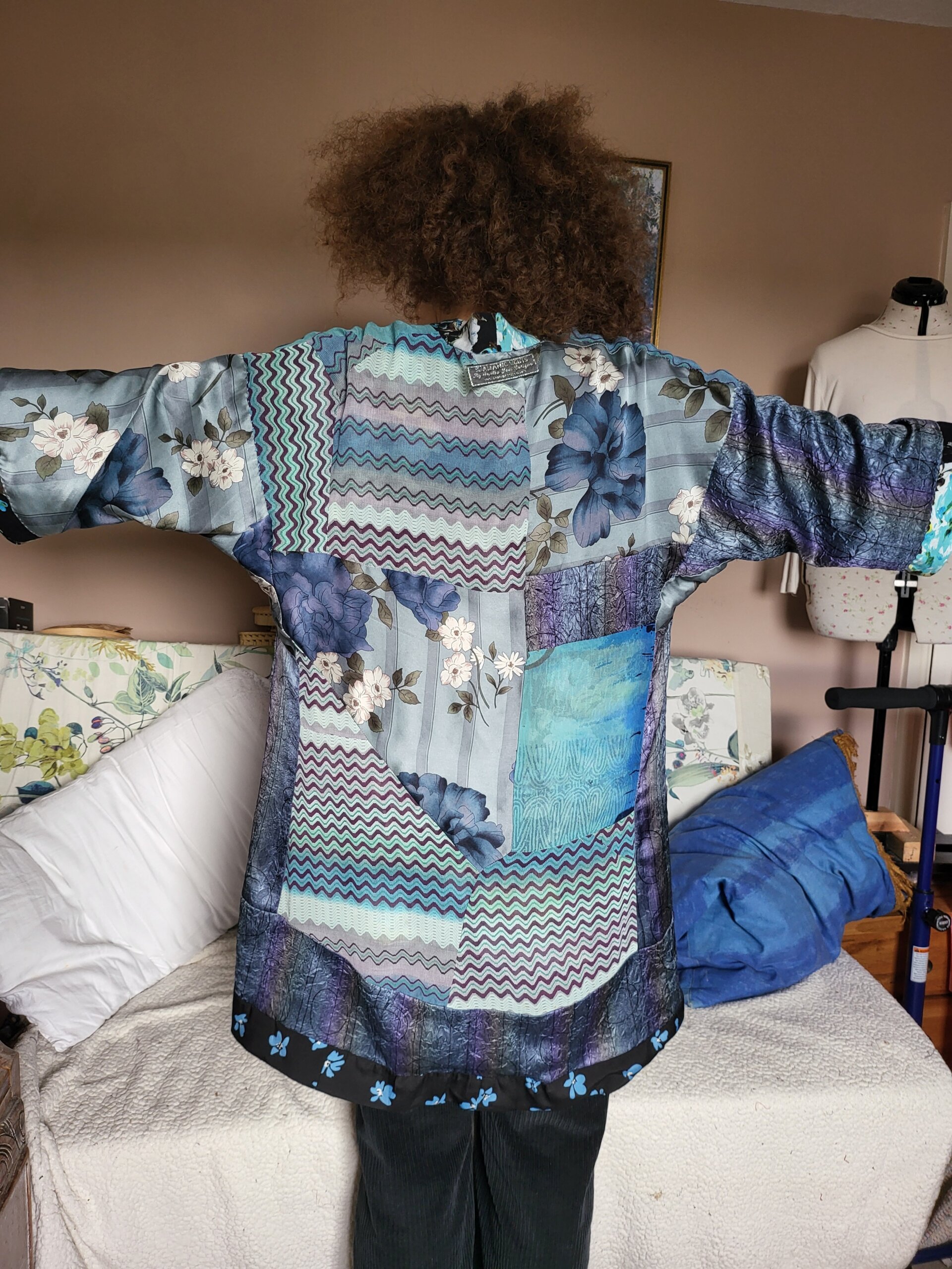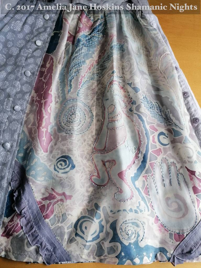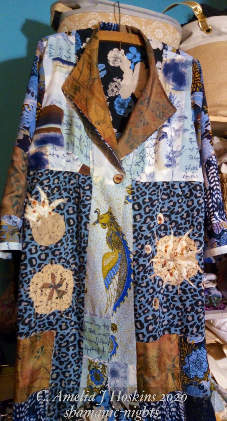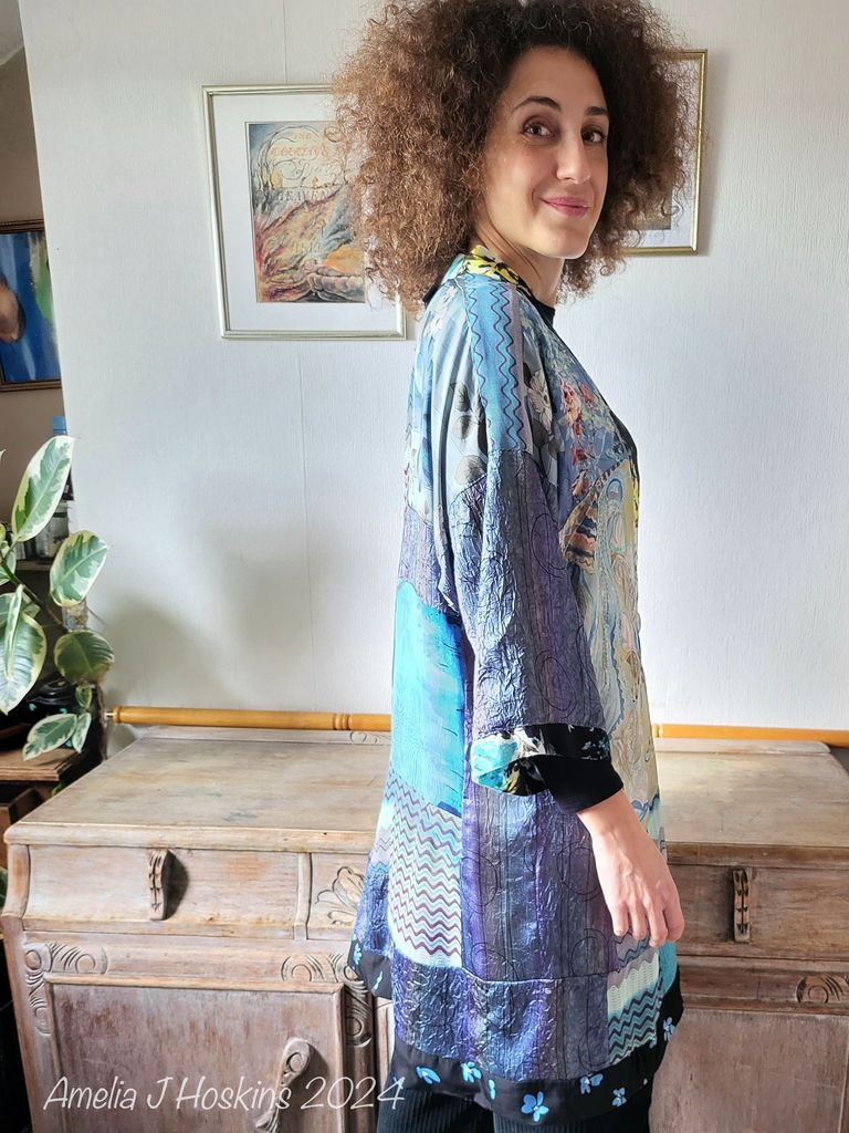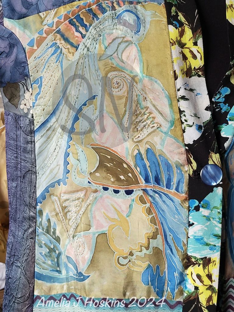 SILK PAINTING :  Front middle panels on left and right sides.  The silk painting was originally done independently, then blue coordinates were chosen from materials stock recently to create this garment.