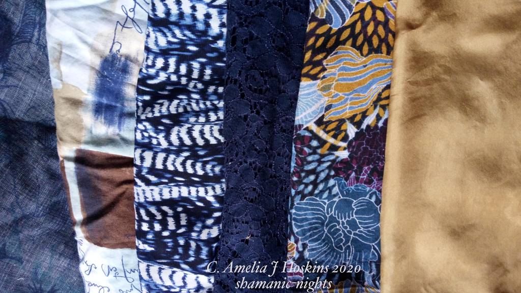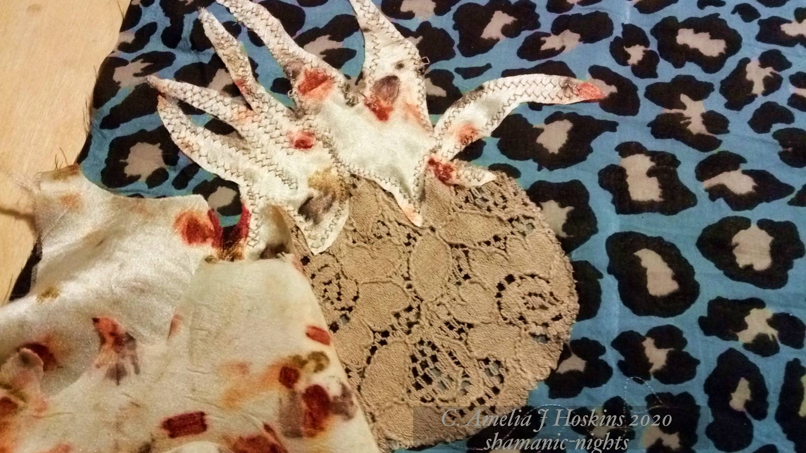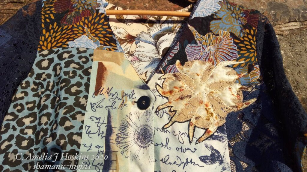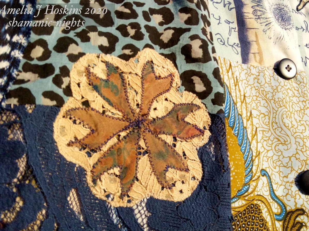 Robe Dress has applique lace pod dyed in eucalyptus dye bath after the collar piece. Colour took well, which is a guide to fabric content being cotton or silk. Dark centres to seed pod designs are cut from eucalyptus dyed silk (iron modified).  Light centre to pod is from bundle steam died silk with seeds and petals.  Nigella blues has variable on same pod idea.  A motif is a good means to join over a seam (smock left top). Also provides contrast to break up a solid dark or light area.