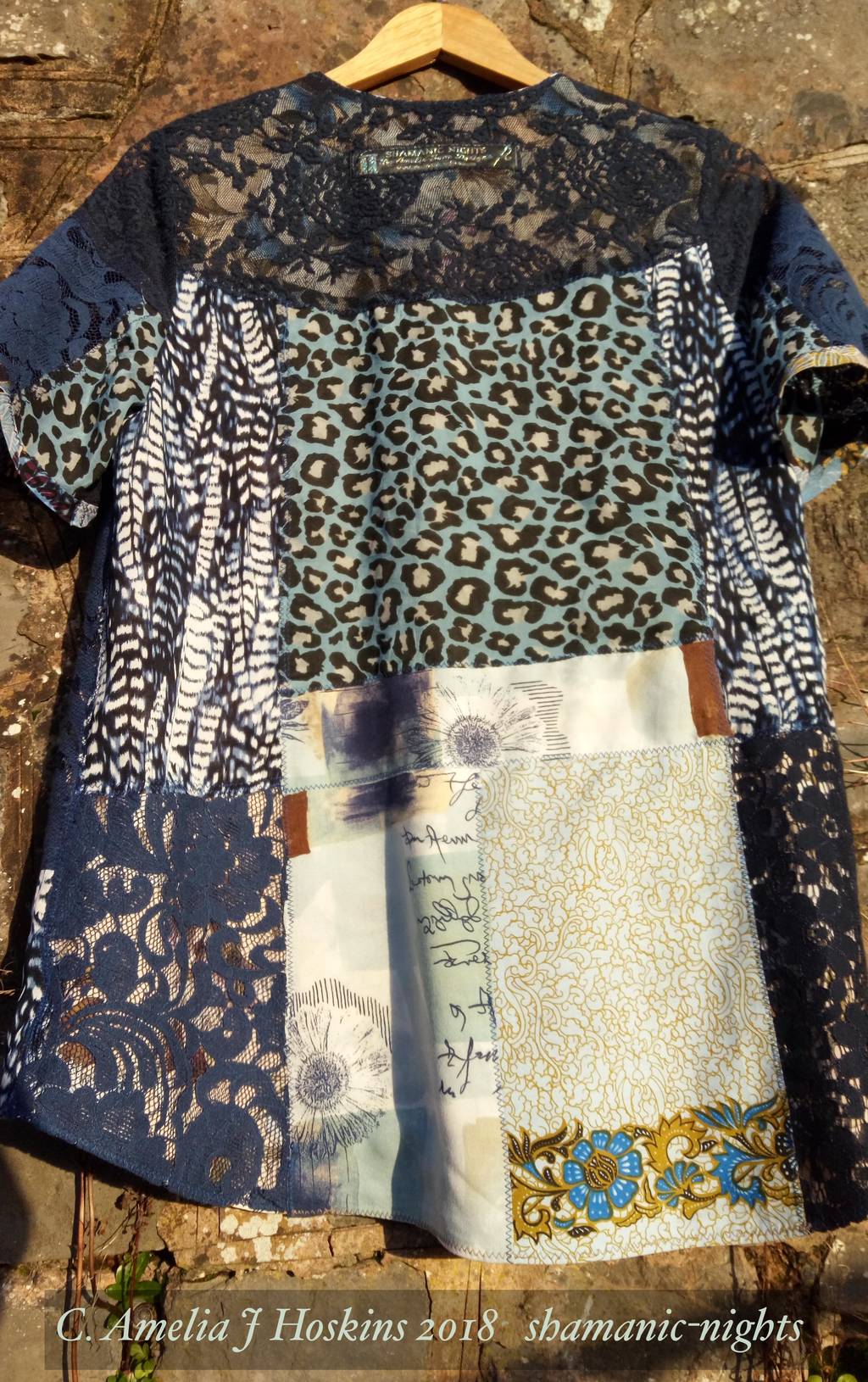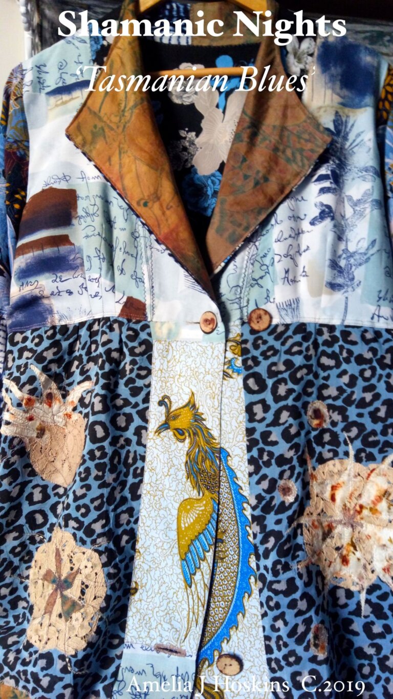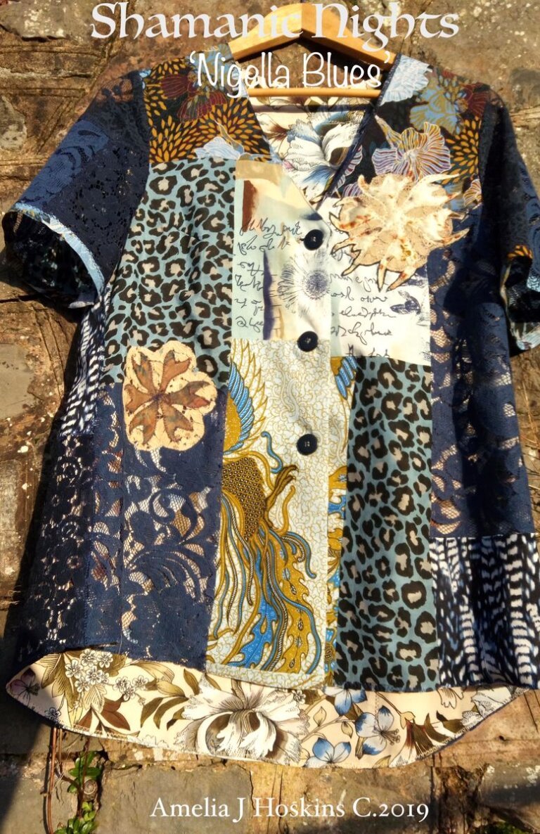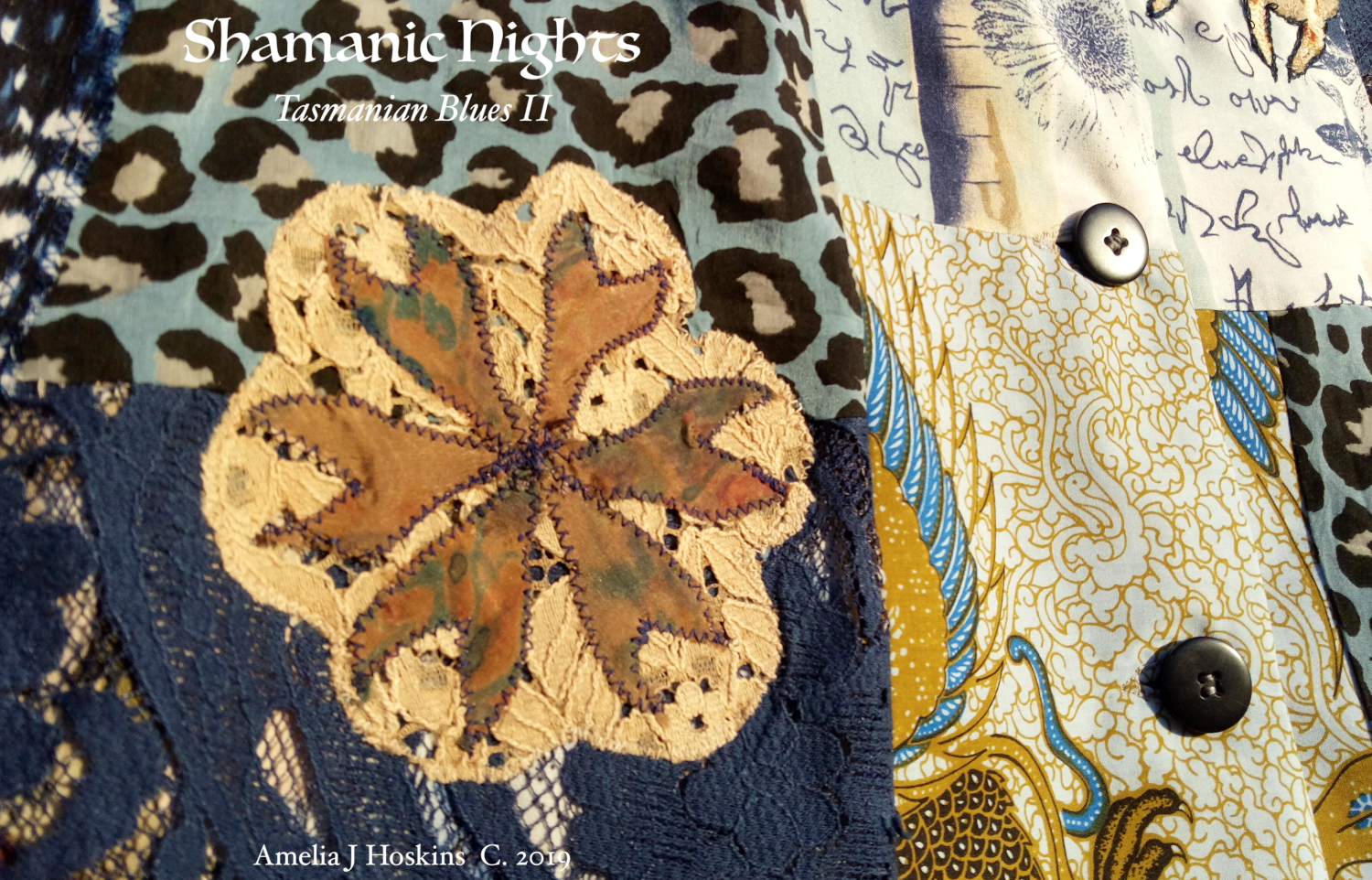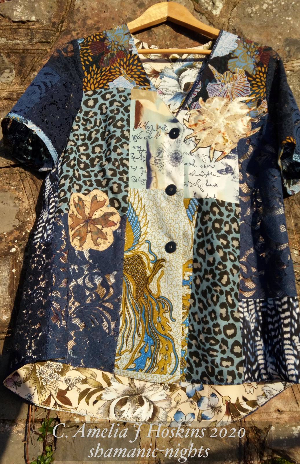 Enough patches prepared from 'Tasmanian Blues', for a smaller garment.  Size and shape was dictated by the blouse used as an underlining, the colours of which were a perfect match, being cream brown and pale blue.  Short sleeves made in dark blue lace.  Coconut buttons with bound buttonholes [how to below].  Applique patches giant seed designs again created with eucalyptus dyed lace and bundle dyed silk.  Back hem is drooped lower.