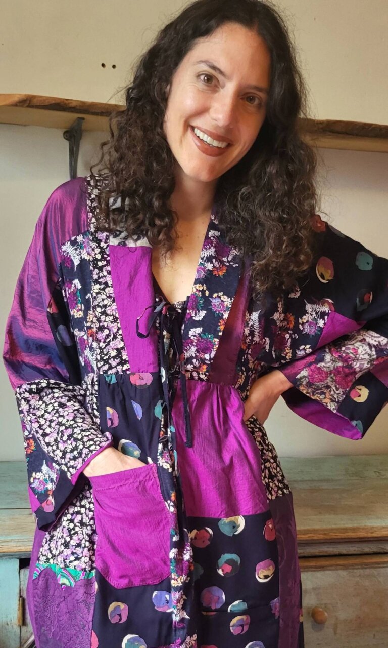 Kimono styled below knee dress or evening dress, (same style cut as dress Aldebaran) in panels of purples, navy and floral print patchworks.  Close fitted back top, with skirt section gathered all around, slightly below bust into a high waist.