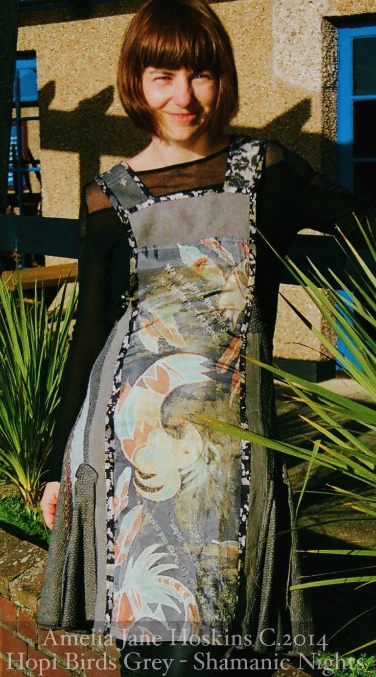 Pinafore dress with full silk painted bib front, and panels of thick grey cotton with silk piped