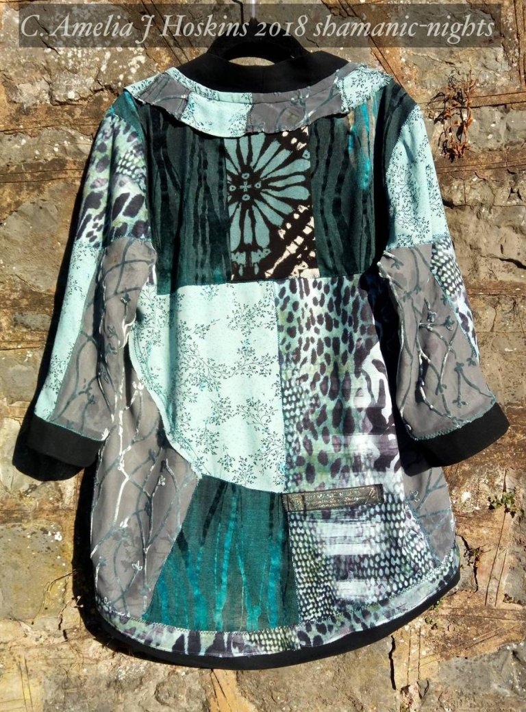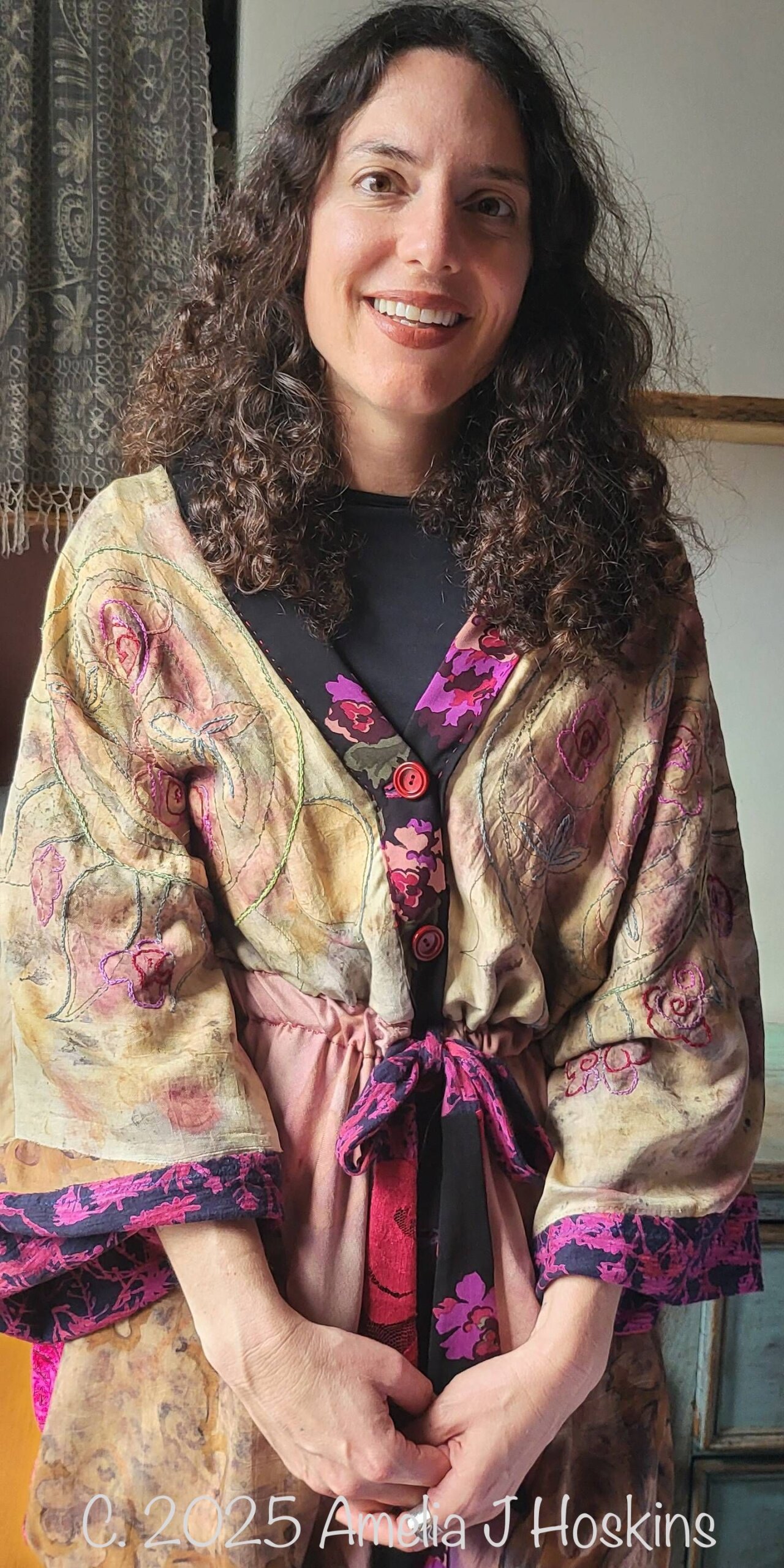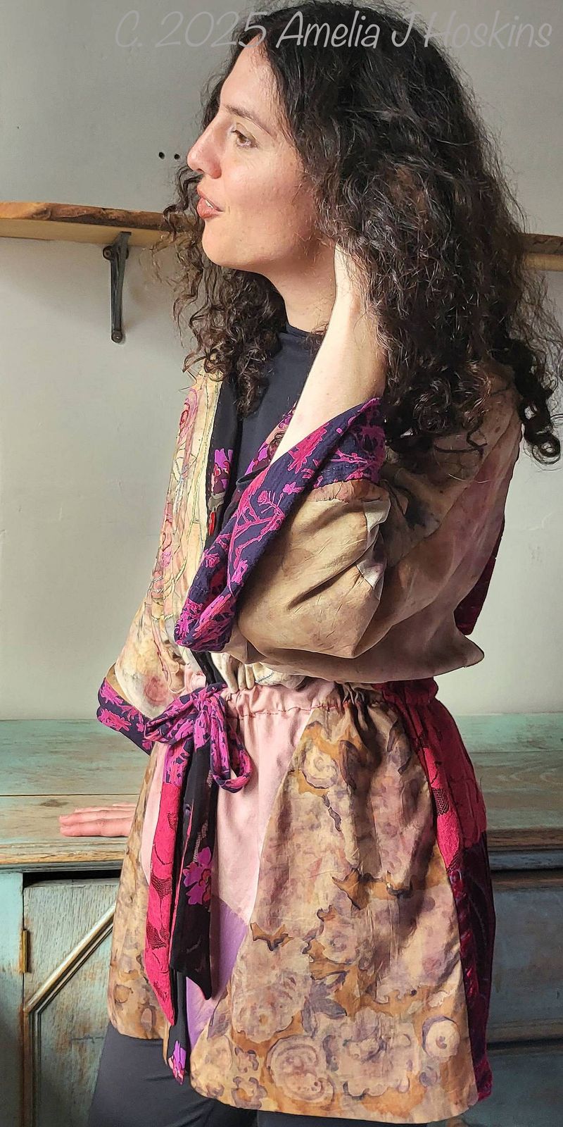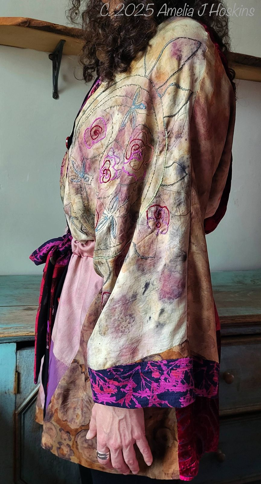 Sleeves have a join following down from shoulder.  Different silk bundle dyed outcomes front and back sleeve sides.  Front Ahimsa silk embroidered; back Habotai silk eco steamed tones.