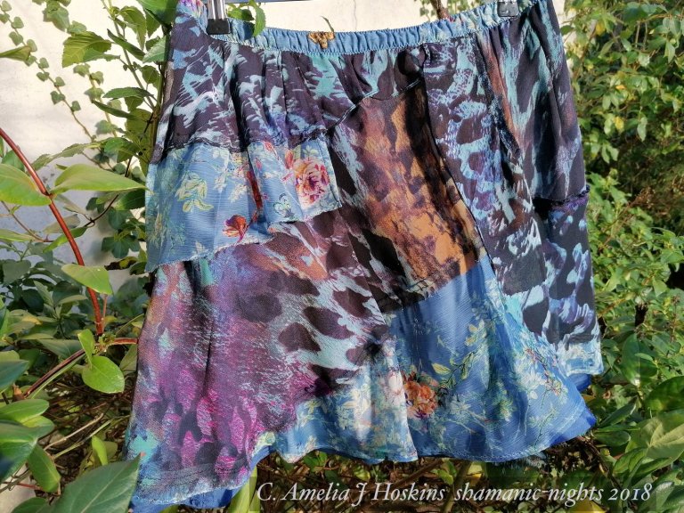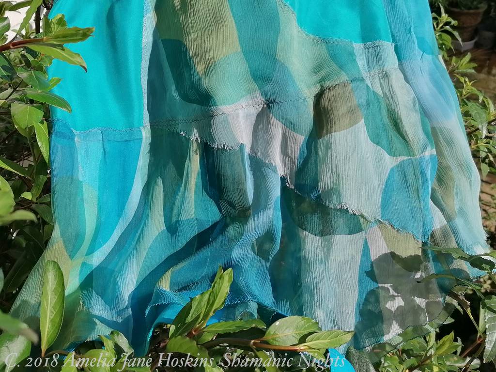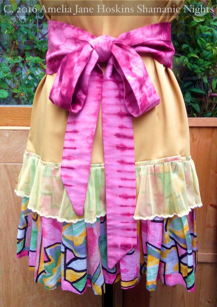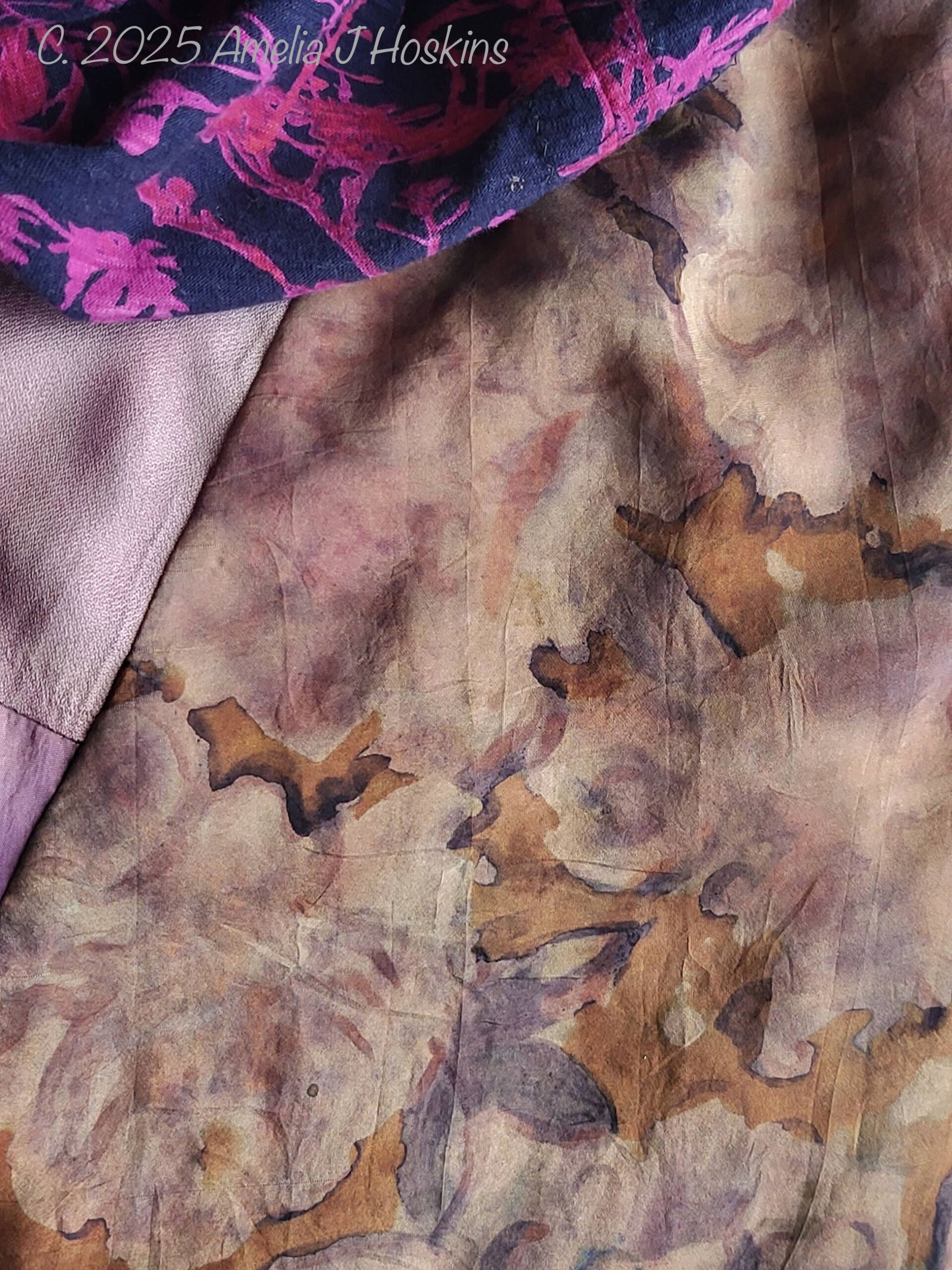 Lower dress side: Habotai silk dyed in golds and purples; created by bundle dyeing [link] - Many layers of over dyeing. Definition added with logwood, lemon juice and woad.  With bundle dyed silks, after steaming, outlines can be added to create 'design' shapes, like flowers.  Useful when the dyed effects merge together with no design definition.