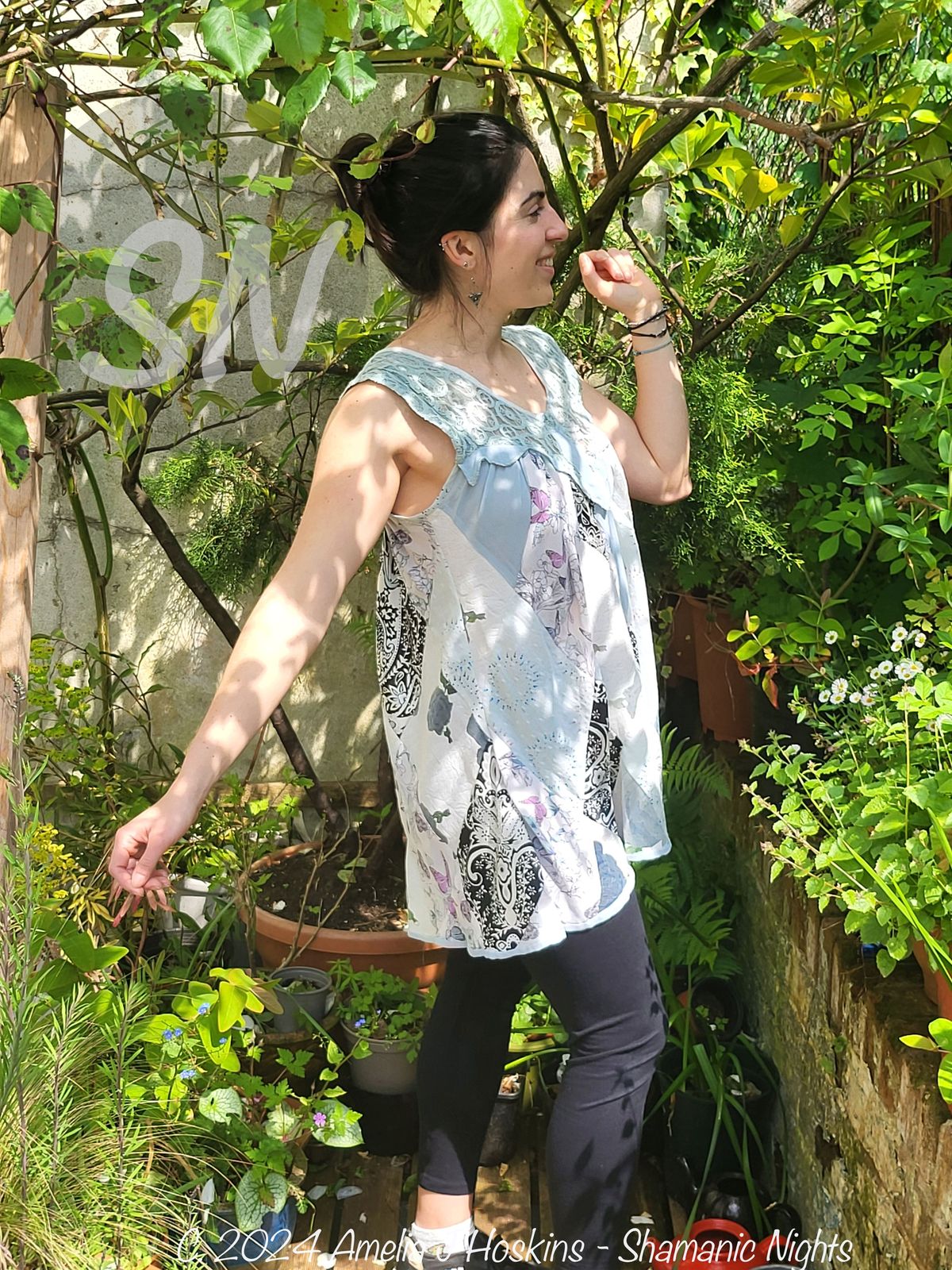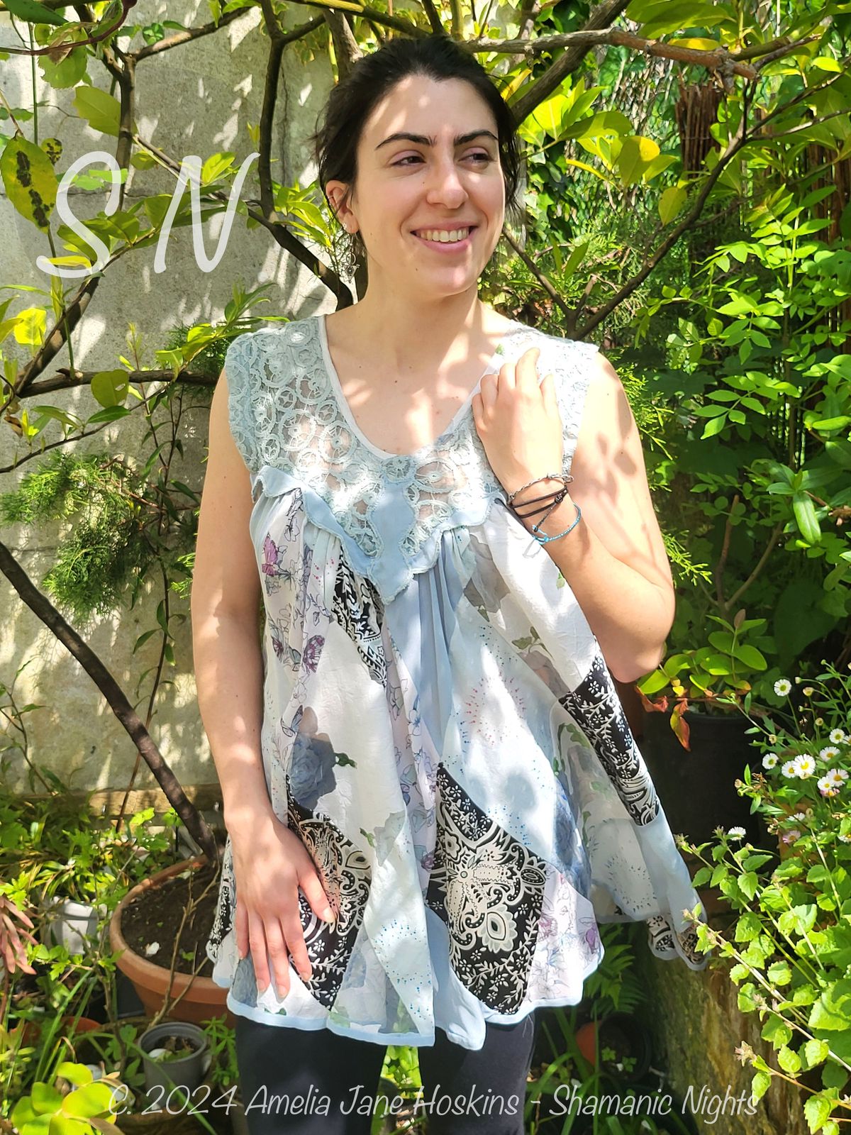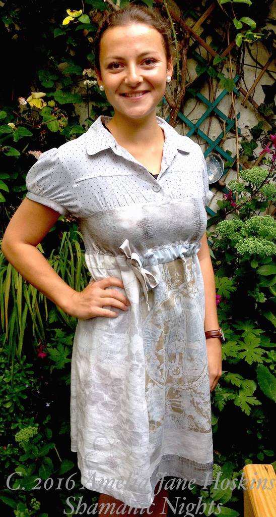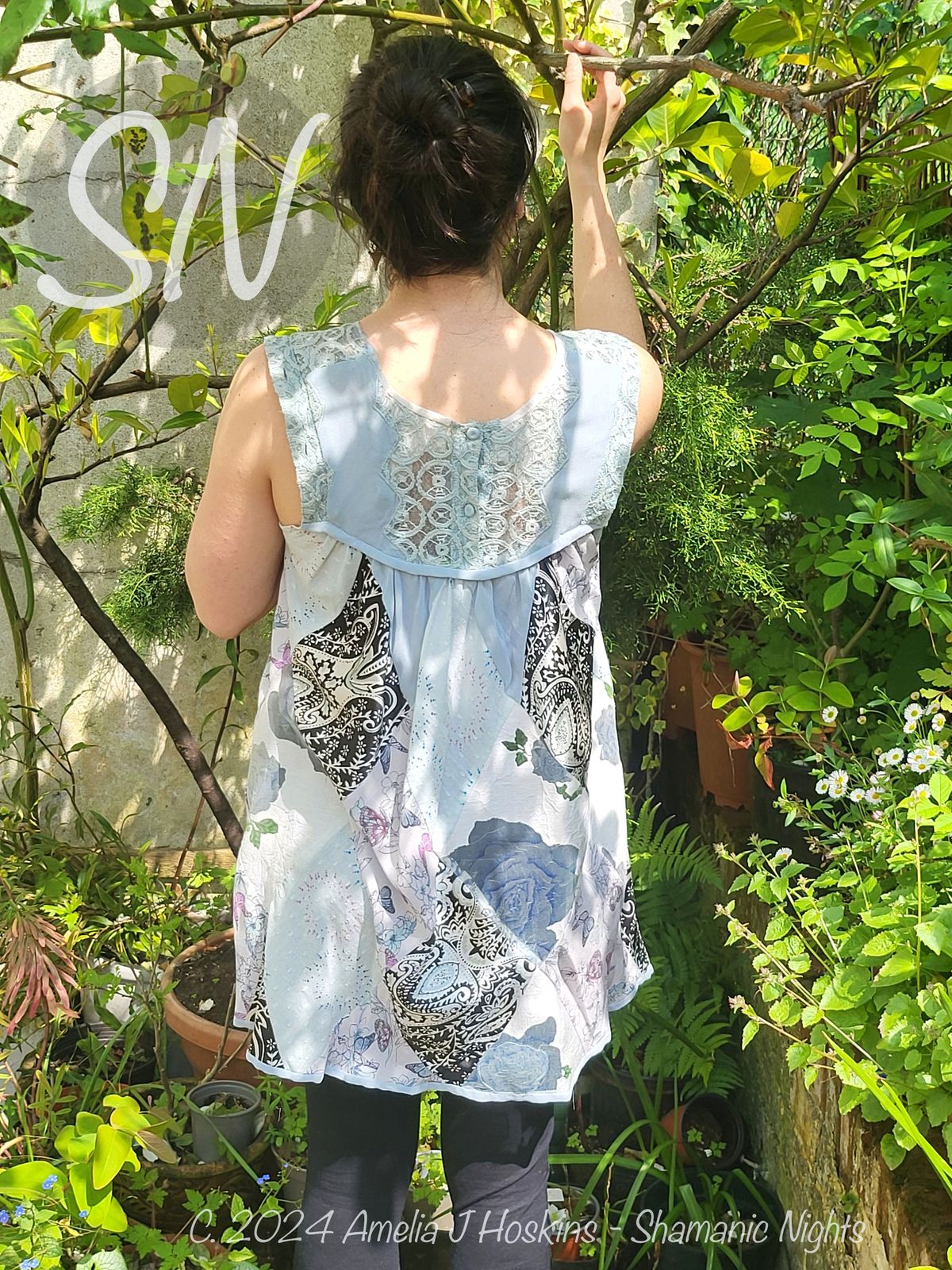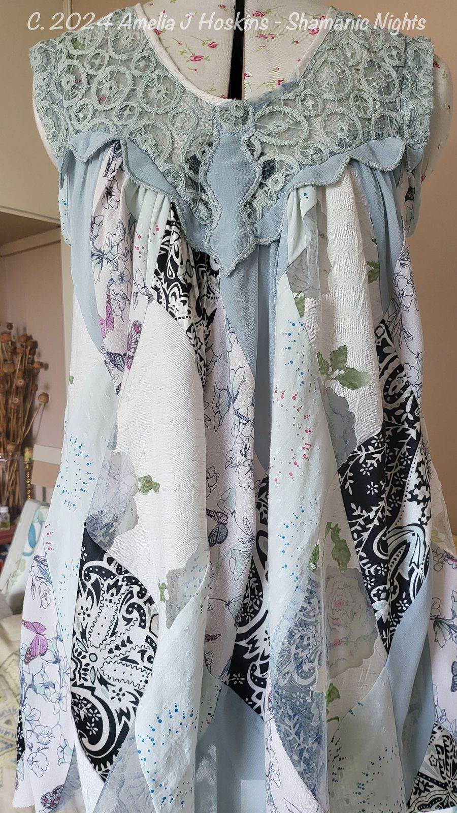 Often there are pretty tops which can have lower panels added to make a dress.  Shapes can be cut from tops and dresses, to create the princess front and back points.  Fabric from dress, or frills and lace can be added to top 'V' shape edges, with panels sewn behind.  Front centre lower panel is ecru linen embroidered. Black and cream print panels. Side panels are hand painted silk with grey rabbit designs.  Neck shape was original with top, but a contrast print could be used.     [Rabbits dress SOLD]