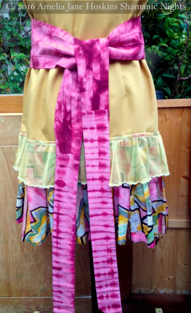 Dress converted from mustard yellow cotton/viscose tunic top, with pink/green abstract print lower frill.  Lace lower frill, sleeves and collar.  Extra long featured two toned pink sash added.