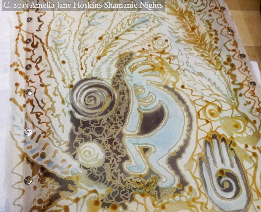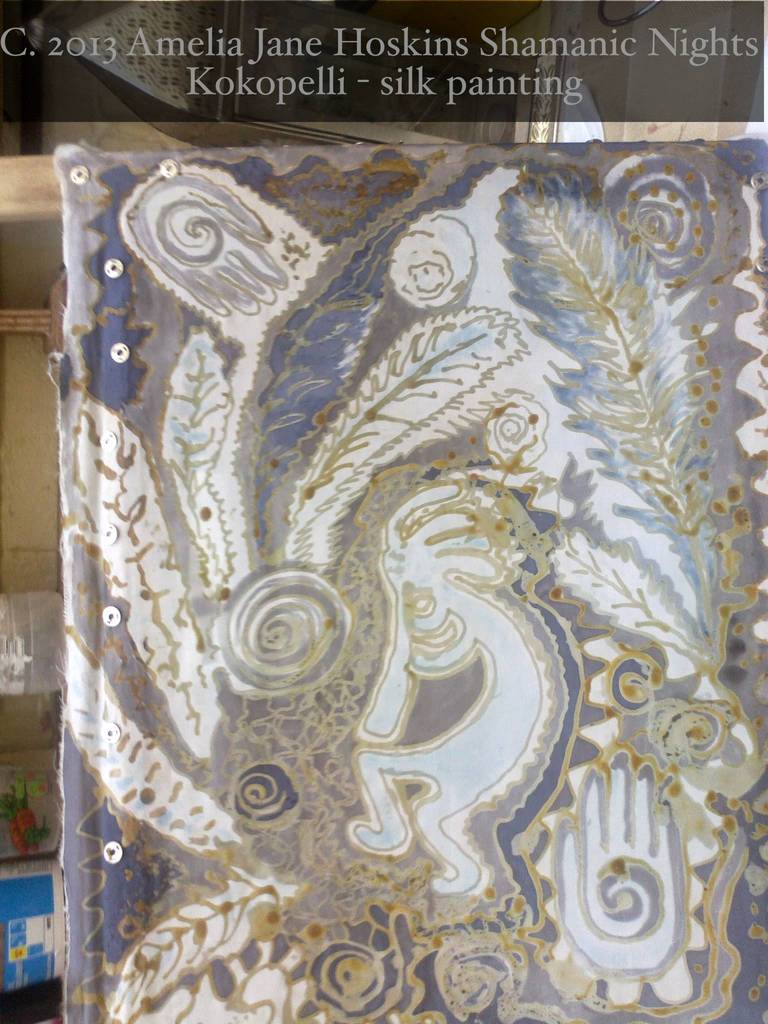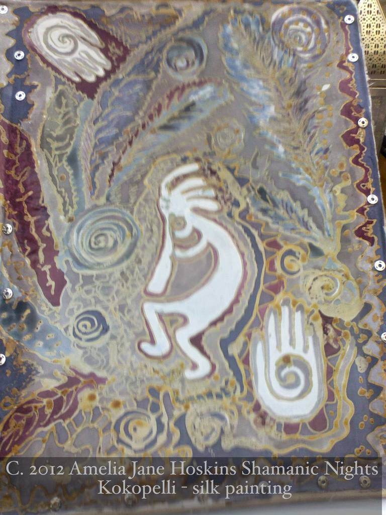 Kokopelli - flute player features in silk painting with feathers, hand and spirals