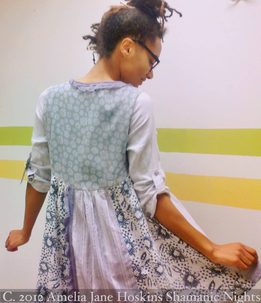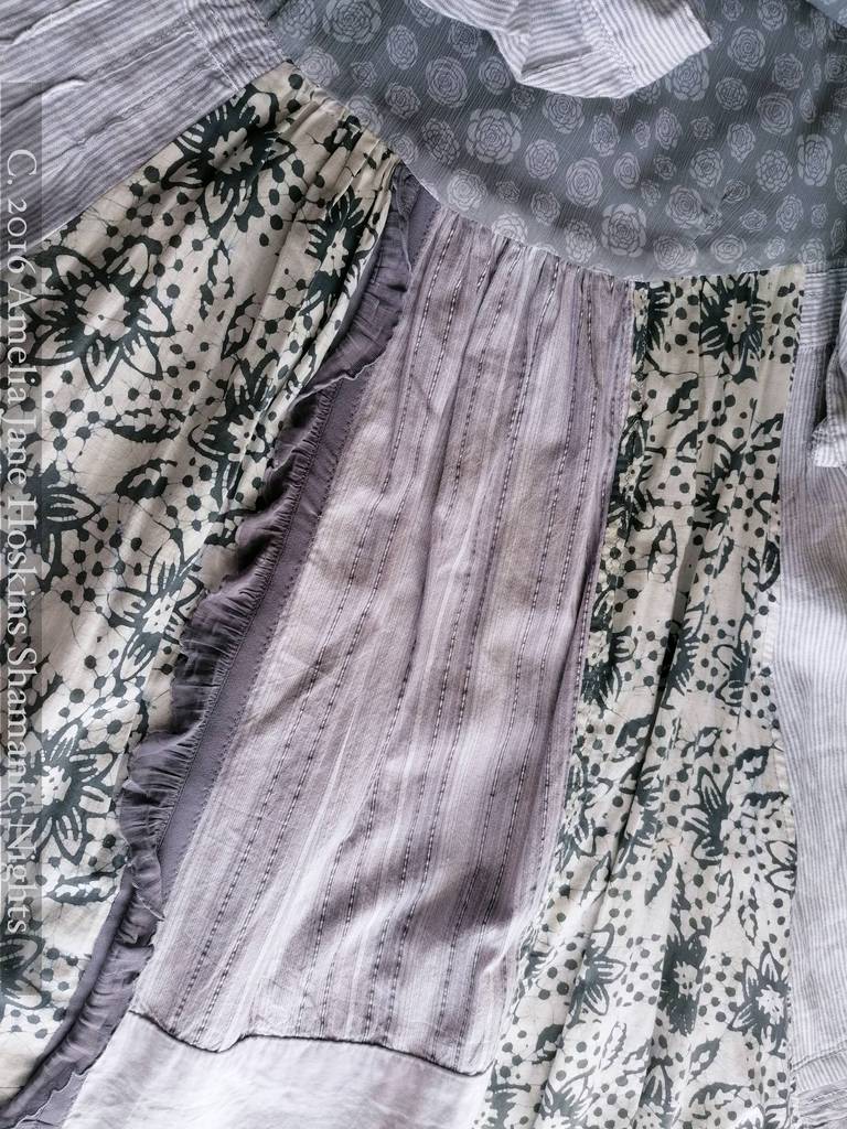 Coordinating purple salt-splashed dyed silk top forms the soft bodice top.  Linen and cotton prints cut into rectangular panels joined to the top silk diagonals front and back.  Slashing the purple top diagonally gave a bias edge from which to attach the lower cotton and linen print rectangular sections which form a flare over hips as fabric falls.