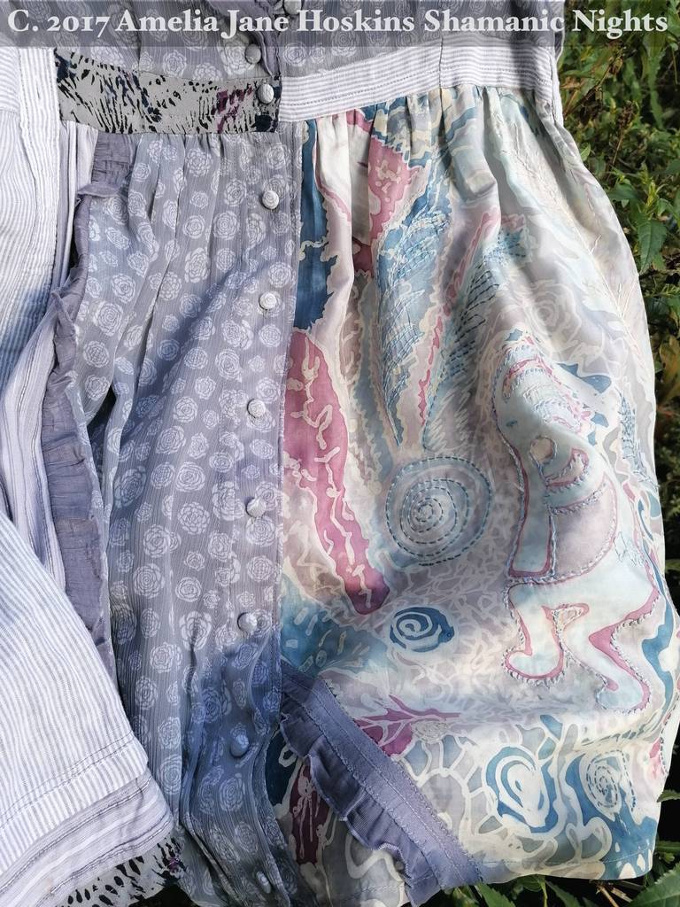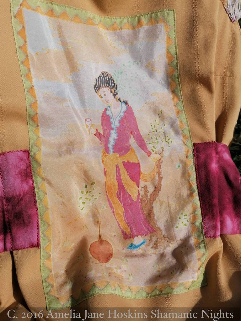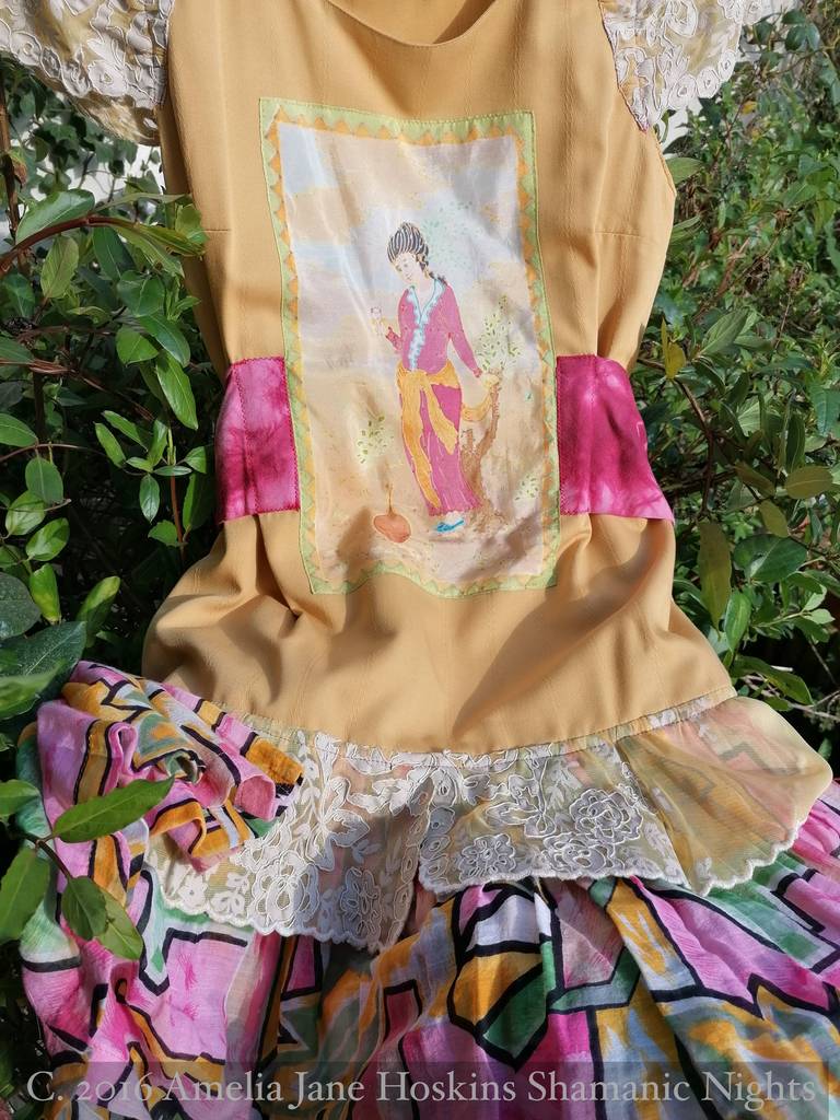 Two dresses featuring silk paintings of mythical figures from two different cultures.  Piri from Persian art meaning beautiful and graceful girl, or supernatural being similar to angels.   Kokopelli the flute playing seed spreader from southwestern Native Americas.