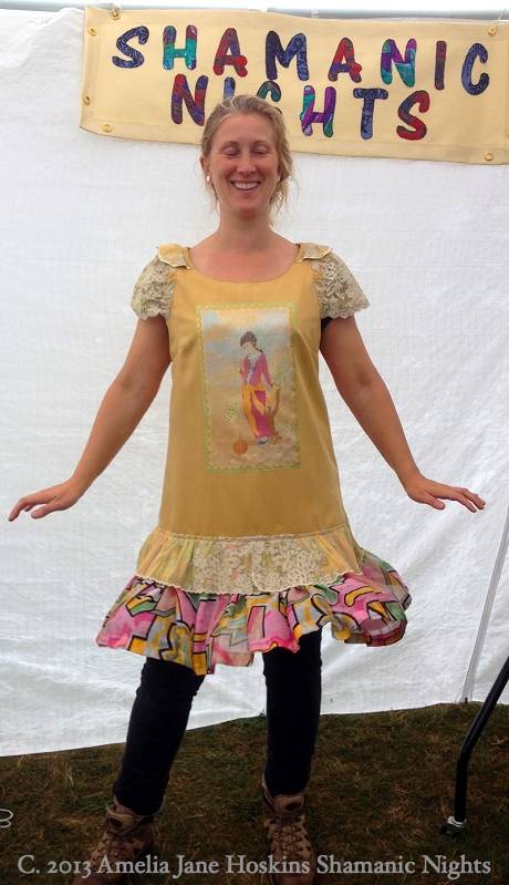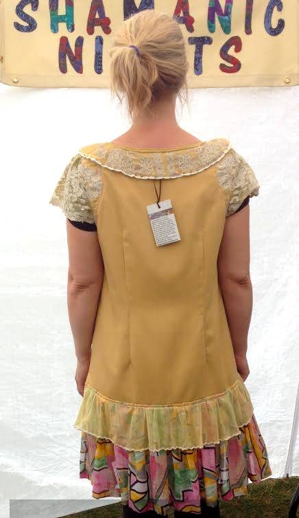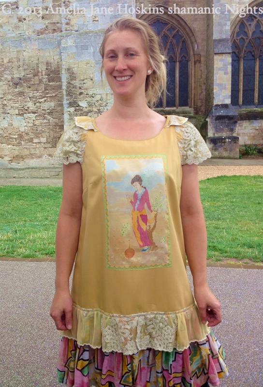 Dress modelled at Exeter Cathedral Green Craft Fair before crimson sash was added.  The sash echoes the sash in the painting. Dress began life as a short top without sleeves, collar, or lower frills: from an earlier created range with the Piri silk painting rectangles. A deep teal blue version was sold.  After finding the yellow ocre lace blouse in exact colour match; the collar, sleeves and frill were added.  The lower cotton abstract print frill was also added; which links to the Piri colours and gives a weight to the dress.