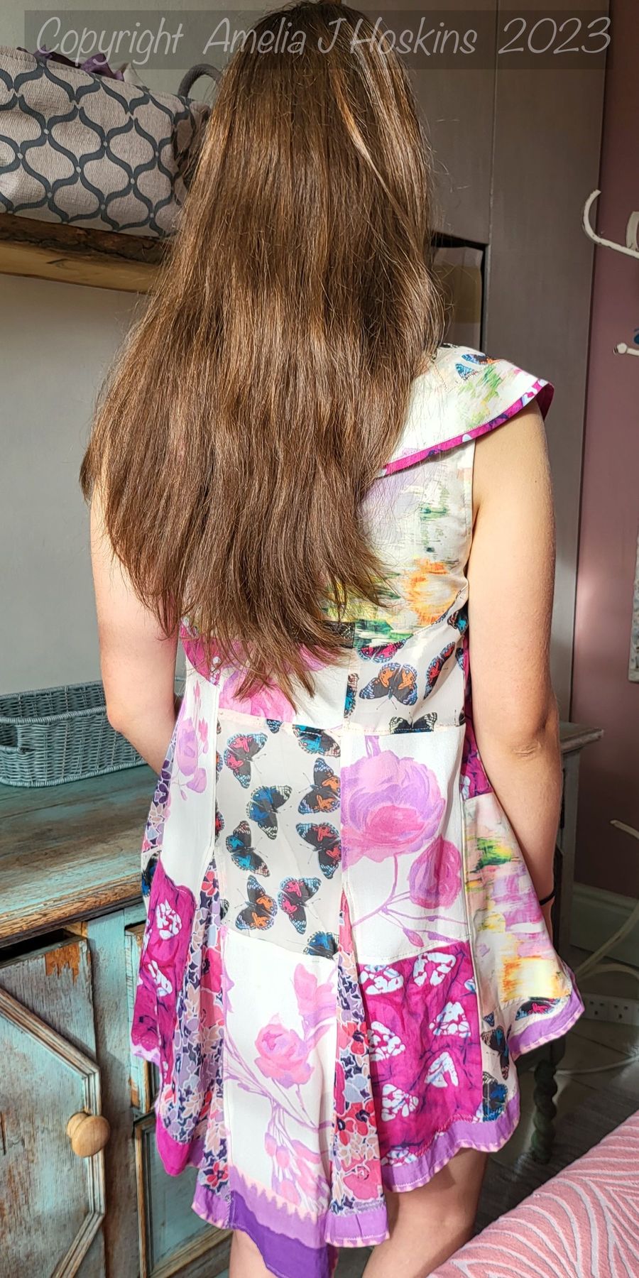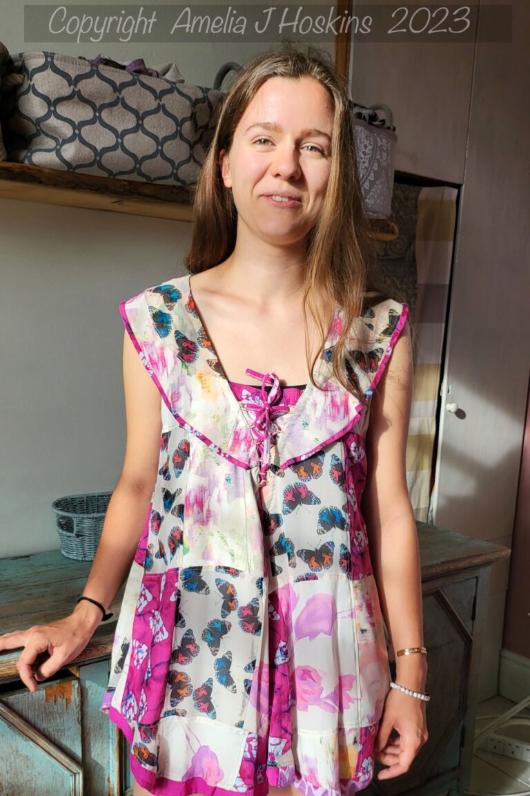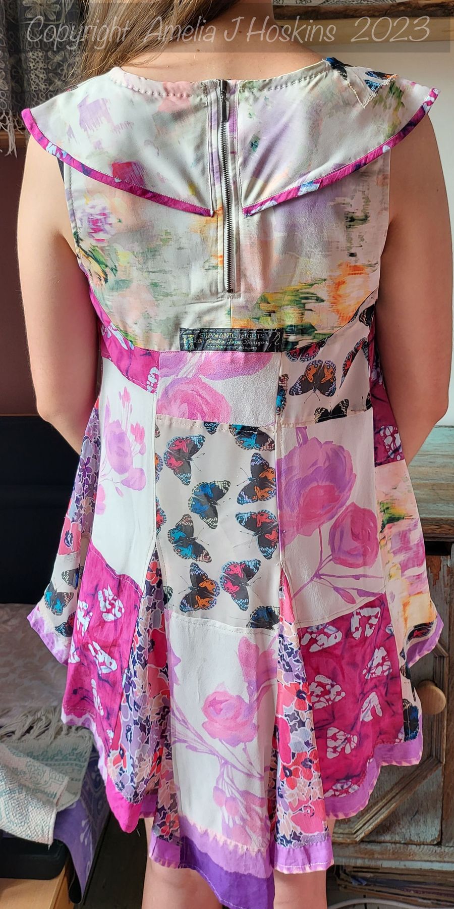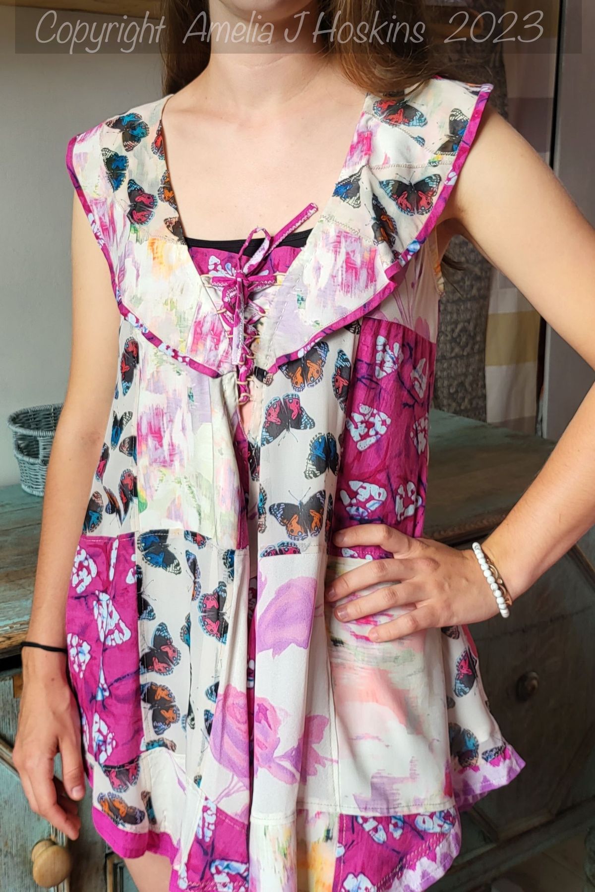 Summer Pinks and Butterflies patchwork mini dress with sailor collar, front adjustable lace up tie, flared sides and inset flares at lower back.  Viscose, polyester and cotton.