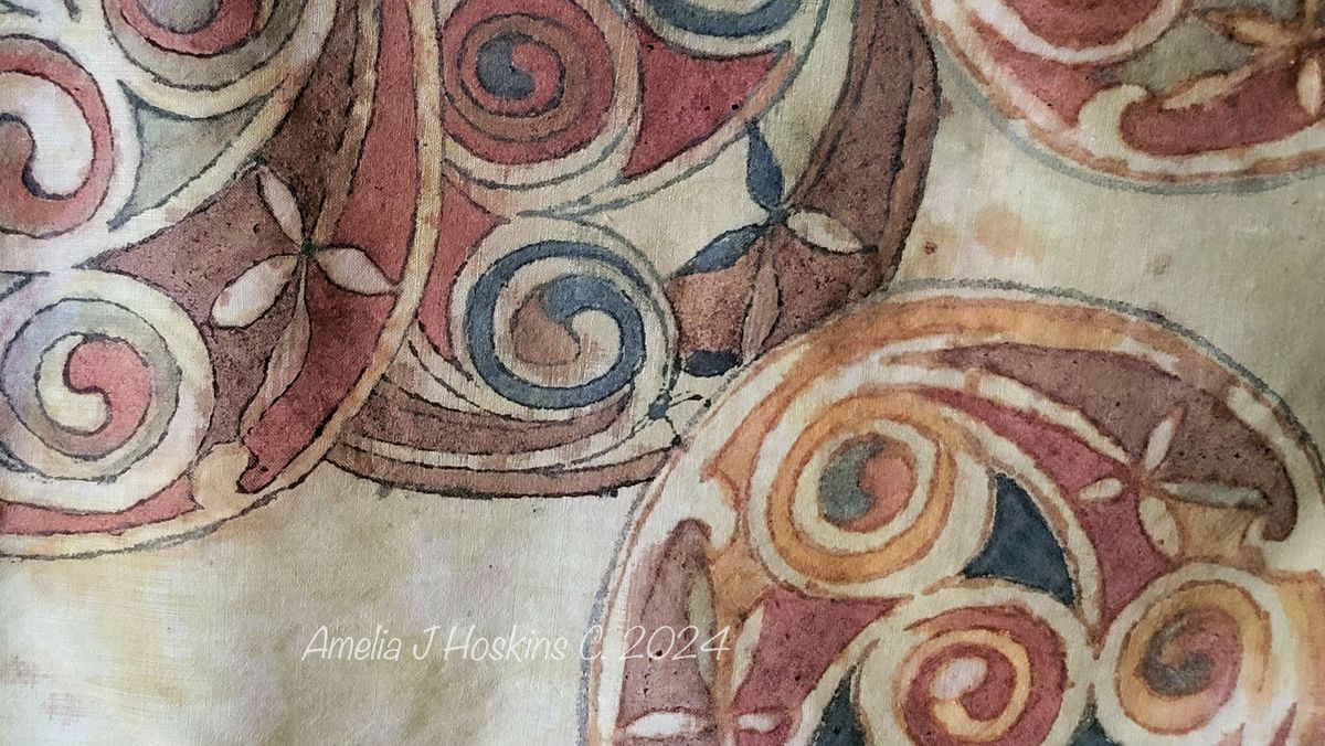Original source for Celtic Triskele design was formalised geometric plant forms within a sphere.  On this silk they are not geometrically exact; the spheres have more loose design, left so to enable simplified embroidery areas.  Shapes within Triskeles have been modified with lemon juice to discharge some of the left over dye colour, and to create definition in the design.