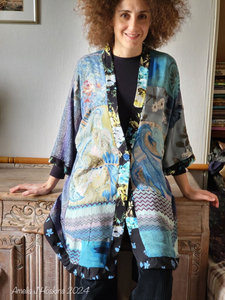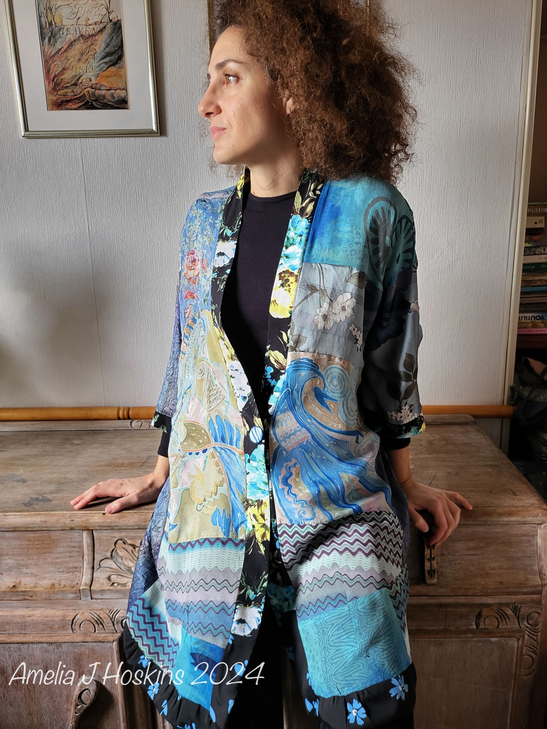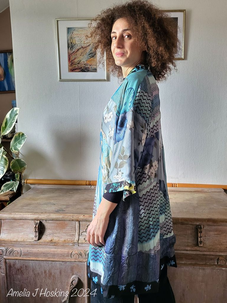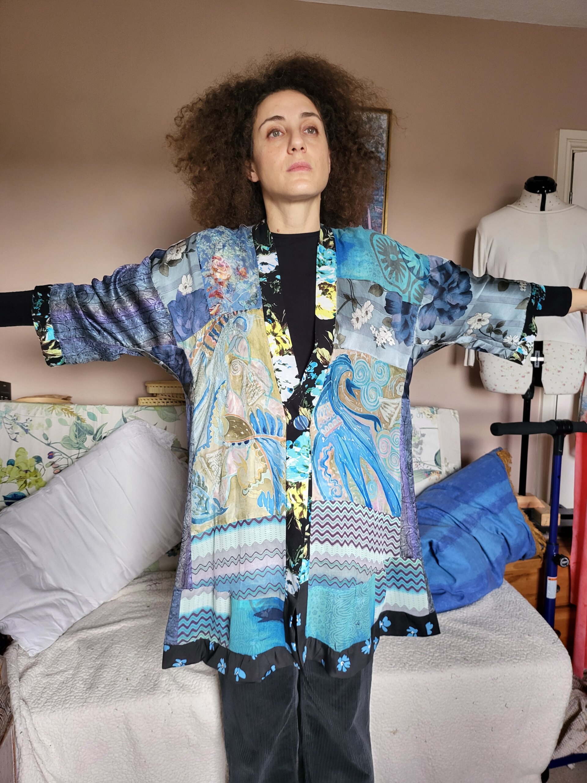BLUEBIRD Kimono dress uses totally unique combination of nicely hanging fabrics: silk, polyester, polyester voile and viscose, for easy leisure wear, as dressing gown, event dress, or beach dress.   Front welt edge which forms kimono styled collar is part of the lining as a floral black/blue/yellow viscose shirt was used as a base to build the garment on.  Lining garment was extended with black fabric with turquoise flowers seen where extended to front to form 'hem'.