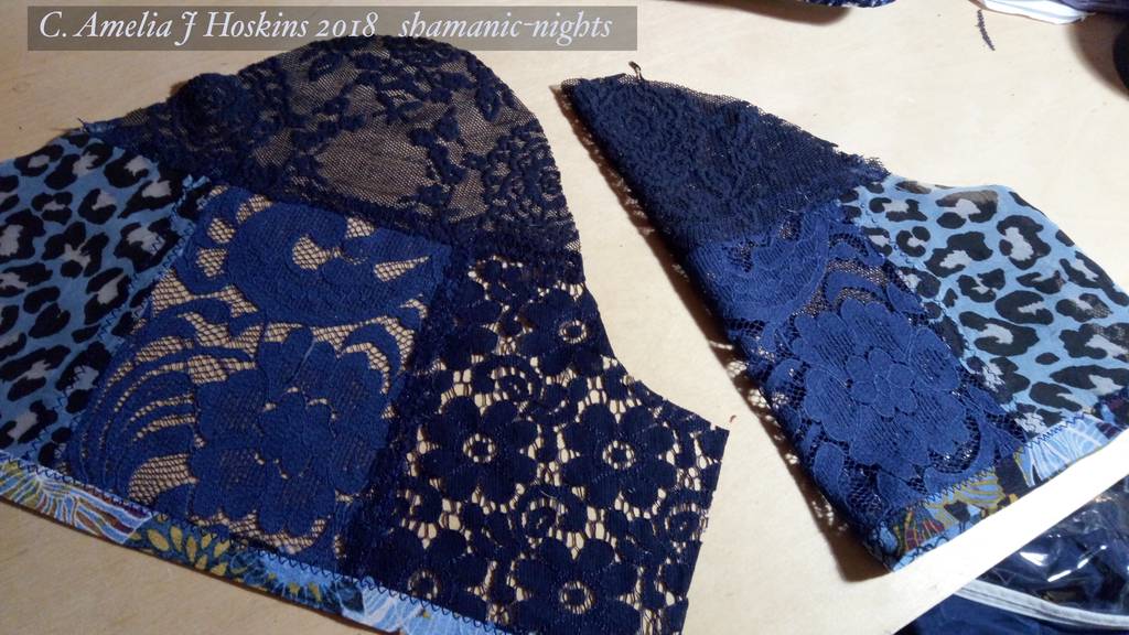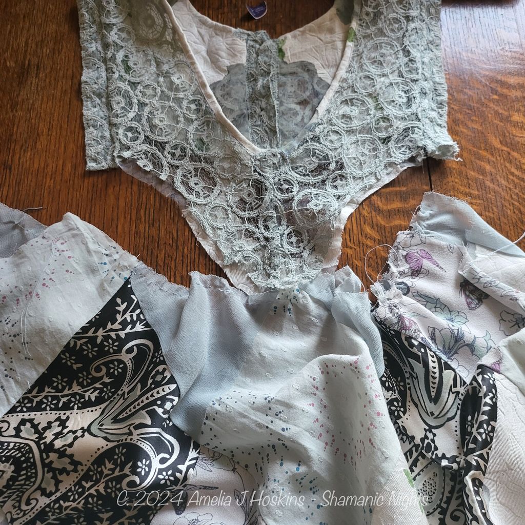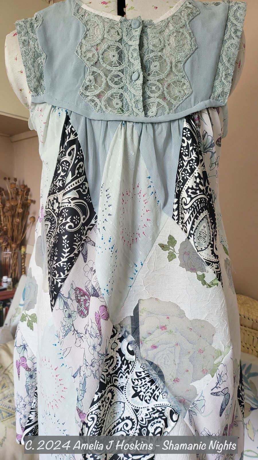 Yoke lace is taken from a blouse, and lined with a fabric which has transparent blue roses (seen in the patches); which holds the entire yoke firm.  Same lining fabric is neck edging turnover.  Bottom of yoke open to insert patchwork portion; gathered at bust curve-over area.  This works well - see model.