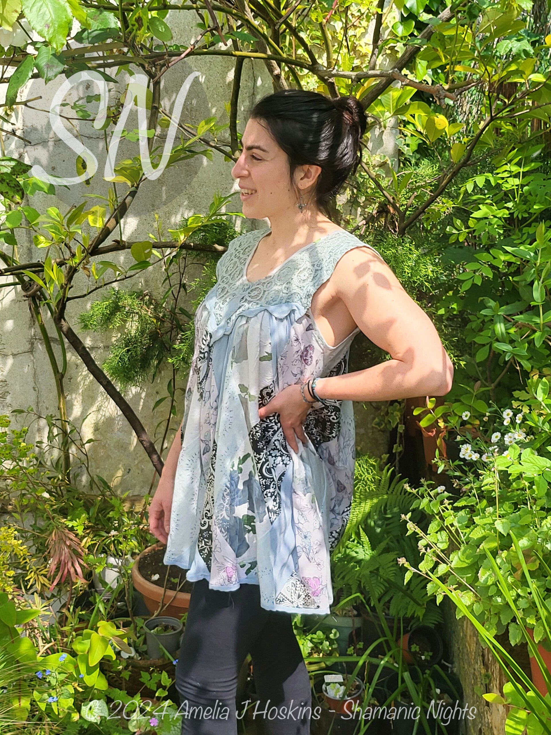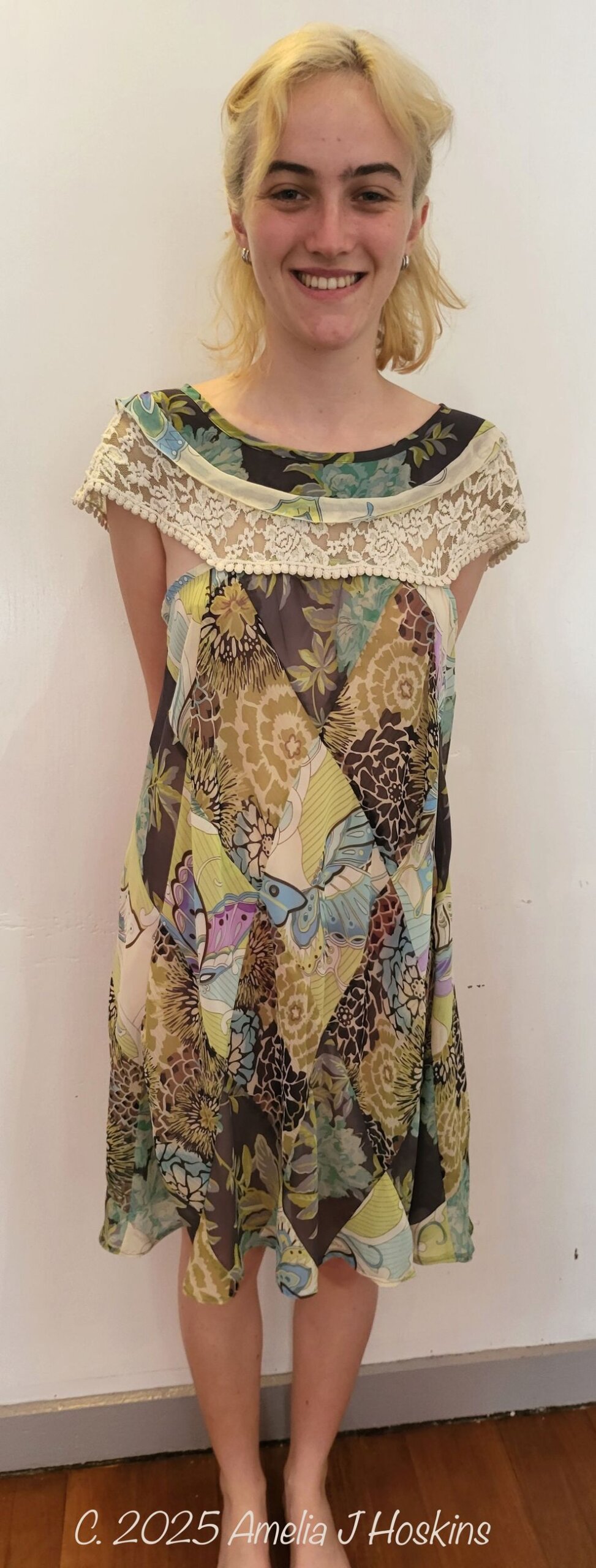 Summer dress or over-top is light and cool,  Lace neckline yoke feature with gatherings of lightweight floaty patchworks under yoke.  Back neck button but not needed as dress fits over head.  Model is about size 10 to 12 (UK).