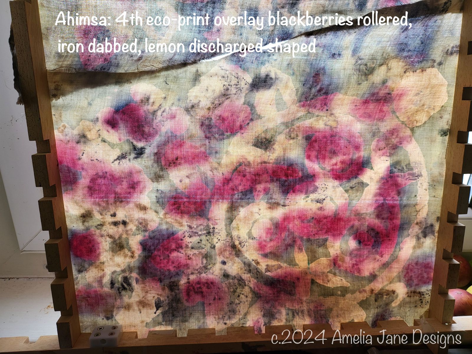 Celtic Triskele shapes are seen painted on with lemon juice to discharge through the blackberry and multi plant eco-dyed and steamed Ahimsa silk