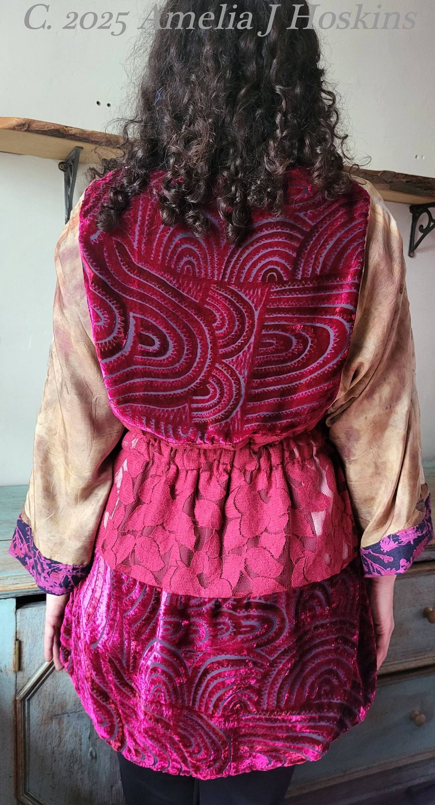 Mixed fabrics: including magenta pink-red velvet devore at back and a variety of silk dyed pieces at front, partially embroidered.