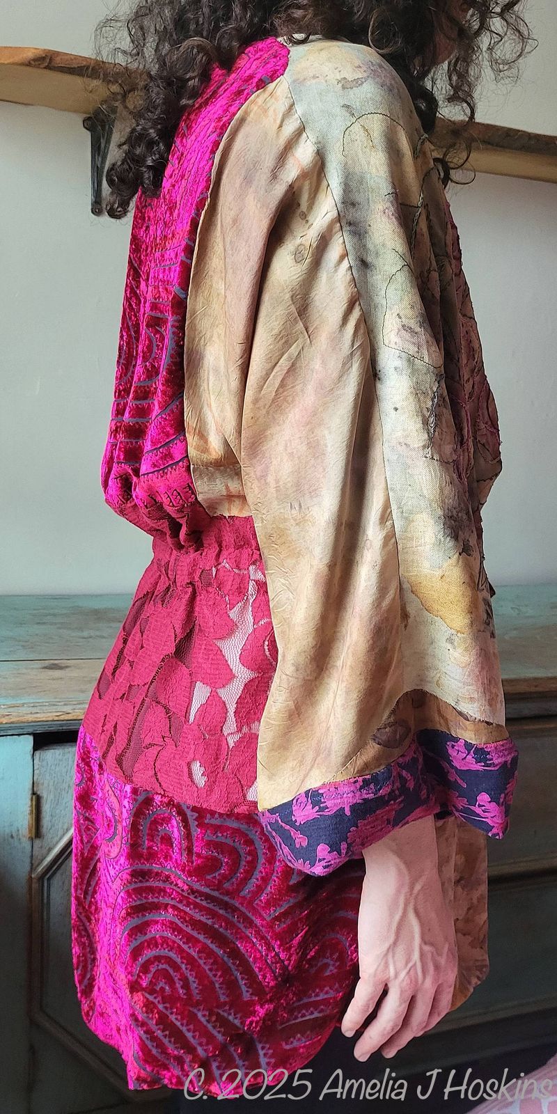 Sumptuous and totally unique kimono dress.  Mixed fabrics: including magenta pink-red velvet devore at back and a variety of silk dyed pieces at front.  Experiments with eco dyeing using plants to dye Ahimsa and Habotai silks.
