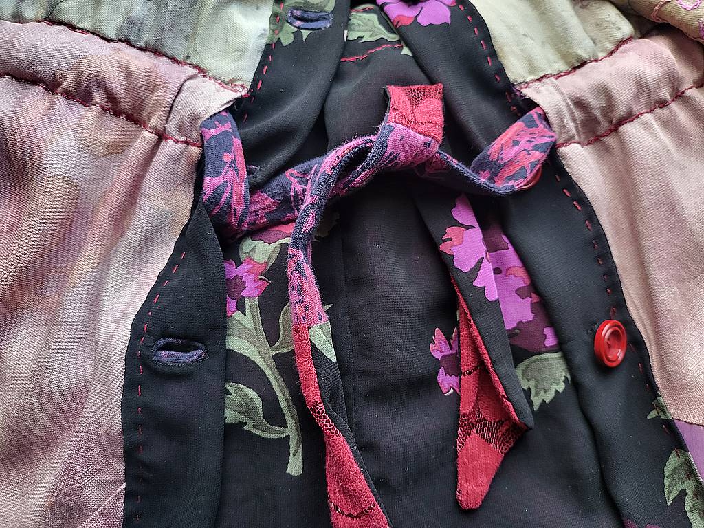 Garment is built around an existing black/pink roses polyester printed lining which provides the collar and front buttoning section; i.e. the original front welt is used for front welt on kimono dress, and one side of the sash belt, which threads around waist and having back part elasticated.  New buttons and bound button holes added.  Pink silks either side of front are blackberry dyed.