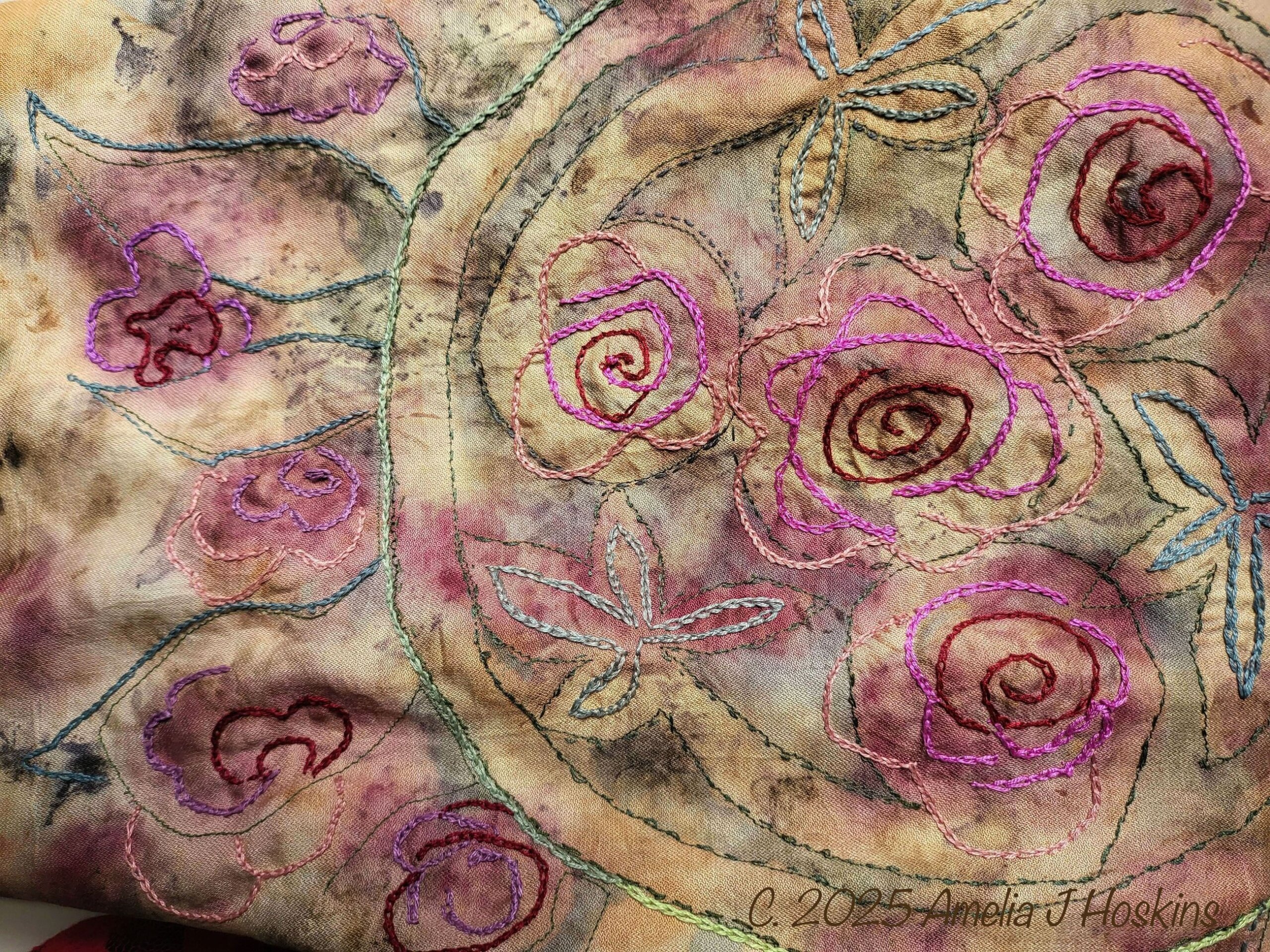 Silks Ahimsa - Chain stitch follows the outlines of the discharged Triskeles.  Original development of colour on the Ahimsa silk at bottom of this page.  Freestyle 'roses' are created within the Triskele design.  Silk Habotai bundle dyed and modified to create appearance of roses, but no embroidery.
