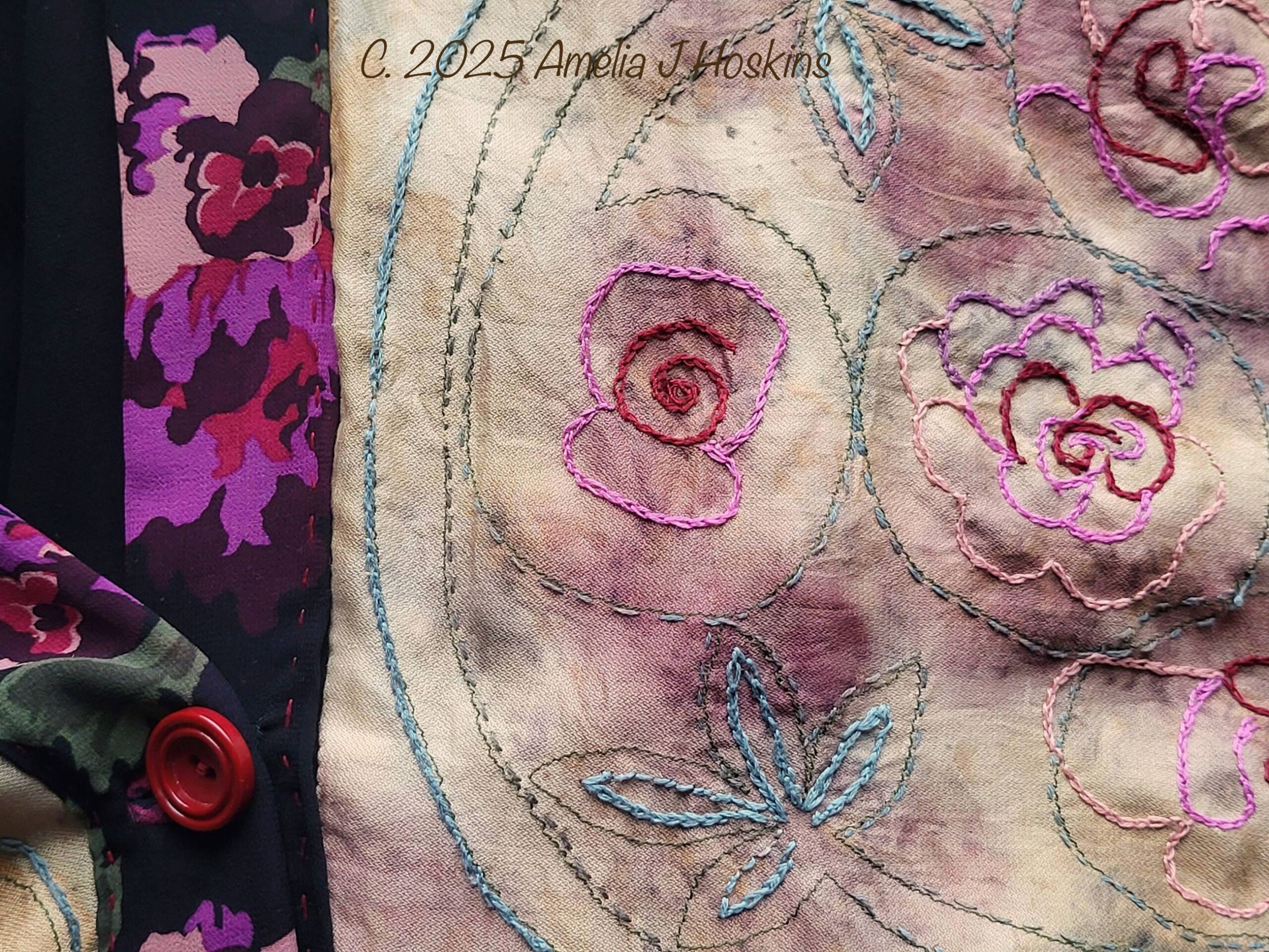 Sleeve section in Ahimsa silk, bundle dyed with various flowers and leaves, and blackberries [background eco print session see Session 4 'To get some colour'.  A blotchy result led to being over-embroidered.