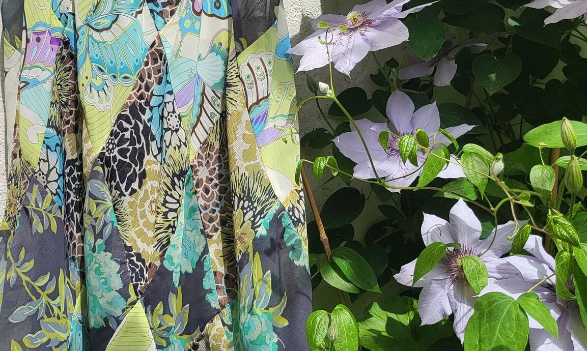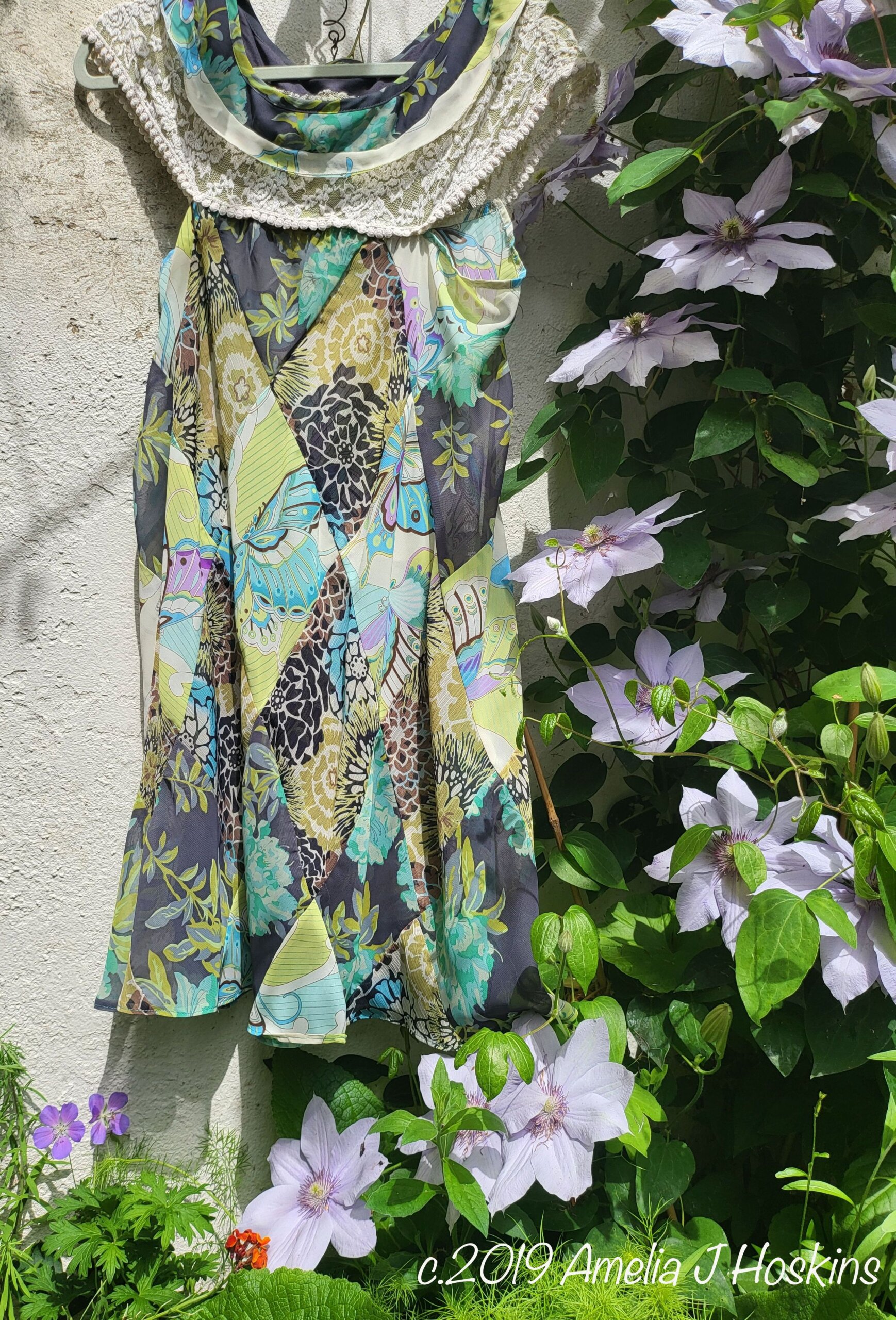 Mainly a green moss and jade 'story' dress, but has lilac and turquoise in one of the voile prints; making a charming picture with lilac clematis in my garden.