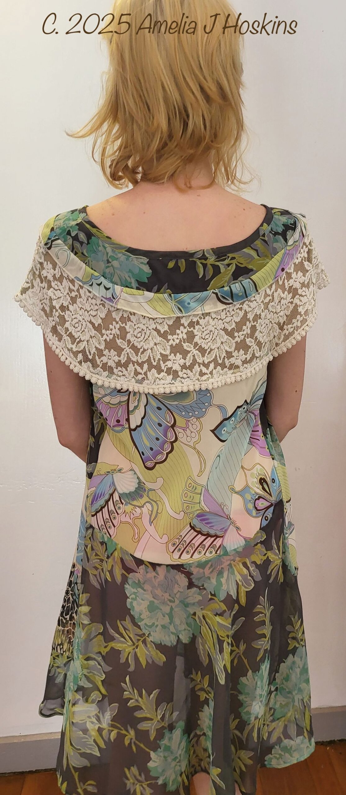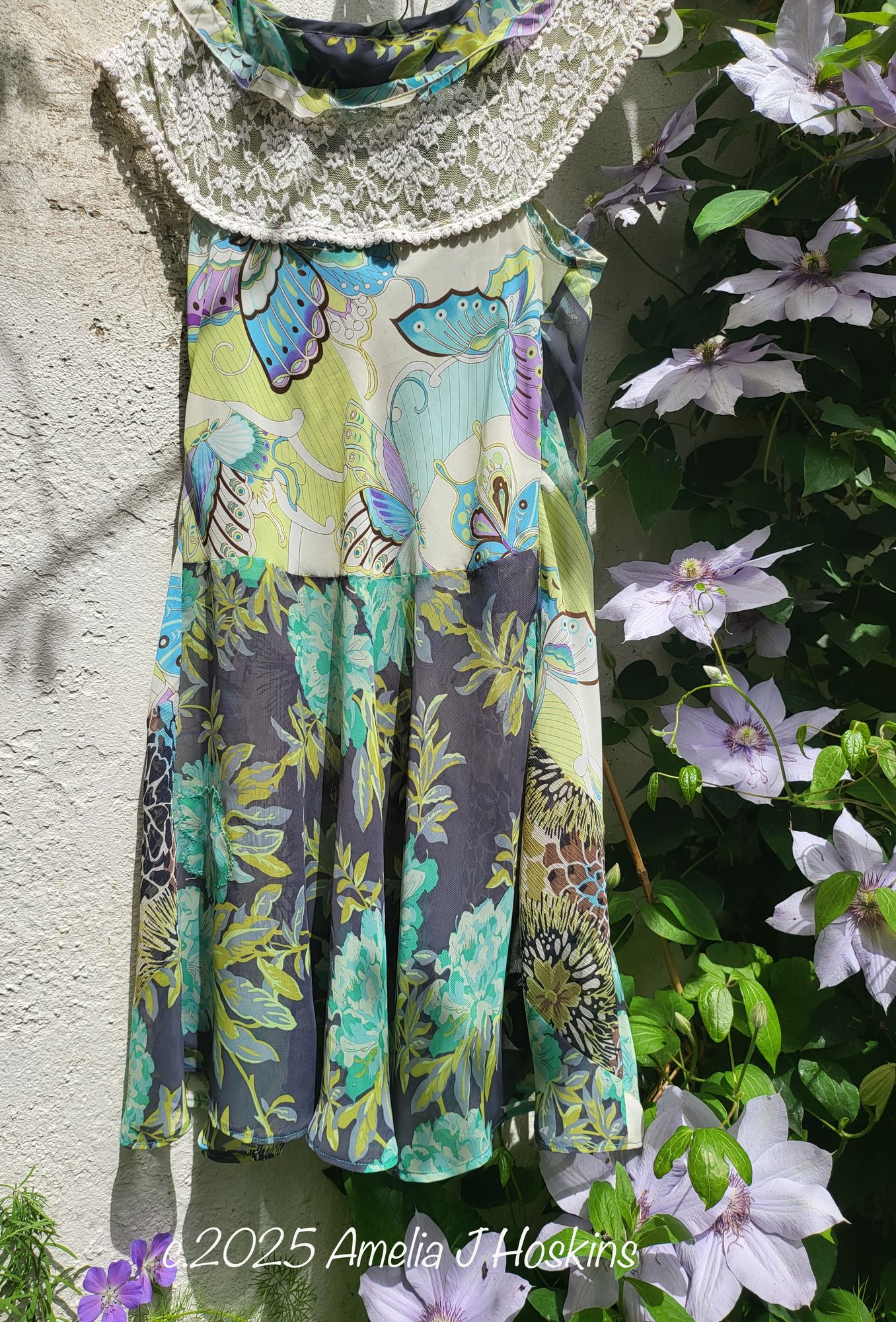 There is also a sister dress (SOLD) 'Butterfly Moss'  with silk painted butterfly silk frontispiece and similar lace yoke.