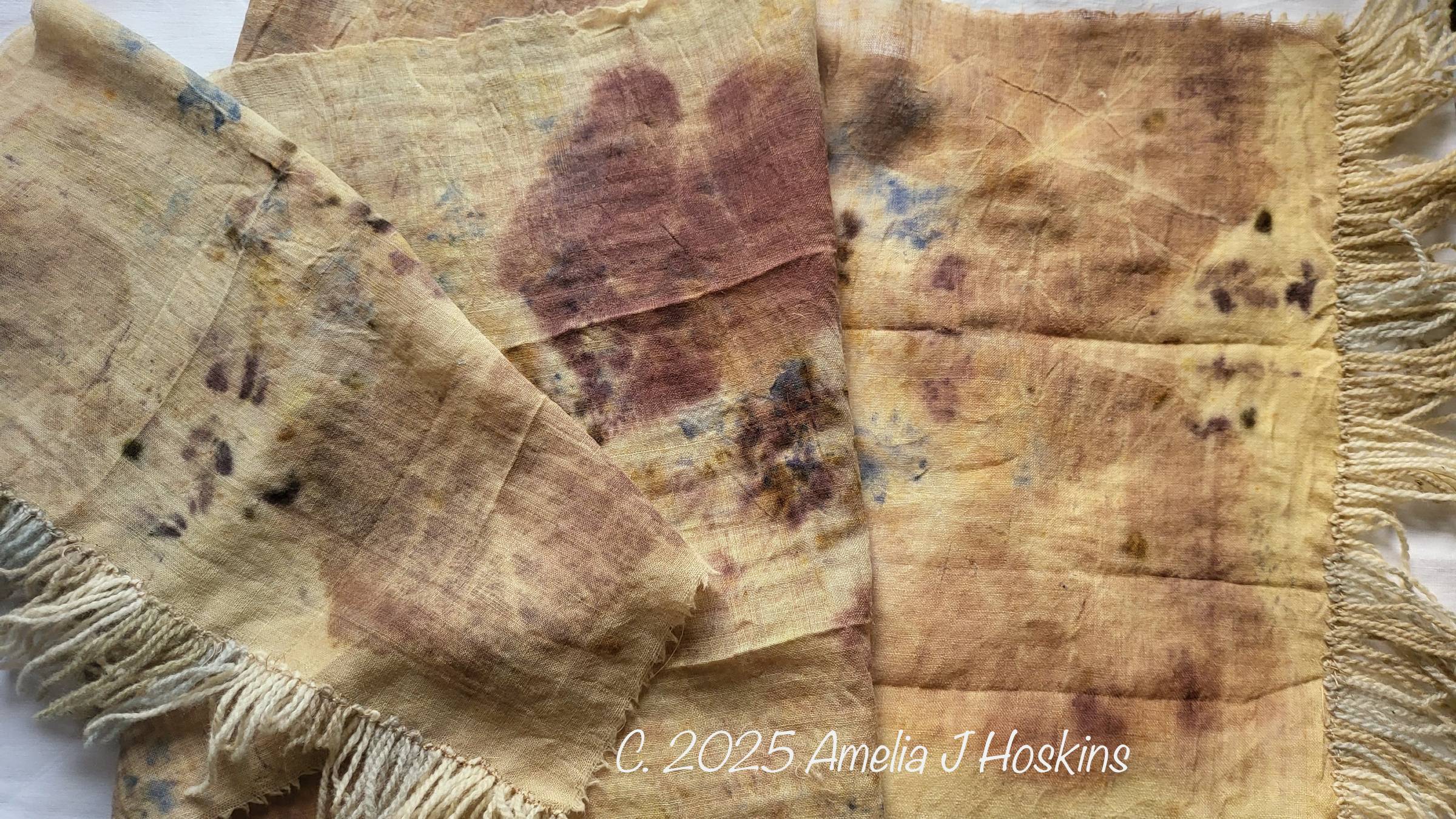 Fine wool was previously dyed with Comfrey or Rosemary giving dull gold background.  Large red leaves of vine tree Catalpa Bignoniodes See post; Secondary bundle dye needed: Catalpa leaves, Purple Coreopsis flowers (making violet) and Hesperanth (red - turns blue) form the scattered prints.  Blue not seen in all photos is now prussian blue.