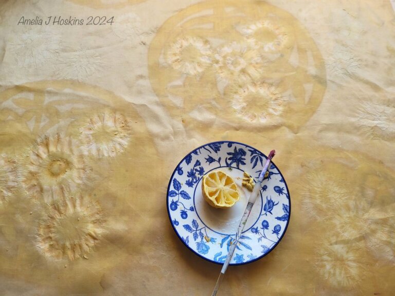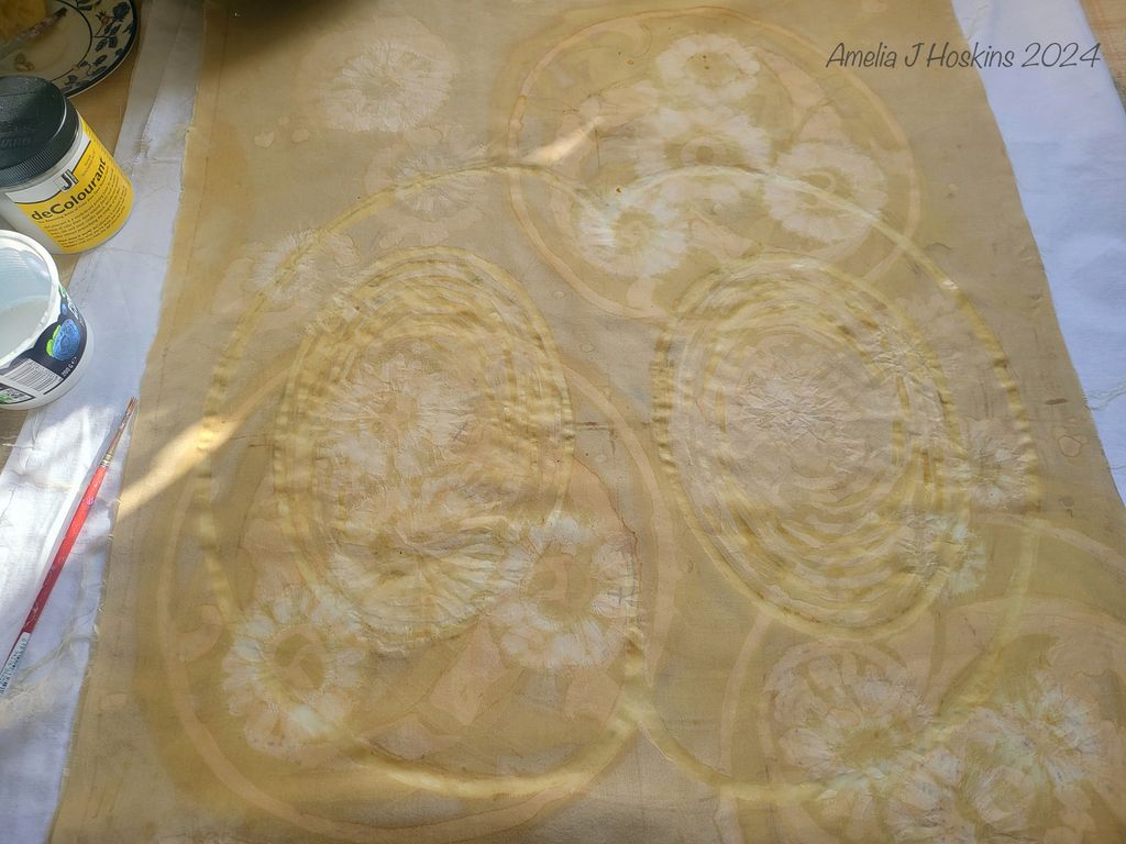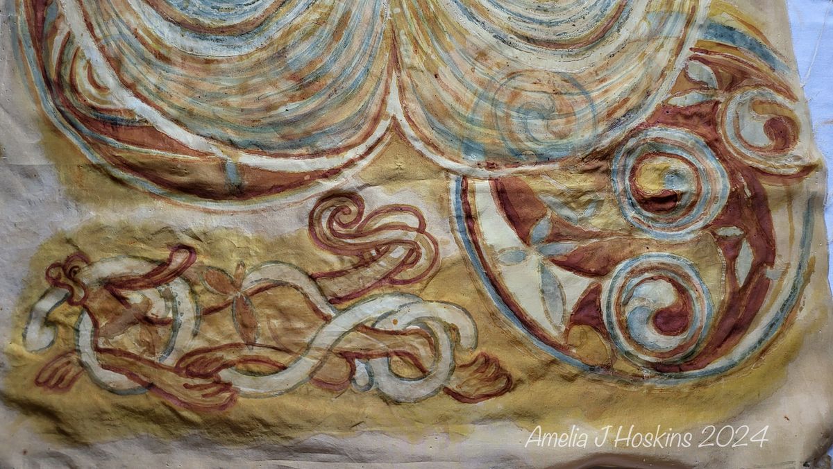 Inspirations from Hopi Pottery of birds and seeds, from which I amalgamated an abstracted design. The blue bird-like image was from a stylised maize shooting from seed. Hopi designs of birds and seeds had similarities of stylisation.