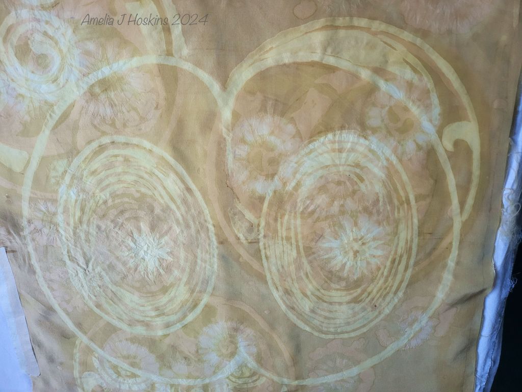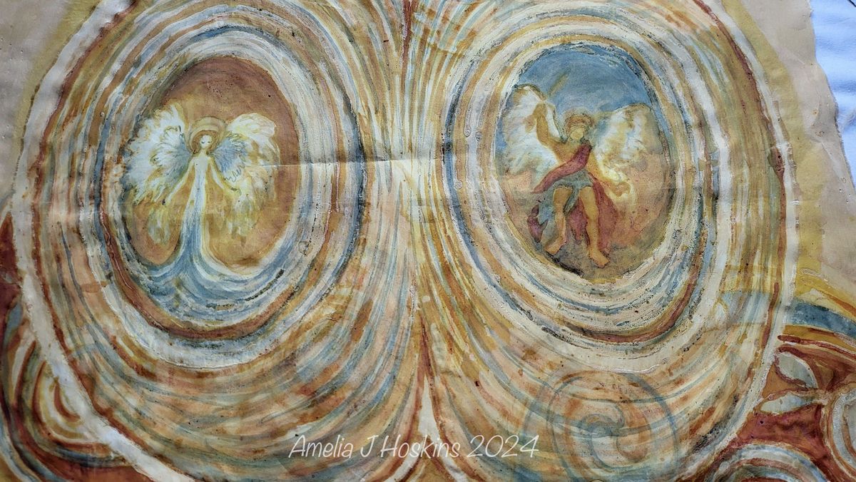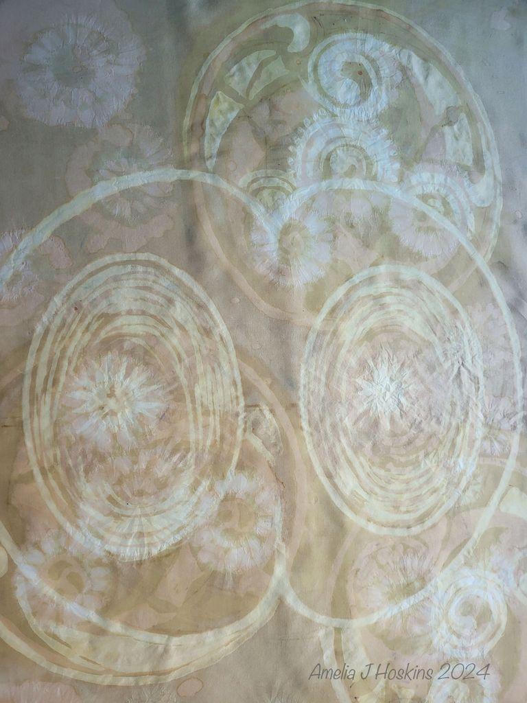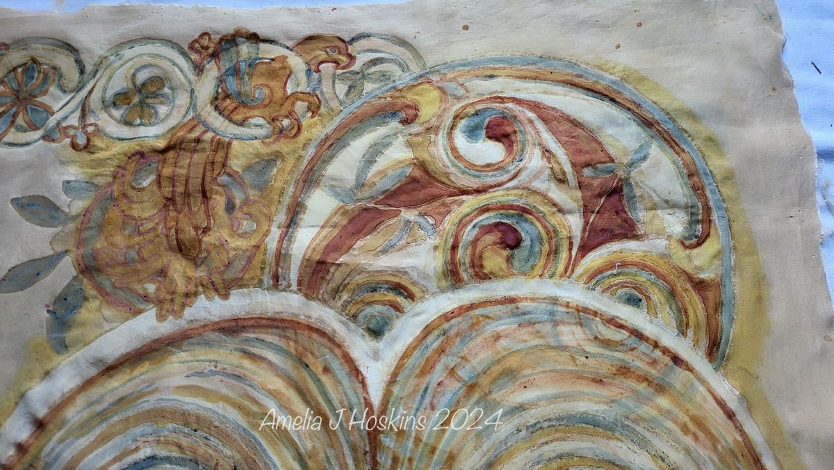 SILK PAINTING : Front middle panels on left and right sides. The silk painting was originally done independently, then blue coordinates were chosen from materials stock recently to create this garment.