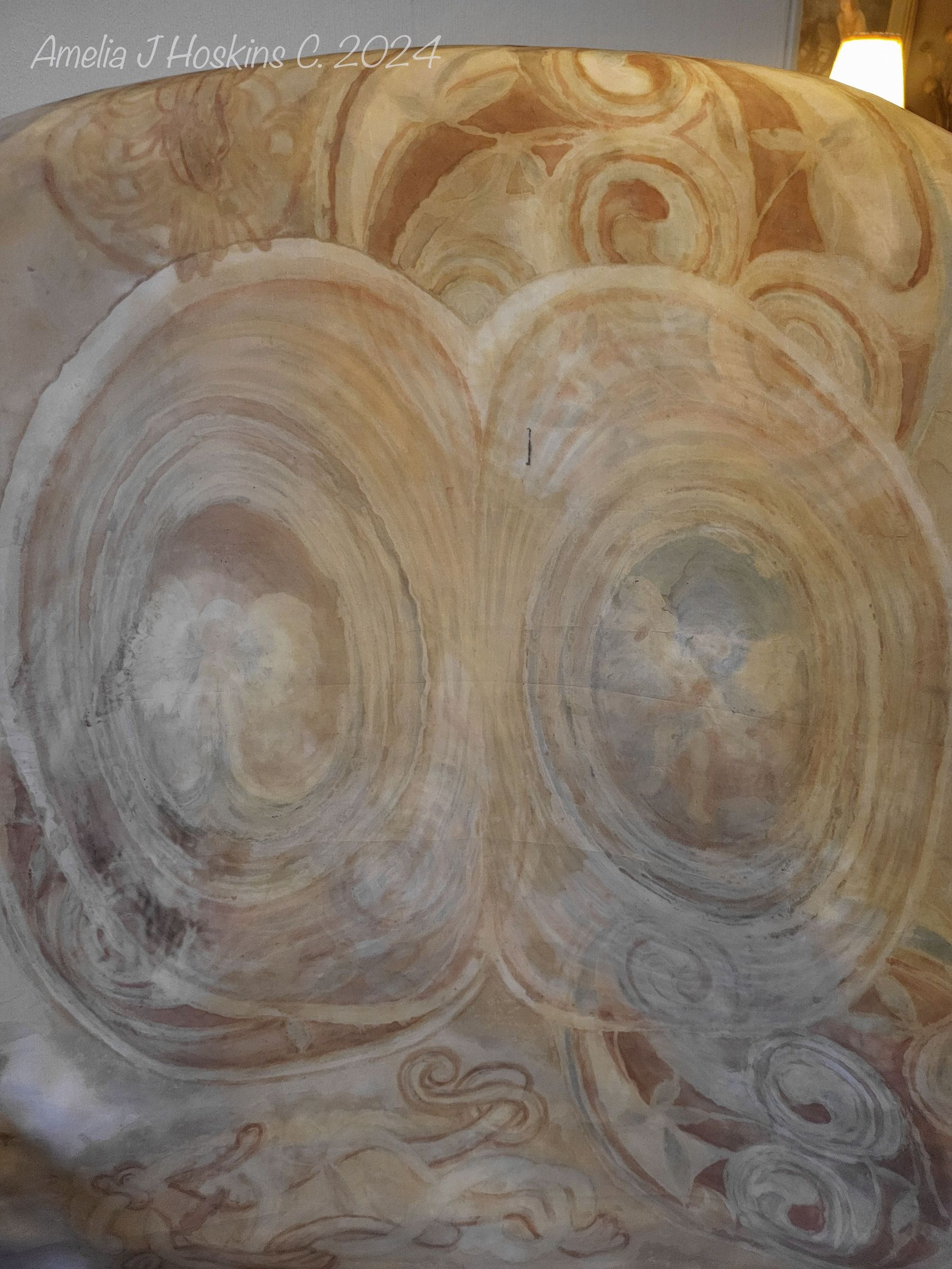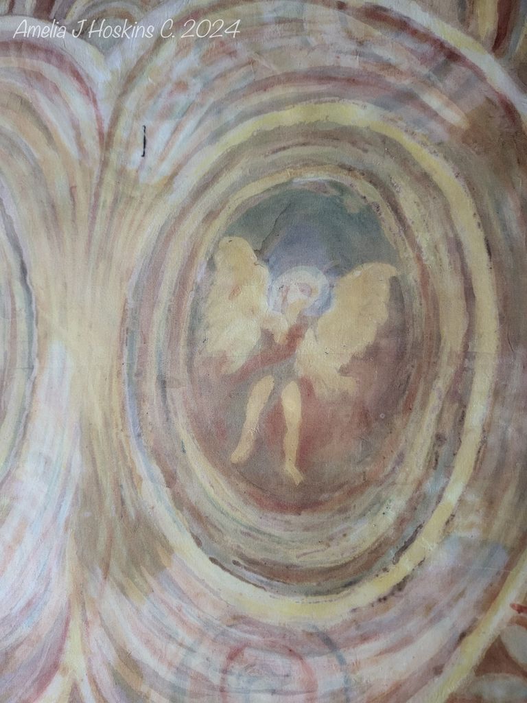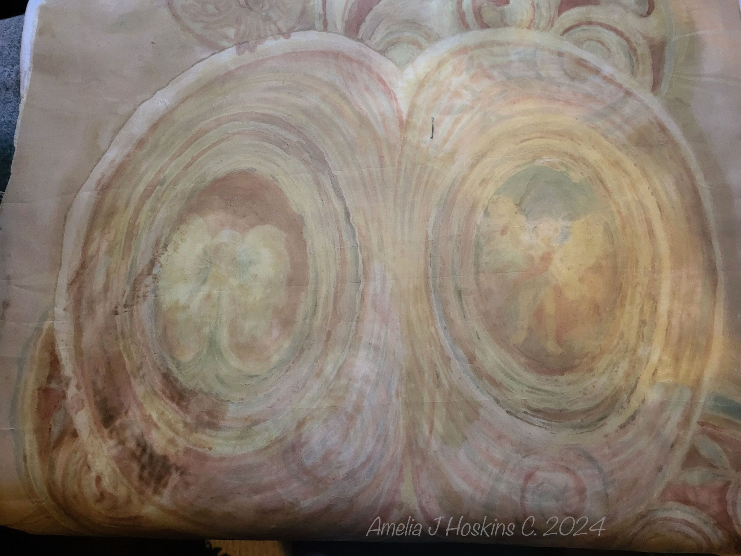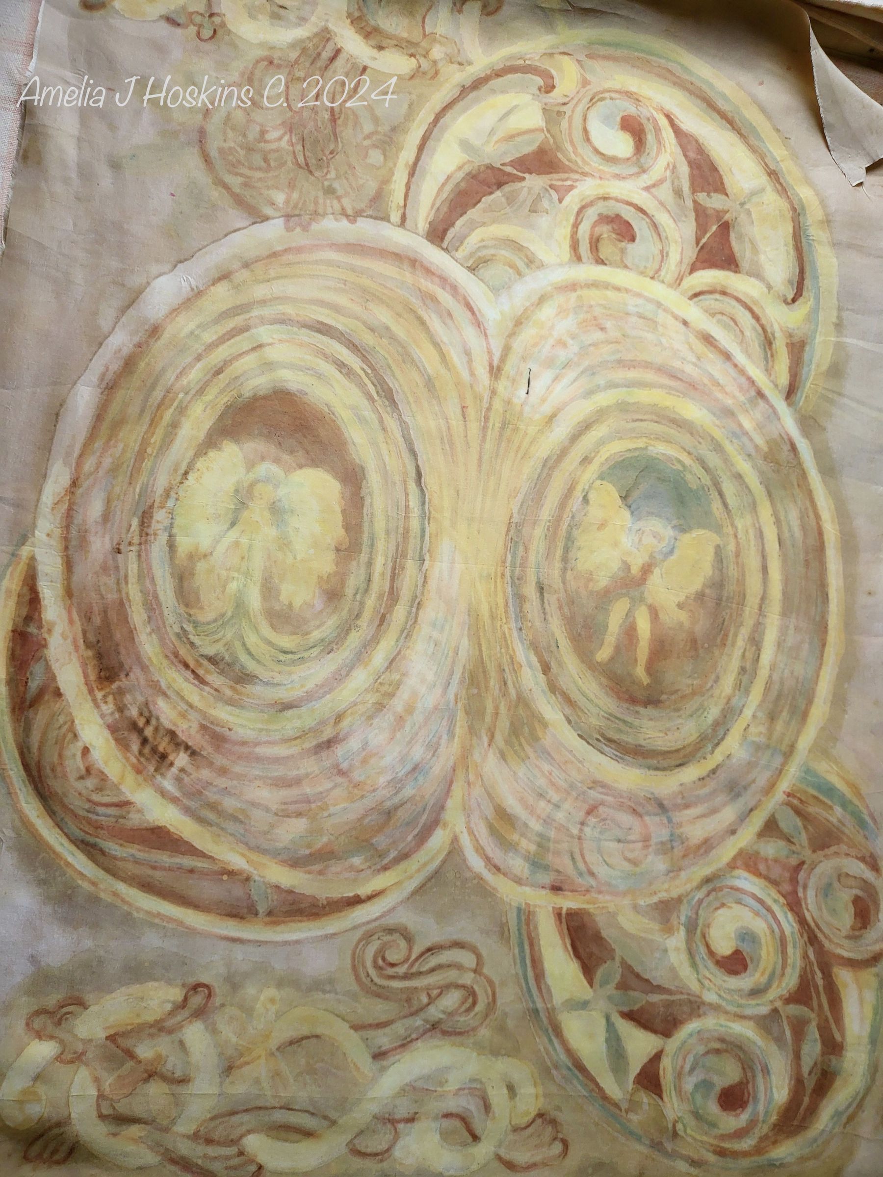 SILK PAINTING : Front middle panels on left and right sides. The silk painting was originally done independently, then blue coordinates were chosen from materials stock recently to create this garment.