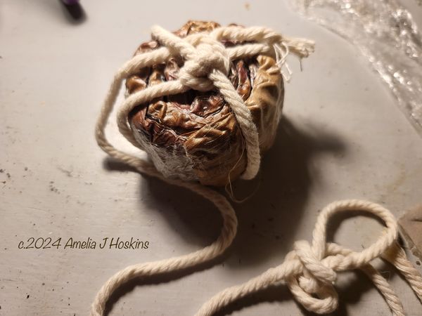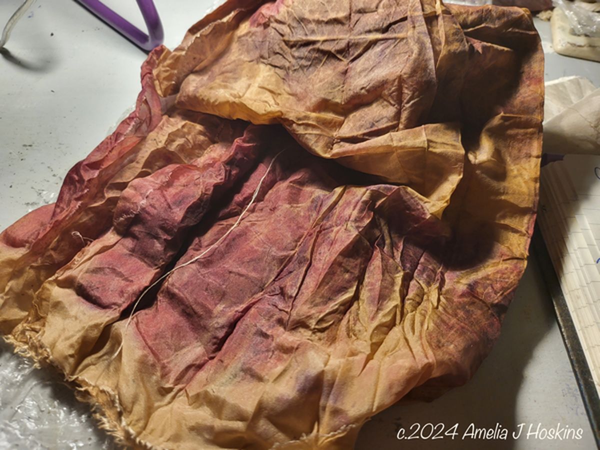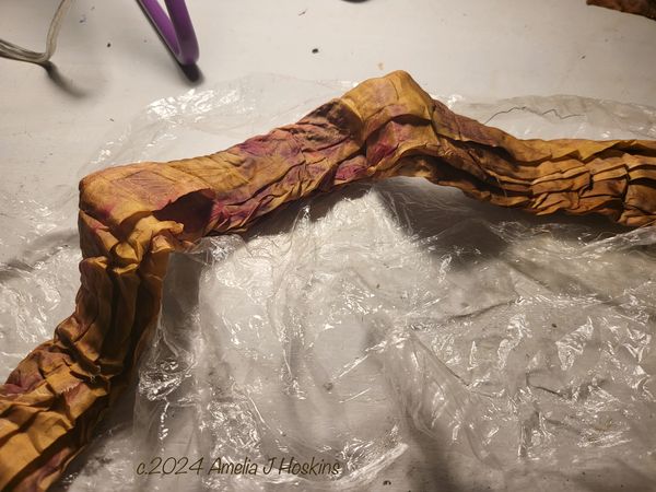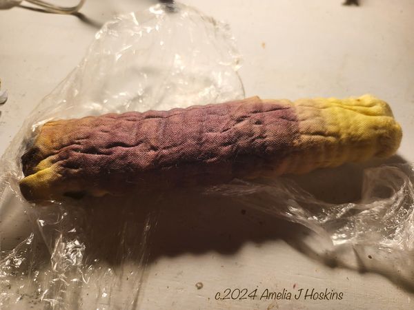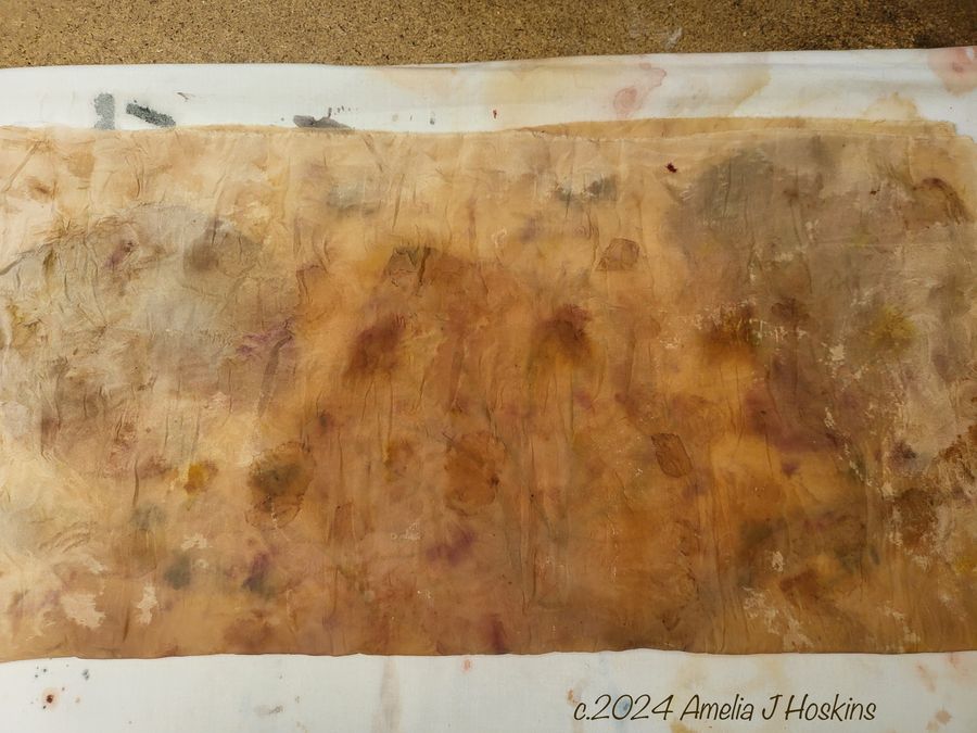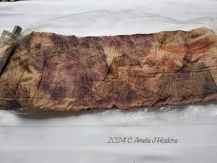 Another gold dyed sample with secondary purple-lilac leaf prints and grey Sumac leaf prints needs MORE enhanced colour...  One Catalpa crimson leaf and several Coreopsis Gazebo Red added.  Clingfilm laid and rollered over folded silk.  Bundle tied.  Steam 20 mins. [Note: Gazebo Red stated to produce sage green; but produced purple after alum + water mordant sprinkling, combined with tannins already in the previous dye colour.]