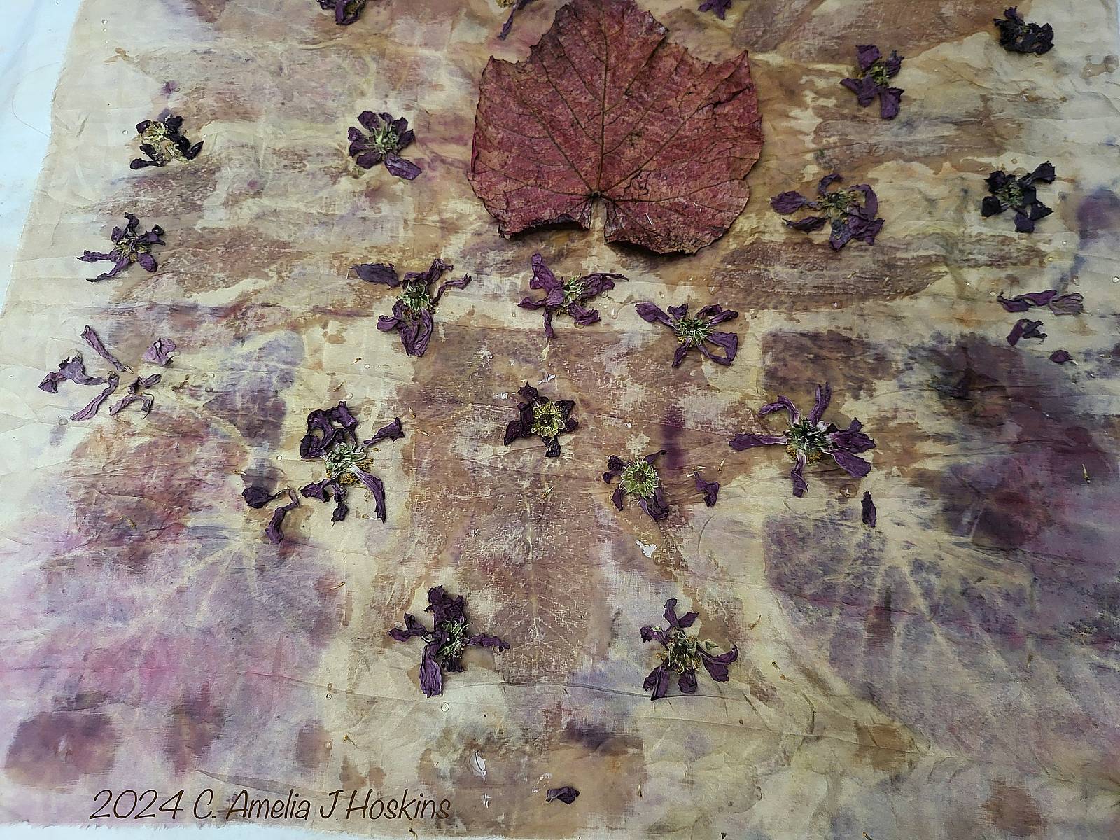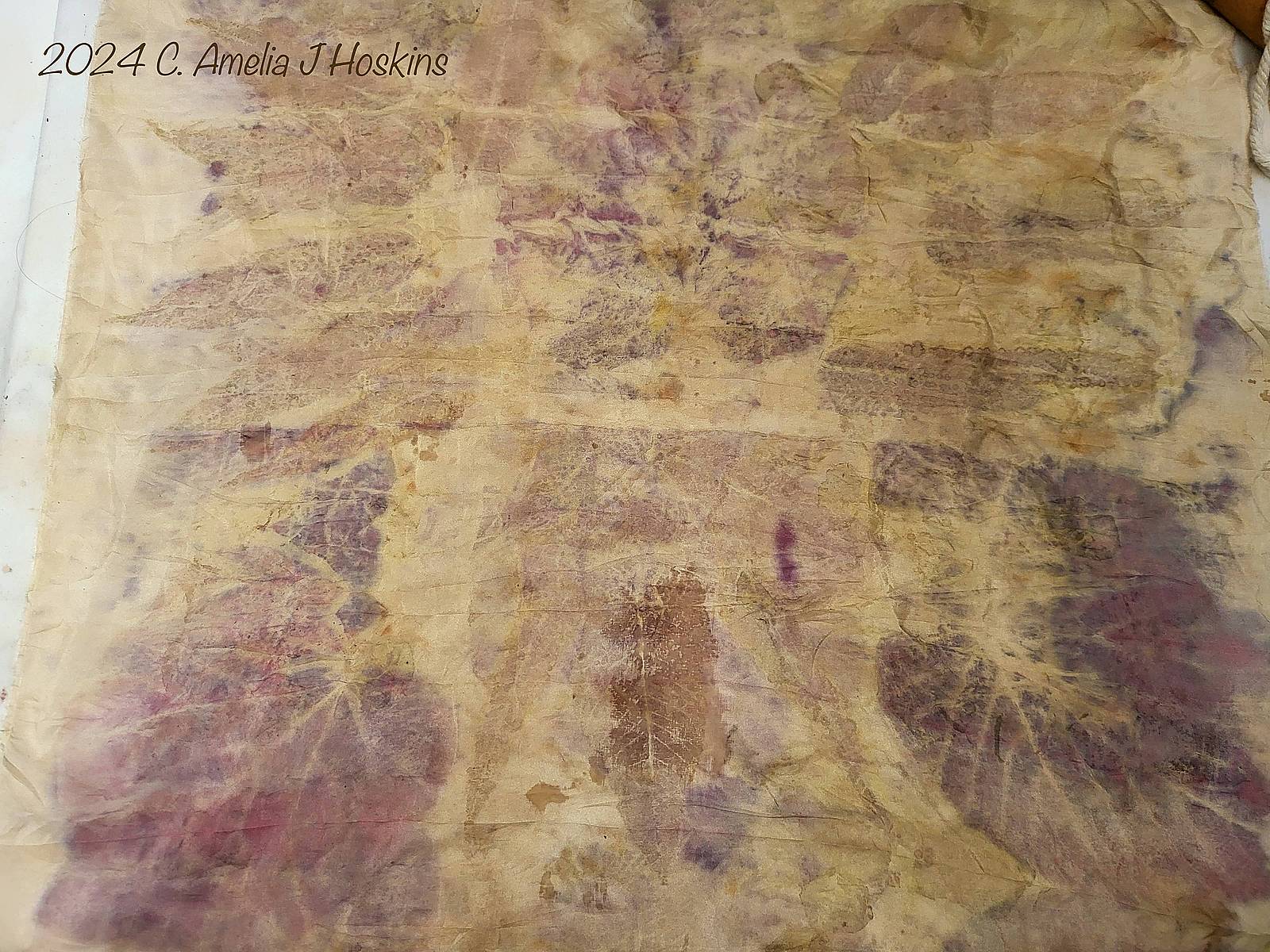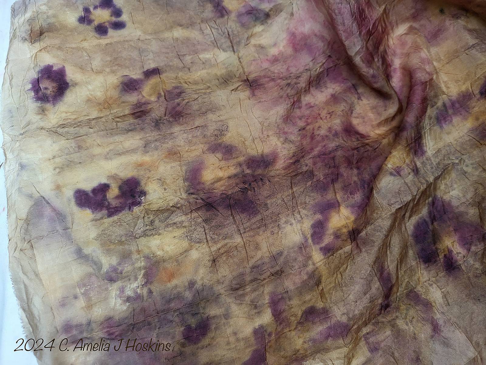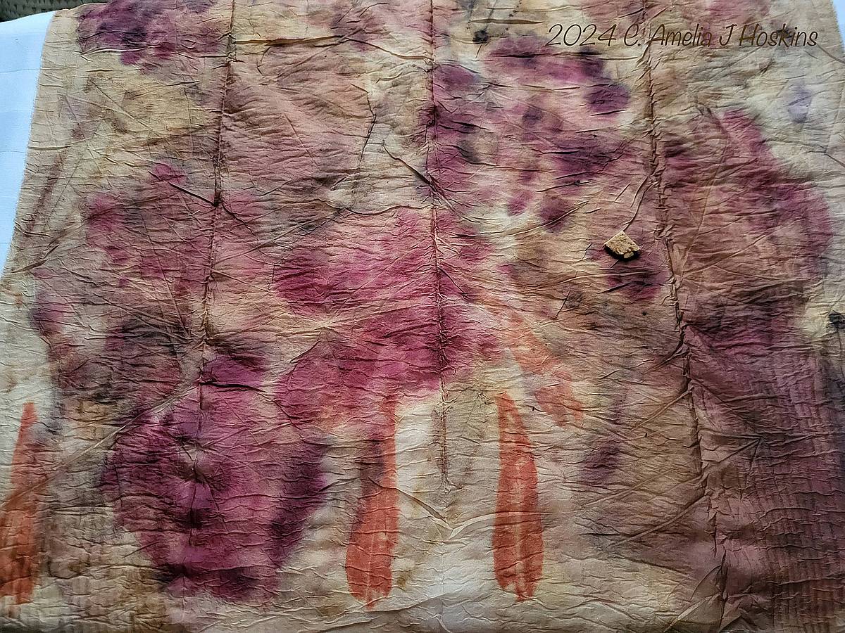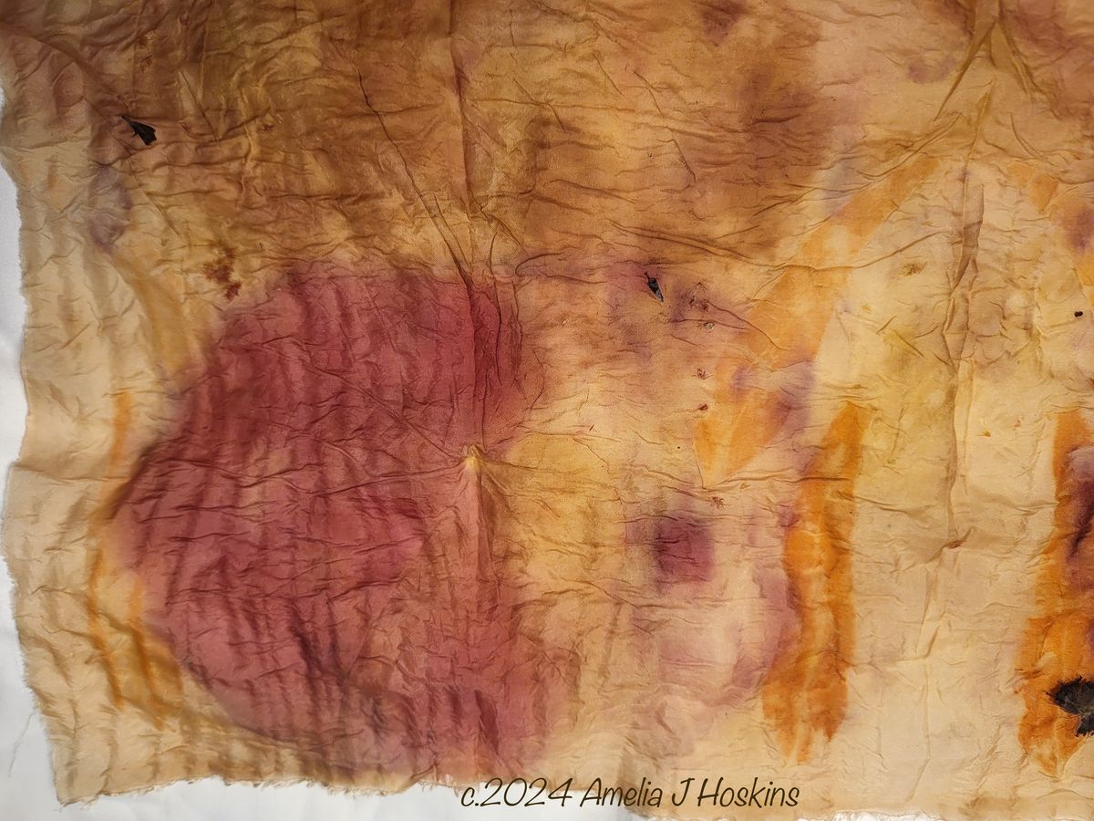 RESULT - Red leaves turn purple on silk and wool after washing out.   Acceptable - as in 2023 these leaves made silk a similar deep pink, then oxidized to silver.  At least they produced a print.   Some leaves partly faded lilac prints which gives an interesting 'ghostly' effect. (to be tried without background dye).  The iron and possibly the urine mordanting helped to give a stronger tone.  Coreopsis Roulette (dark violet spot) prints are darker than expected, as dried flower packet states 'Olive Green'.