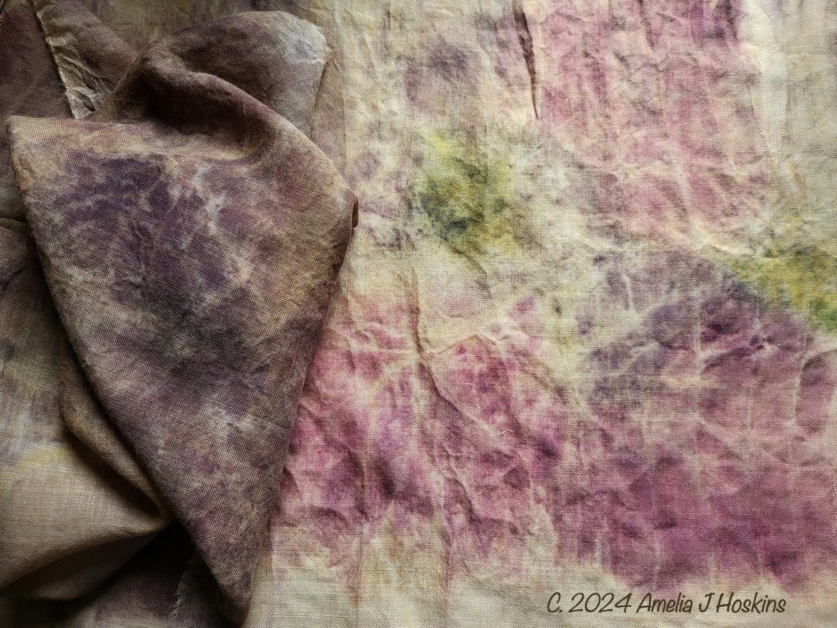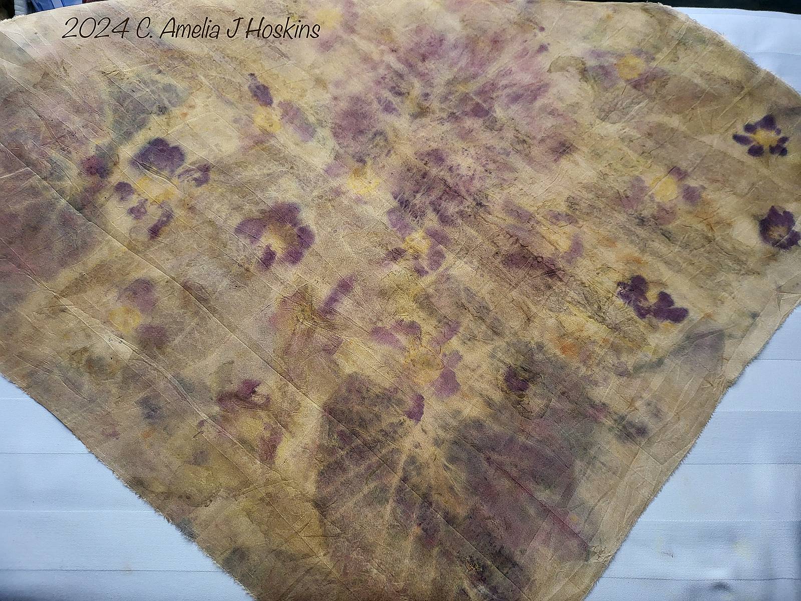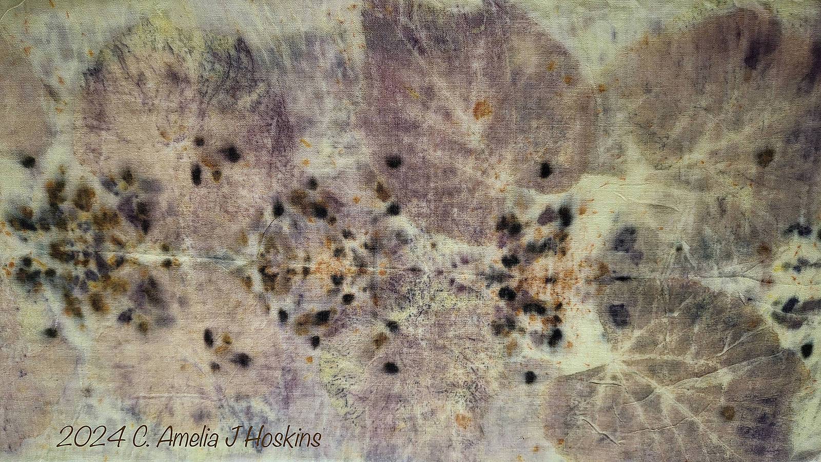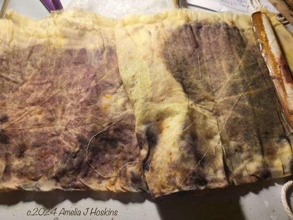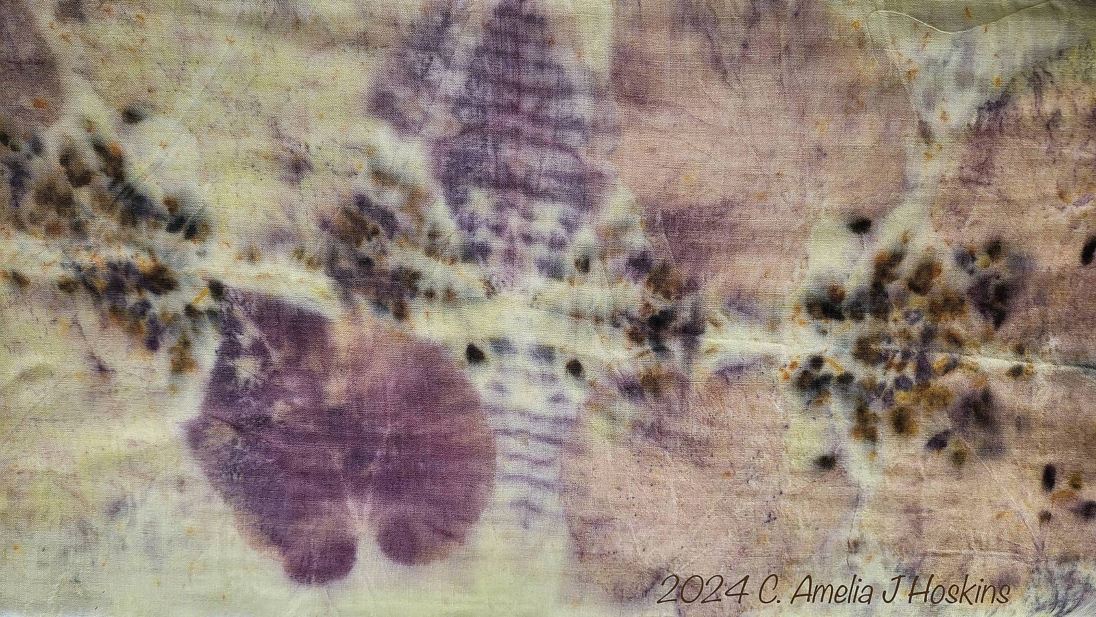 RESULT - Red leaves turn purple on silk and wool after washing out.   Acceptable - as in 2023 these leaves made silk a similar deep pink, then oxidized to silver.  At least they produced a print.   Some leaves partly faded lilac prints which gives an interesting 'ghostly' effect. (to be tried without background dye).  The iron and possibly the urine mordanting helped to give a stronger tone.  Coreopsis Roulette (dark violet spot) prints are darker than expected, as dried flower packet states 'Olive Green'.