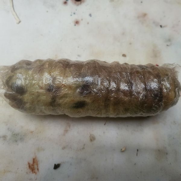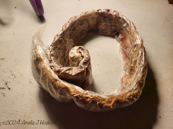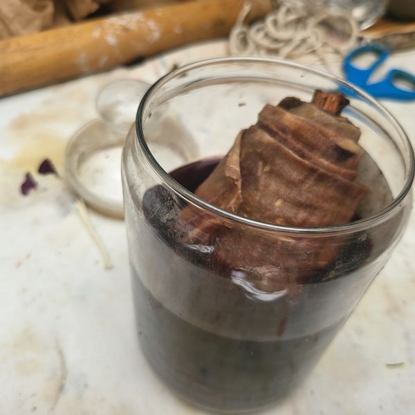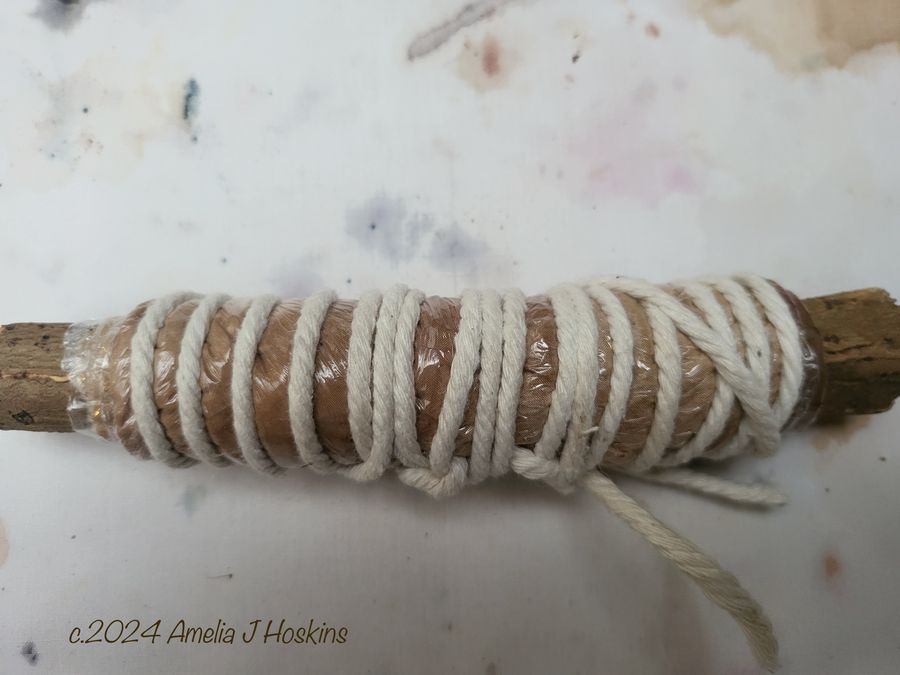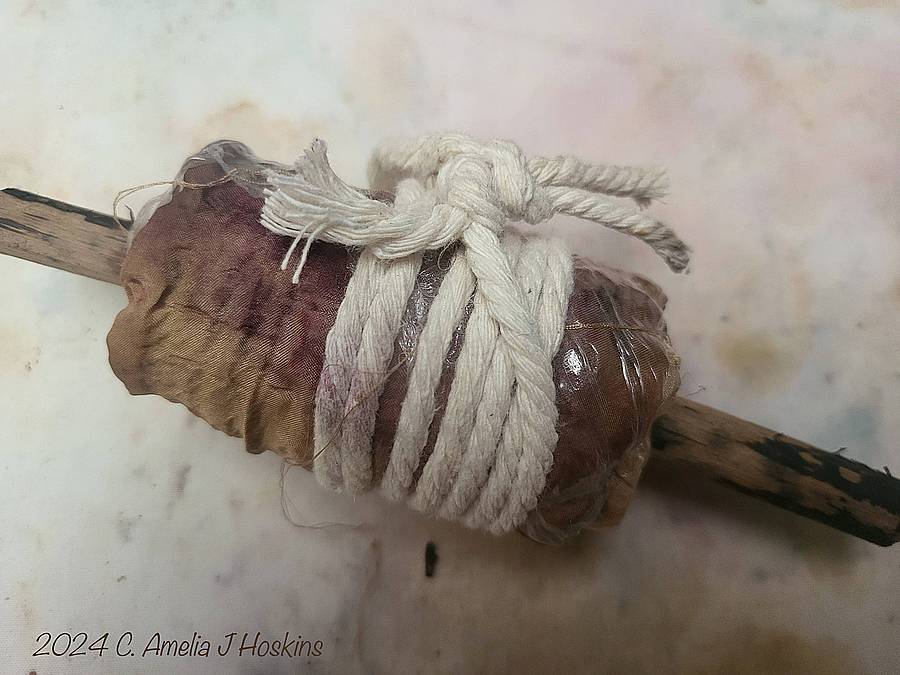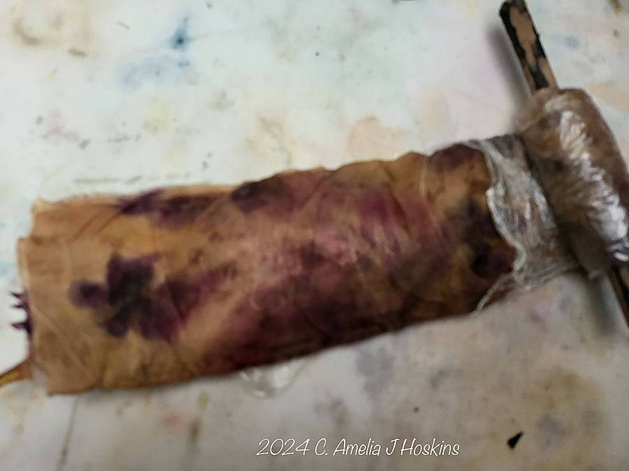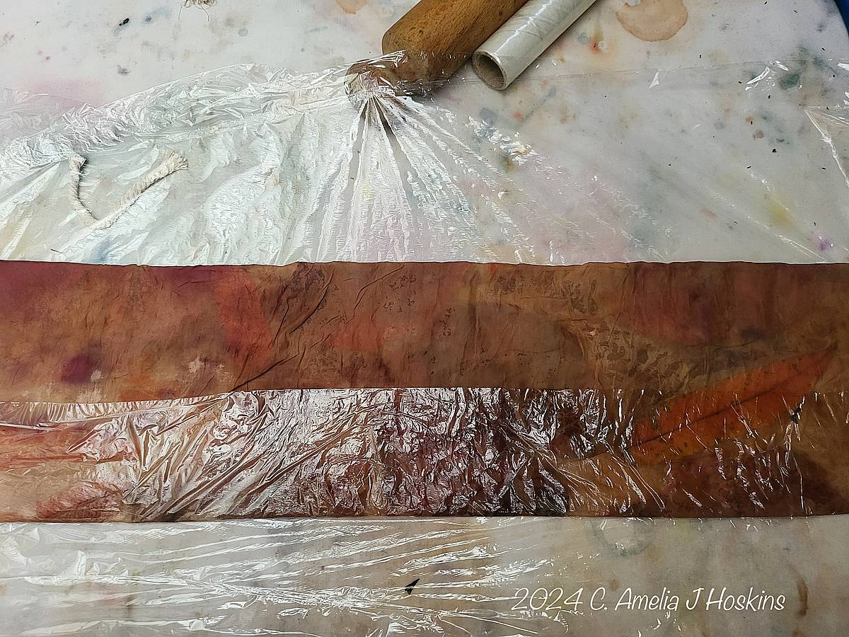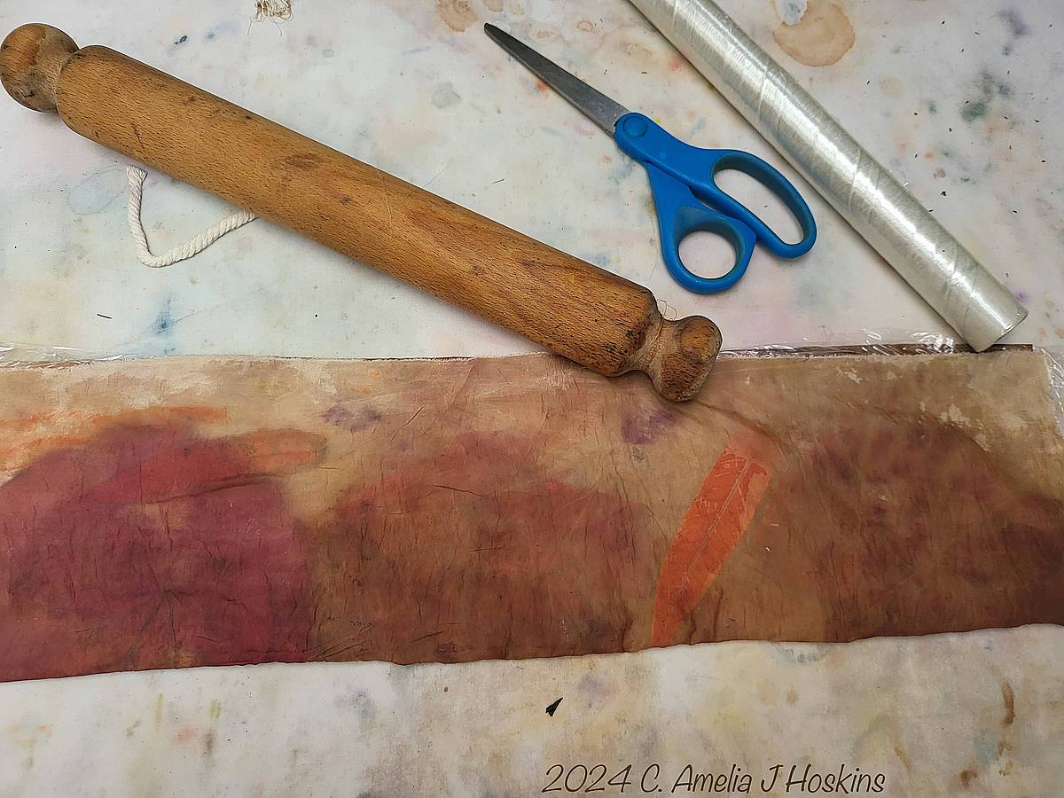 If silk looks a bit dry when folding into bundle, leafs are used to dab liquid over.  This aids ghostly effects where dampness is unevenly spread.  When cling film is wrapped around folded silk, air is squeezed out with rolling pin either end of folded bundle.  Folding lengths to a 4inch-6inch flat bundle, enables wrapping around stick, or swiss-rolling into itself, secured with string/piping cord.