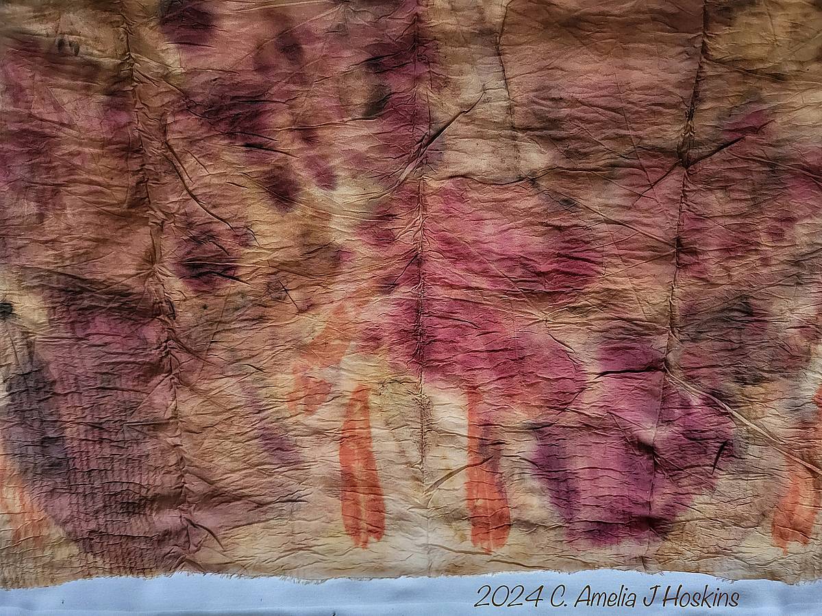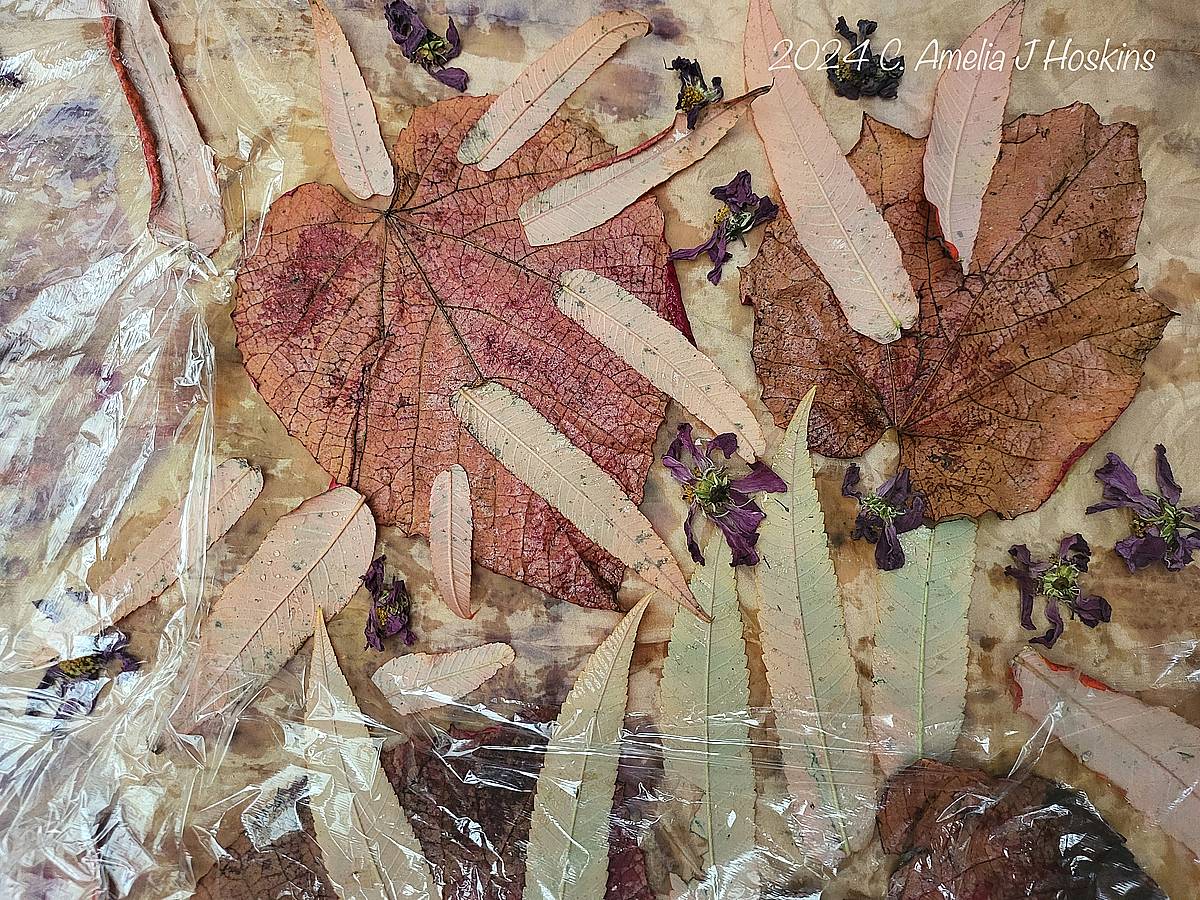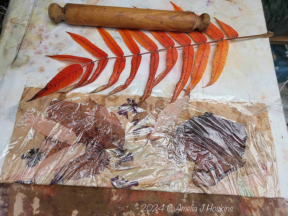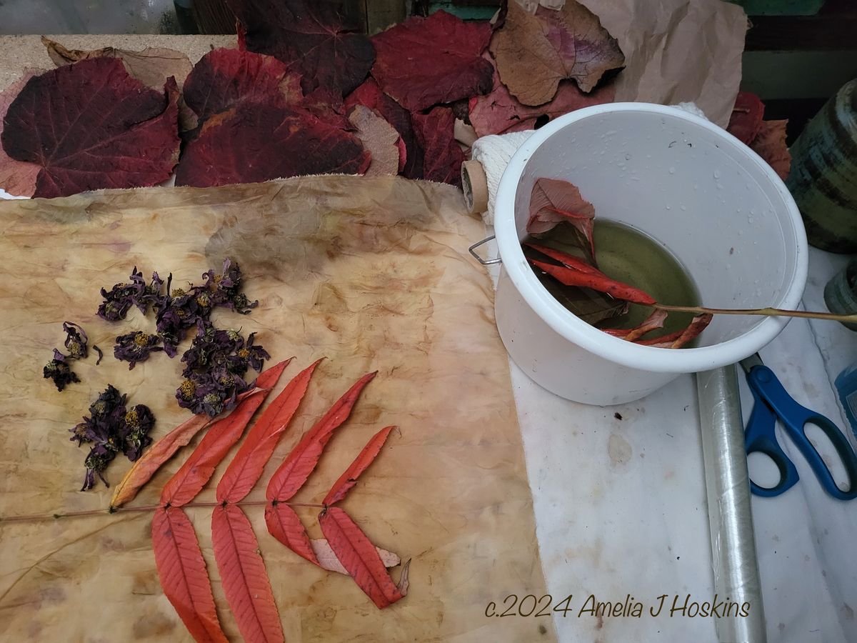 Extra Sumac leaves dipped in mordant liquid [alum water + rusty nail iron water + 2 dst sp urine].  Coreopsis Gazebo Red laced between leaves.
