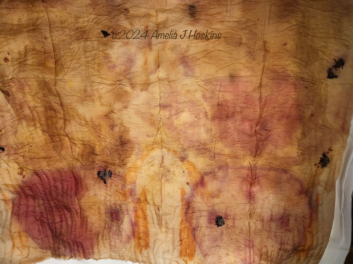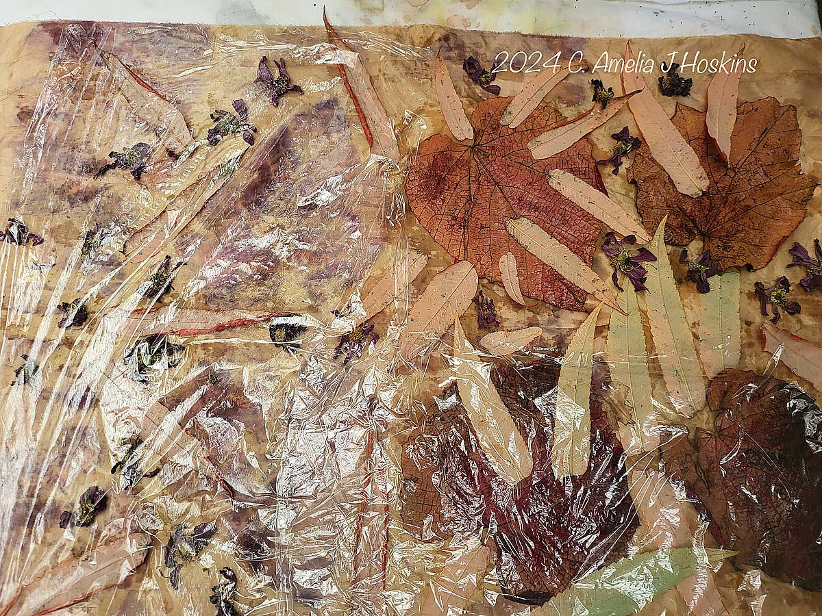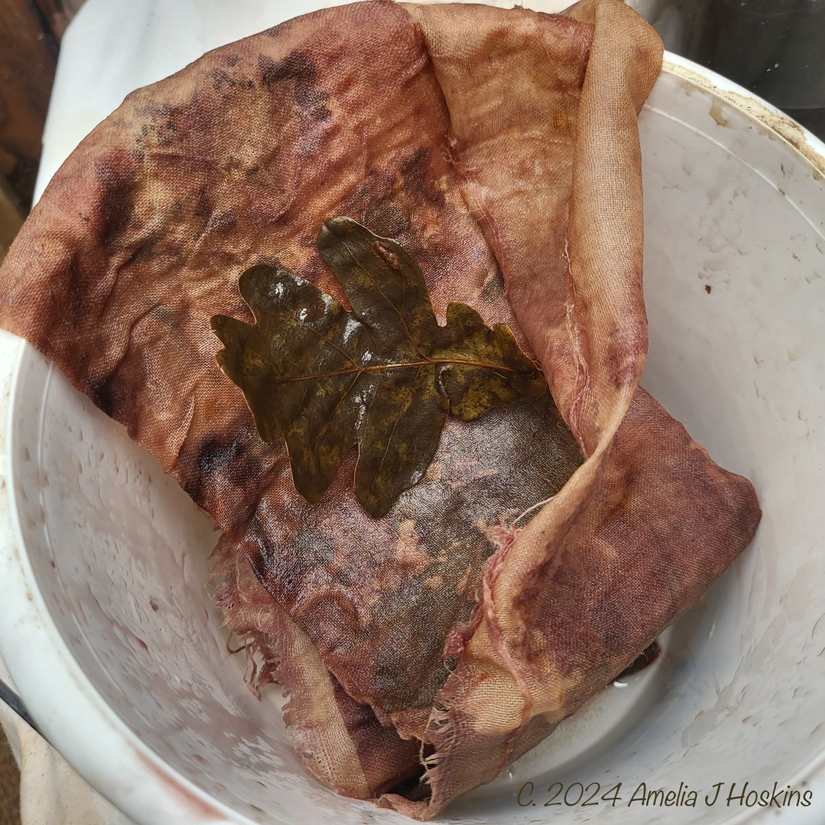 Extra Sumac leaves dipped in mordant liquid [alum water + rusty nail iron water + 2 dst sp urine].  Coreopsis Gazebo Red laced between leaves.