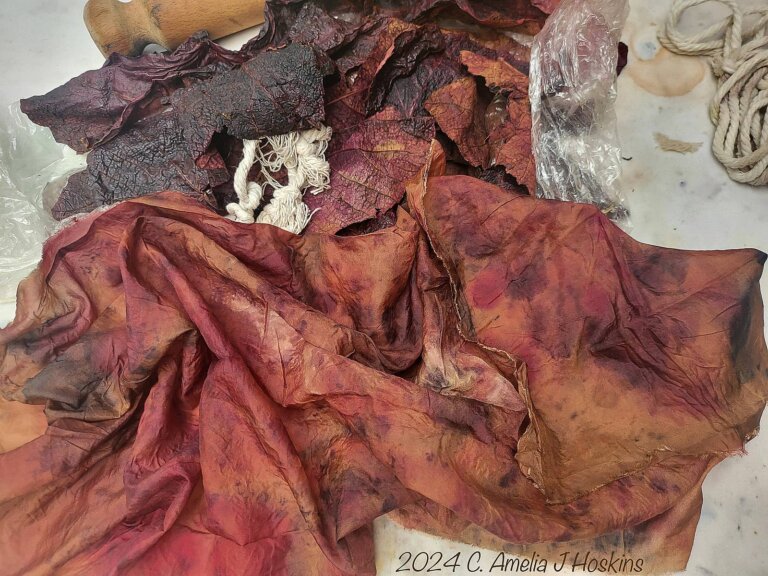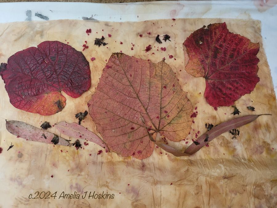 Habotai (1):   Tests to add more leaf prints to previously dyed habotai silk samples. Crimson vine dye bath gave pink silk in 2023, then oxidized to silver This year testing red leaves with eco printing, rather than immersion dyeing, for better result of colour preservation.
