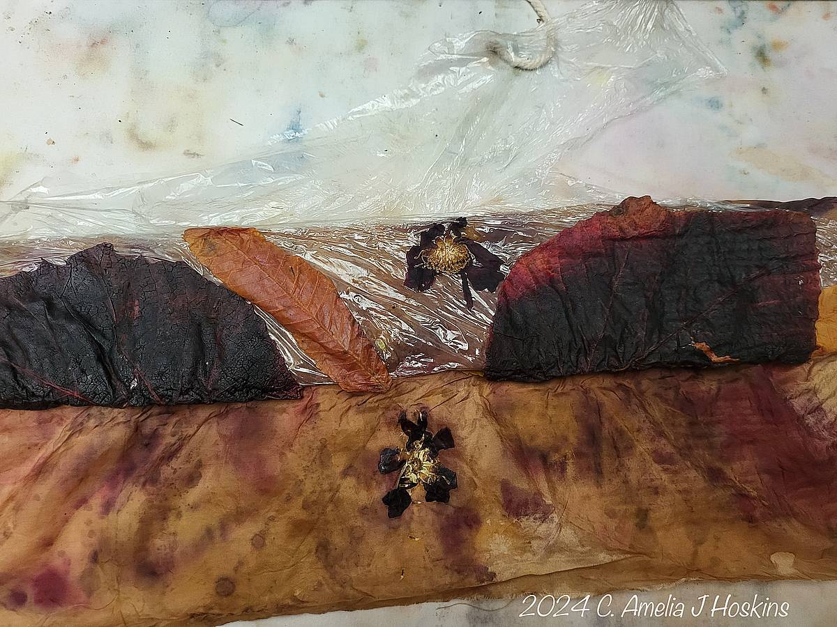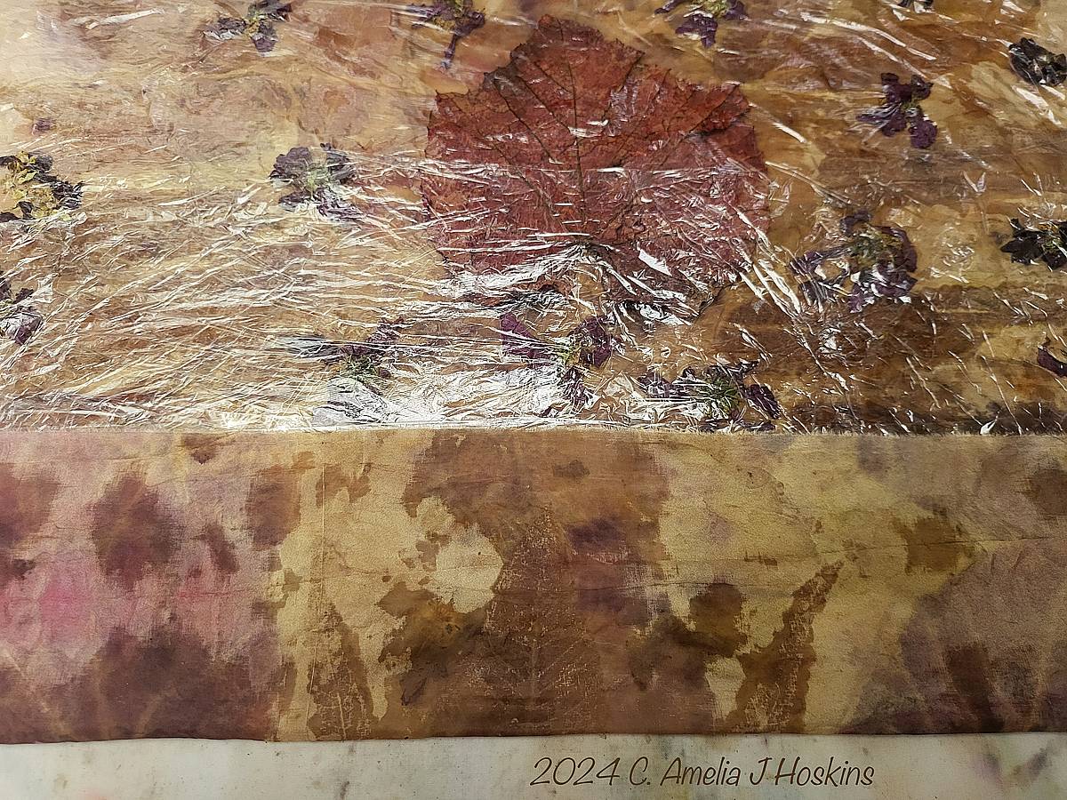 Silk folded up from bottom and over top layout - for a mirrored print result.  Leaves area sponged with urine as experiment to retain red pigment. (previously dyed and eco printed silk has already been alum mordanted, which may help new prints)  Bundle prepared for steaming.