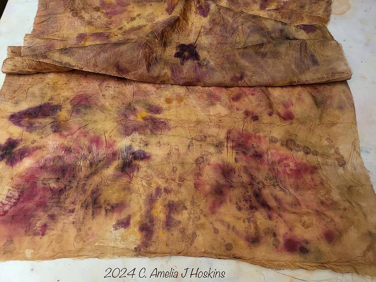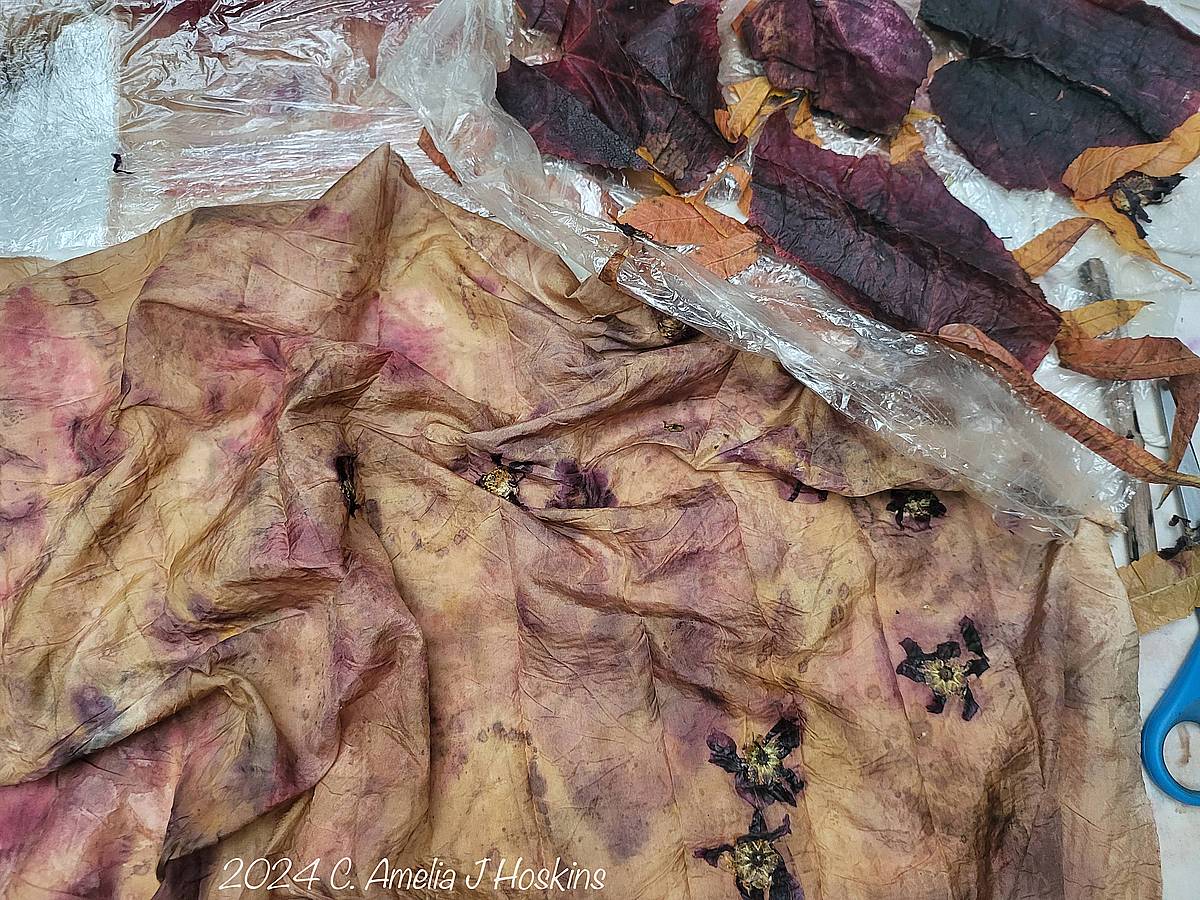 Using Catalpa to enhance previously dyed silks: Steamed Red Catalpa leaves, Eucalyptus leaves, with sprinkled Amaranth flowers and Black Knight Scabious flower petals.