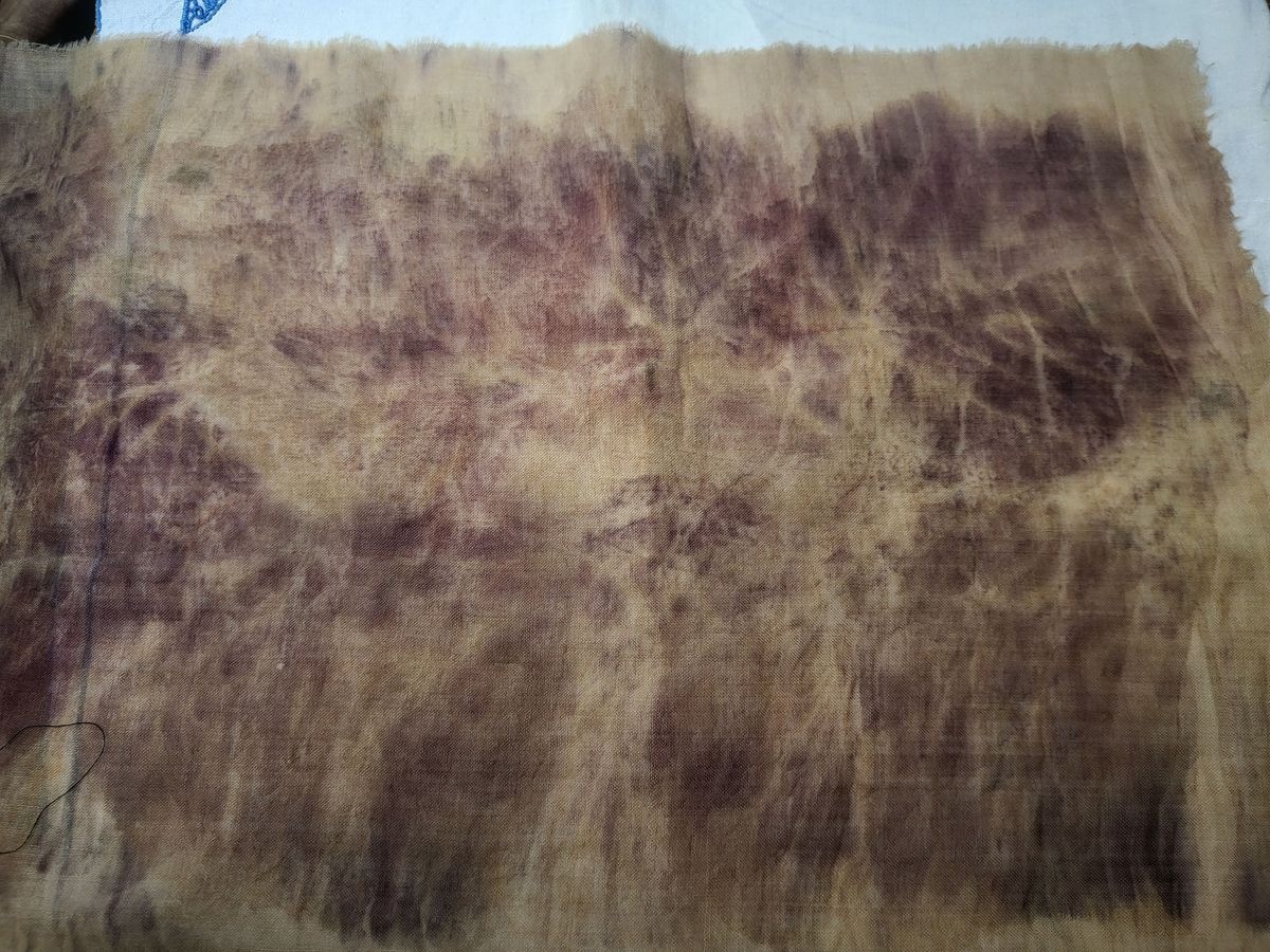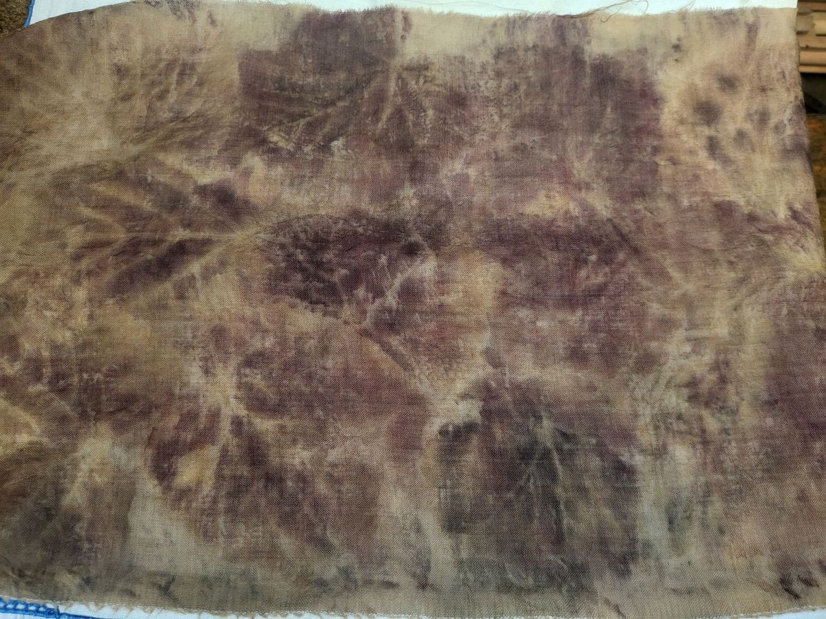 Crimson Catalpa leaves - Experiment on Fine Wool scarf (1). Fine wool previously dyed in comfrey.  Red leaves and small petals from Coreopsis Roulette (result violet-black).