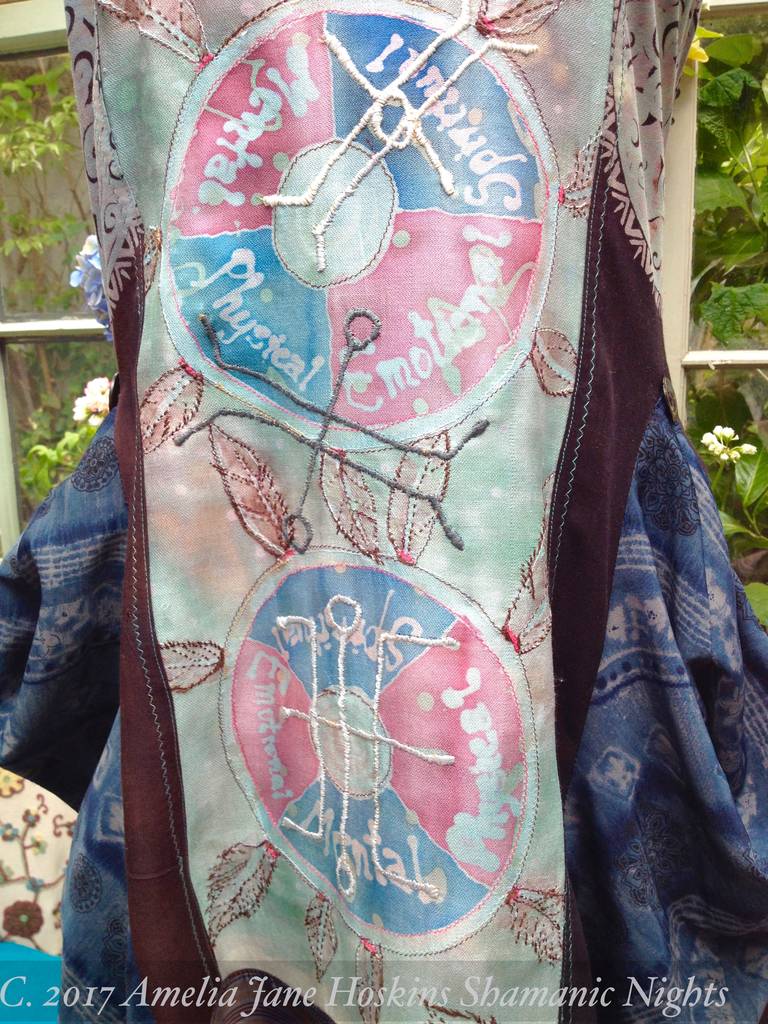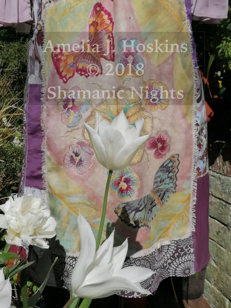 SILK background is first hand dyed from plants.  Painted designs, colour coordinated to patchwork prints, add to the uniqueness of each garment.