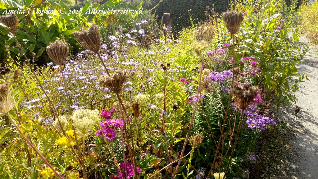 Patchworks are somewhat like an area of mixed flowers.  Asters and seed heads photo from Eden Project  quarry garden in September.  More floral photographs are on author's photography site in Floral Galleries Resonant Visions