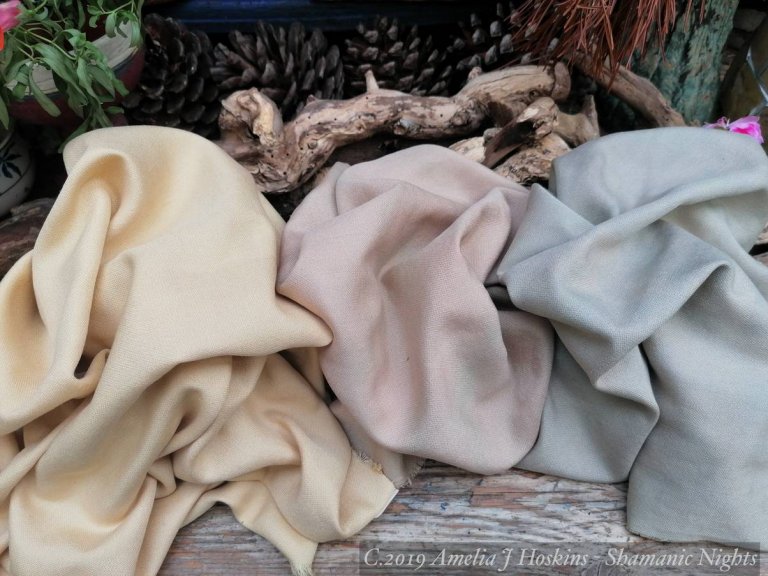 Many shades of gold and cream silk backgrounds are achieved with natural plant, seed and bark dyes: from author's own wild foraging and woad growing. Use 'Search' for plants: e.g. 'comfrey' 'hawthorn' etc for author's plant dye processes experimented with so far: one for example with walnuts.