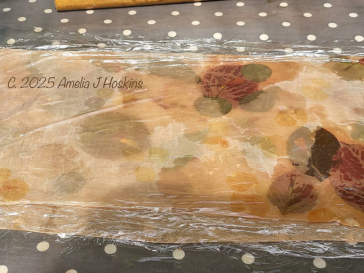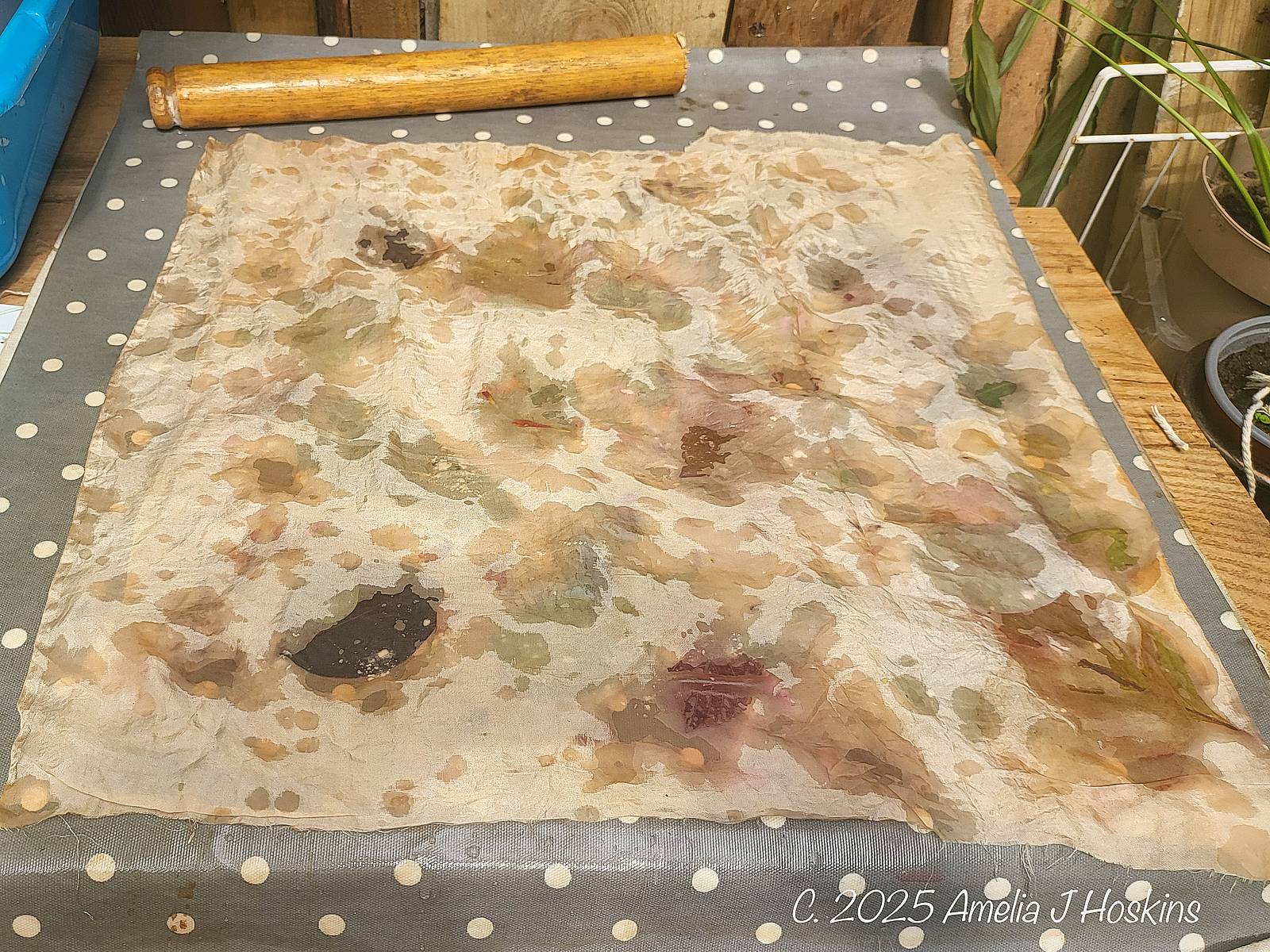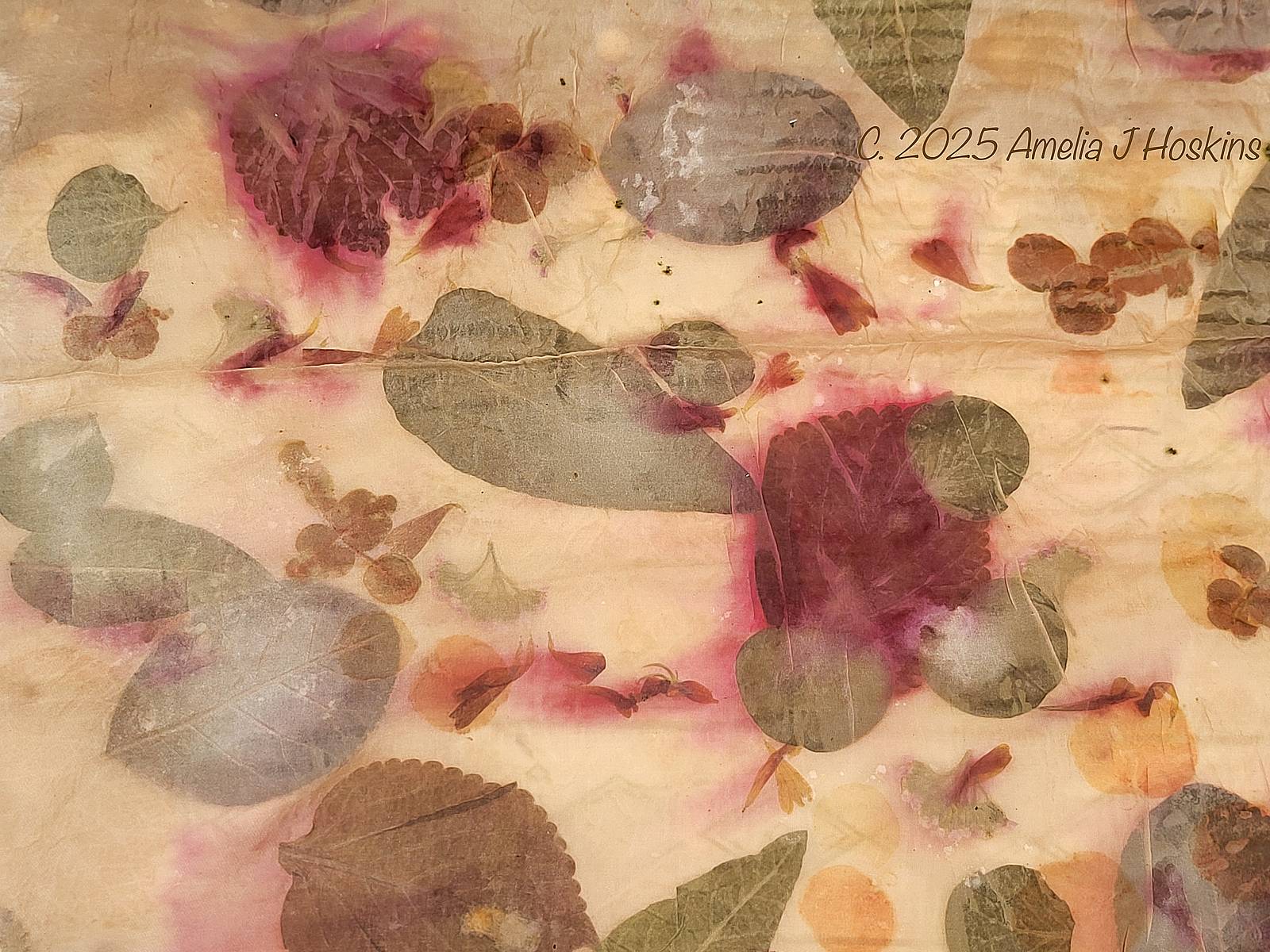 Experimental piece to check steamed result of eucalyptus leaves: Small round eucalyptus leaves result orange. Long pointed eucalyptus leaves green. Coleus leaves light purple pink.  Pleasing pastel result which can be added to.