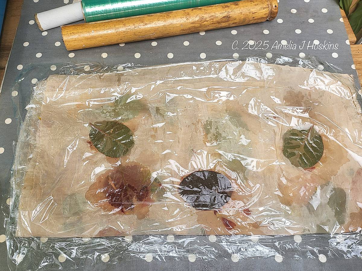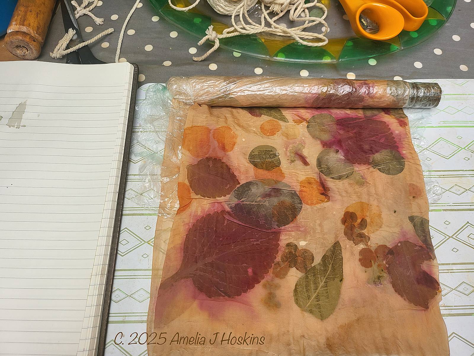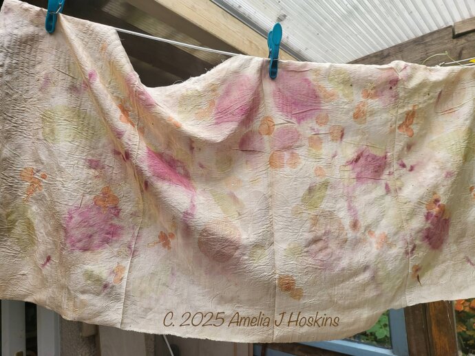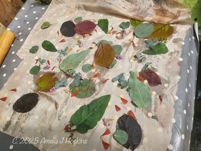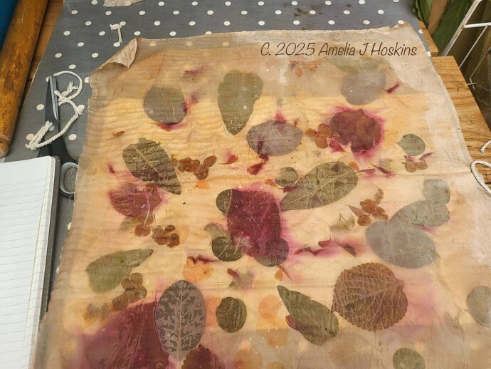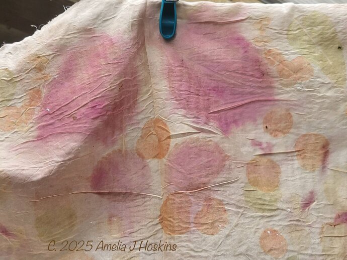 Experimental piece to check steamed result of eucalyptus leaves: Small round eucalyptus leaves result orange. Long pointed eucalyptus leaves green. Coleus leaves light purple pink.  Pleasing pastel result which can be added to.